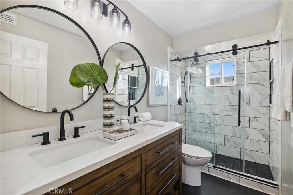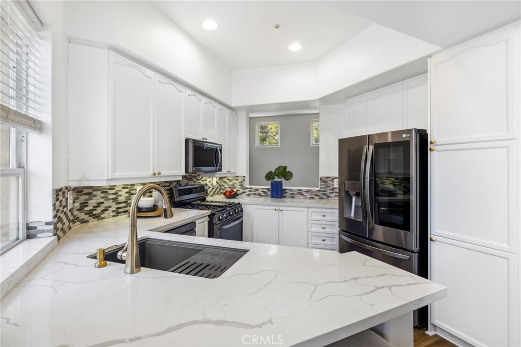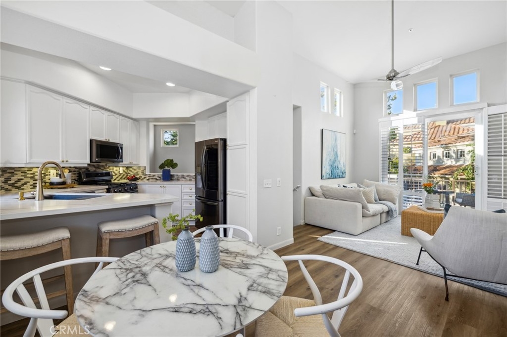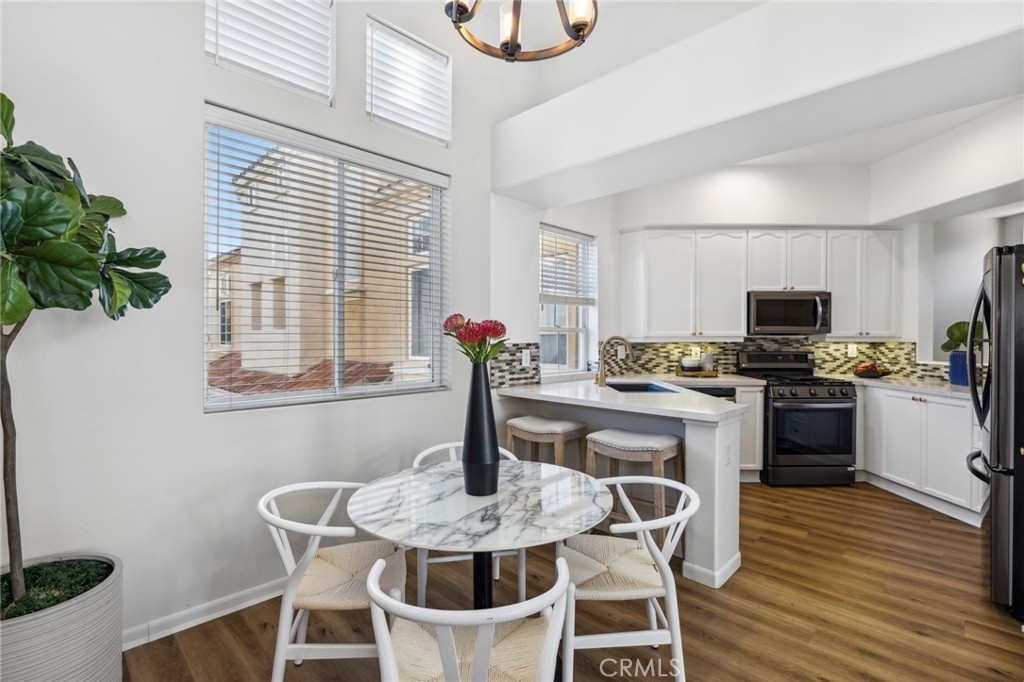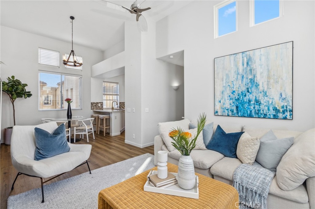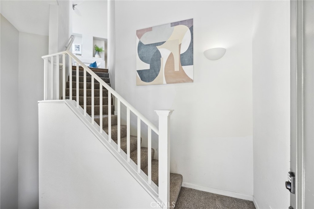 Located in the heart of Rancho Santa Margarita, Corte Melina community is OC's living @ its best! Stunning 2 bedroom, 2 bath home, w/direct garage access & close to plenty of shopping, dining & entertainment. Oversized, single car garage w/newly added storage, provides direct access into your new home; leading you directly into the convenient laundry room loaded w/ample cabinets & storage space. Glide up the stairs into the main living area and appreciate how open, light & bright the surroundings are! Timeless Plantation Shutters & private balcony is great for BBQ's & morning coffee. The kitchen & dining room offer plenty of space where natural light pours in from every window, highlighting the vaulted ceilings. The kitchen includes stainless steel appliances, quartz counter tops & plenty of room to prepare gourmet meals. The large guest bedroom & full guest bathroom are just down the hall offering fantastic privacy for an office or guests. The generously sized primary bedroom is located on the next level; complimented by a remodeled bathroom w/ updated vanity, newer fixtures, newer mirrors, newer lighting & custom shower which offers maximum privacy & style. Additional upgrades include designer, vinyl plank flooring, updated baseboards, updated ceiling fans, Ring door camera, custom shiplap wall, newer kitchen appliances & fresh paint throughout. Corte Melina community offers its residents a sparkling pool, spa & fitness center. Rancho Santa Margarita community amenities include 13 community parks, 4 pools, The Beach Club Lagoon, the Lago Santa Margarita, 9 trails, sports fields, courts and picnic covers. With excellent schools & easy access to all of Orange County's freeways & toll roads, it's impossible to find a better value in a more welcoming neighborhood.