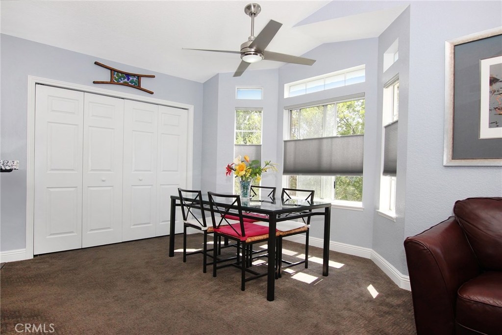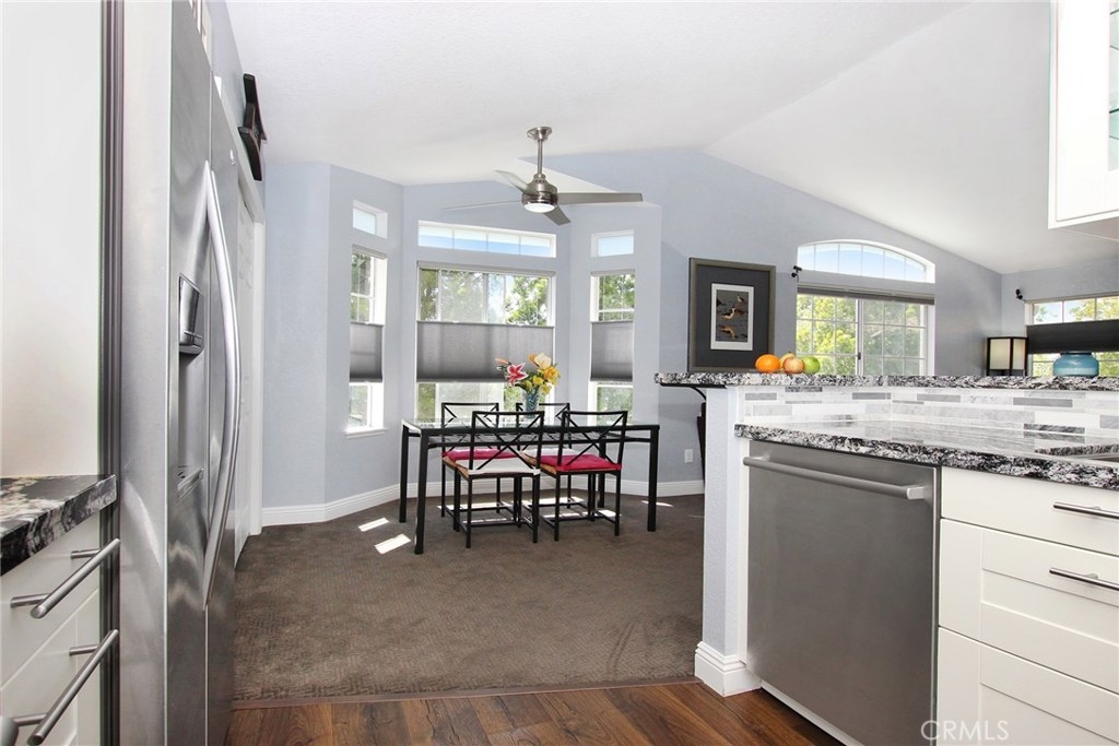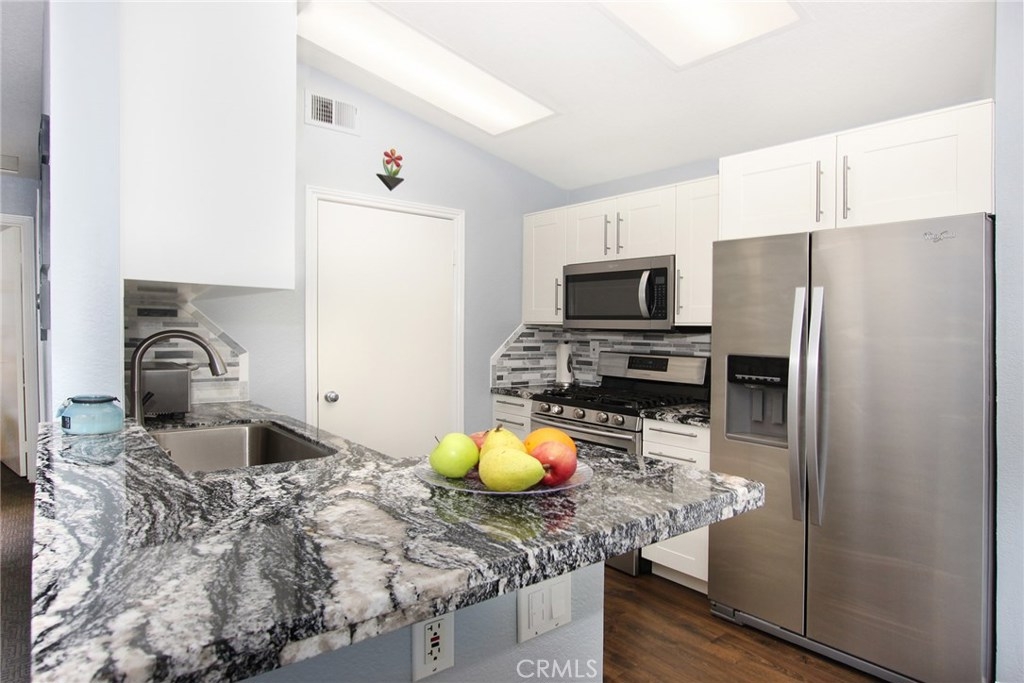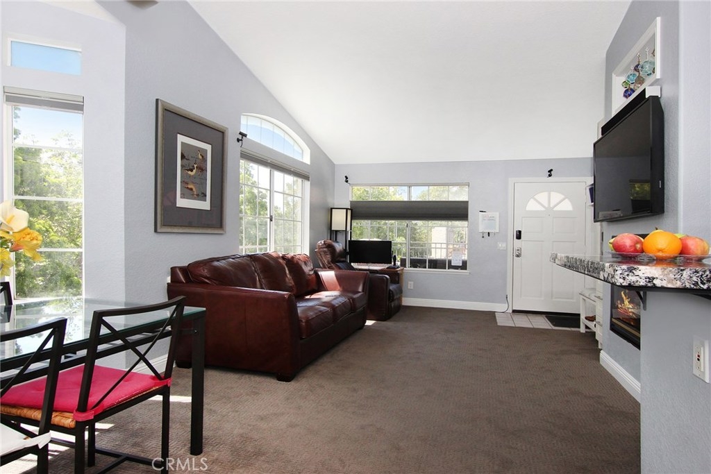Charming 2 Bedroom, 2 Bath upstairs corner condo, (giving added privacy) also featuring a roomy front balcony with space for dining or relaxing and where you can enjoy a cool breeze and views of trees. The Interior of the home has new carpet/paint and natural lighting with many windows and vaulted ceilings enhancing the feeling of a much larger home; The spacious living & dining room is great for entertaining; the dining nook has a bay window & serene views of trees. The kitchen is galley style with new appliances including matching refrigerator and dishwasher, the kitchen is open to the dining & living area and has new granite counter top and new cabinets. The master bedroom is large with vaulted ceiling with private full bath and double sinks. 2nd bedroom is setup for your baby or child or den/office. All rooms have new day/night window coverings. Flat screen TV with sound and night bar over the fireplace remain. Conveniently located within walking distance to shopping, restaurants, schools, trails and the lake. Fantastic community pool and spa, plus a tot lot! adjacent to a park, picnic tables; barbecues; basketball courts; tennis courts; Homeowners enjoy a membership to the Santa Margarita Lake Beach Club, featuring swim beach; paddle boats; fishing and just a short walk to local shops and restaurants. Award winning elementary and middle schools. Close to transportation (241) and public transportation close by.
