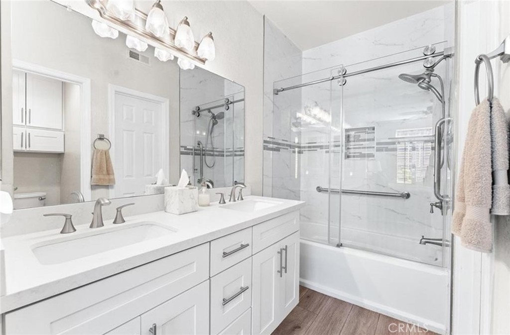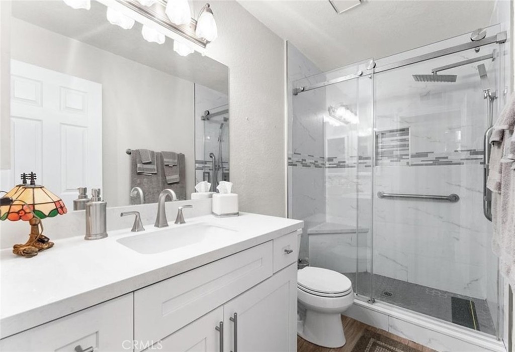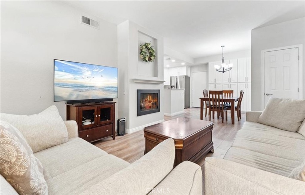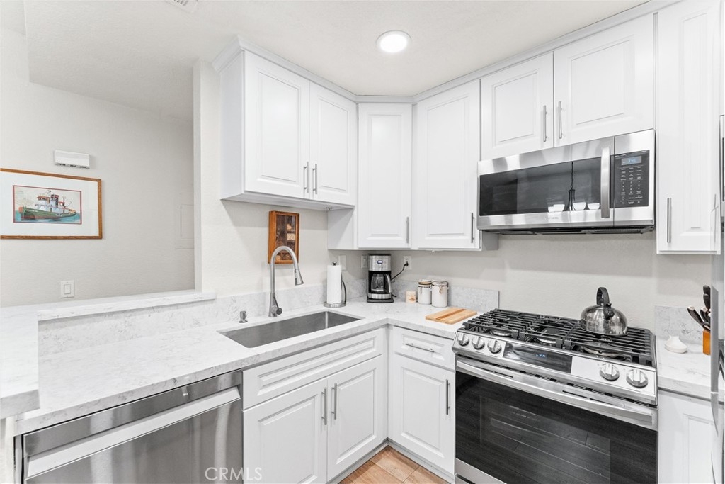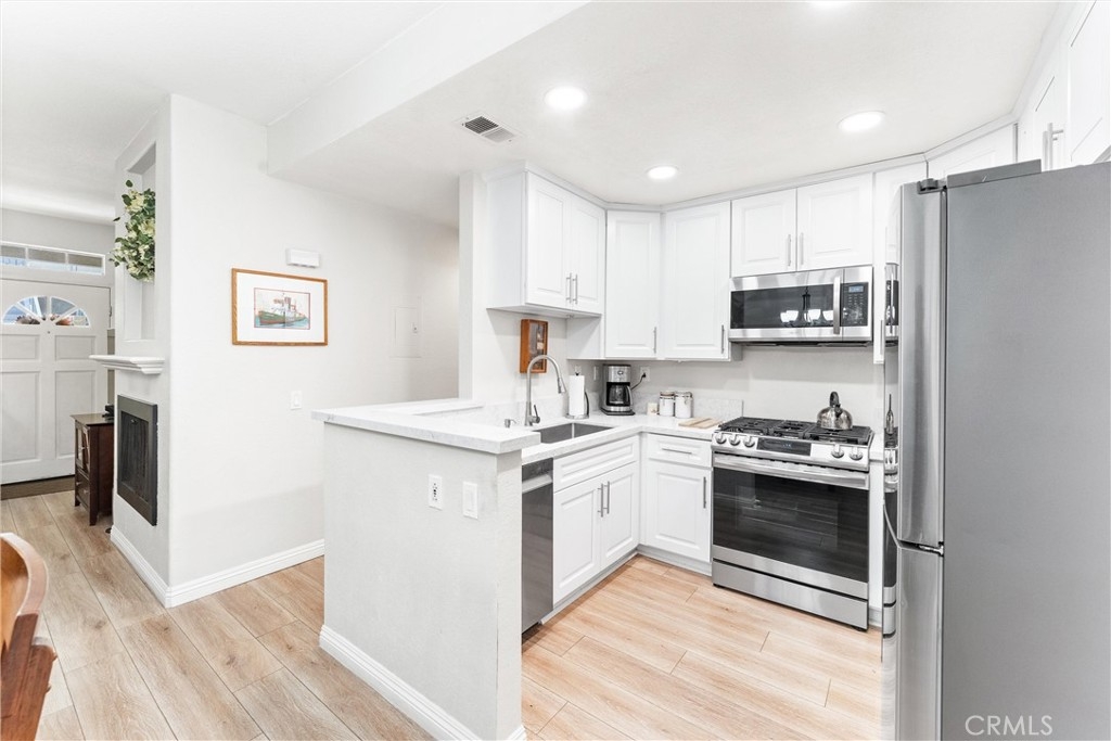 Spacious floorplan—this layout feels roomier than its size. This gorgeously remodeled 2-bedroom, 2-bathroom downstairs home in the highly desirable Belflora community of Rancho Santa Margarita is turnkey and brimming with upgrades. From the moment you step inside, you’ll appreciate the open, functional design, cozy fireplace, and abundant natural light. The gourmet kitchen is a showstopper—quartz counters, farmhouse sink, upgraded 5-burner stove, Samsung stainless steel smart appliances, and plenty of cabinetry for storage. Even the 4-door stainless refrigerator stays! Both bathrooms feature stylish barn-door shower enclosures and quartz counters, with the primary suite offering dual sinks and a spa-like feel. Bedrooms are generously sized, complete with custom shutters and ceiling fans. Step out to your relaxing patio with a custom water feature—perfect for morning coffee, unwinding after work, or saying hello to friendly neighbors. The deep, attached 1-car garage with direct access adds everyday convenience. Located just steps from RSM Lake, you’ll enjoy iconic Saddleback Mountain views, lakefront dining, and serene walks. As a resident, you’ll have access to the Lago Santa Margarita Beach Club with its sandy beach lagoon, watercraft rentals, BBQ areas, volleyball, and more. The HOA also includes 13 parks, multiple pools, pickleball, tennis, sports courts, and community events year-round. RSM has been ranked as a safest city in California—offering a walkable, active lifestyle with shops, restaurants, coffee houses, and parks all close by. Whether it’s kayaking on the lake, playing a quick game of pickleball, or relaxing at the beach club, every day feels like a getaway. And if you’re commuting, you’ll appreciate quick access to the 241 Toll Road and a short drive to the coast. This isn’t just a smart find—it’s the home you’ll love calling your own! Come see why!
