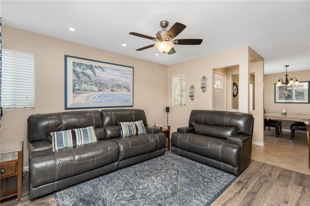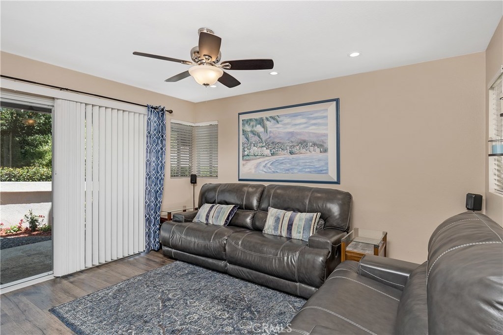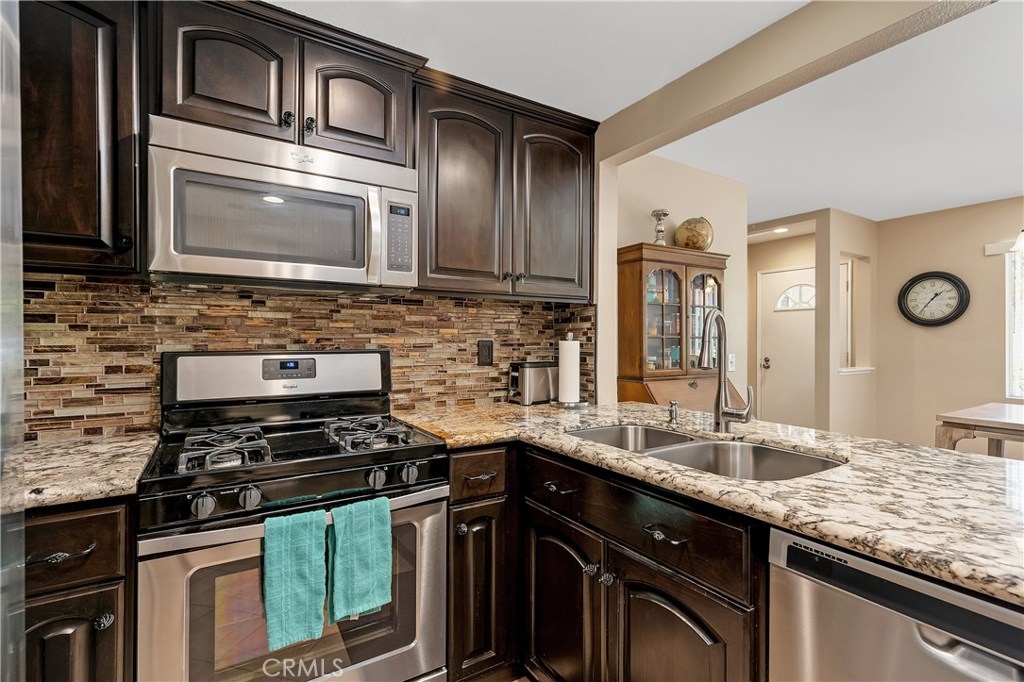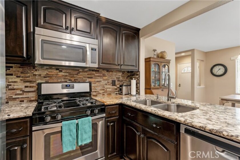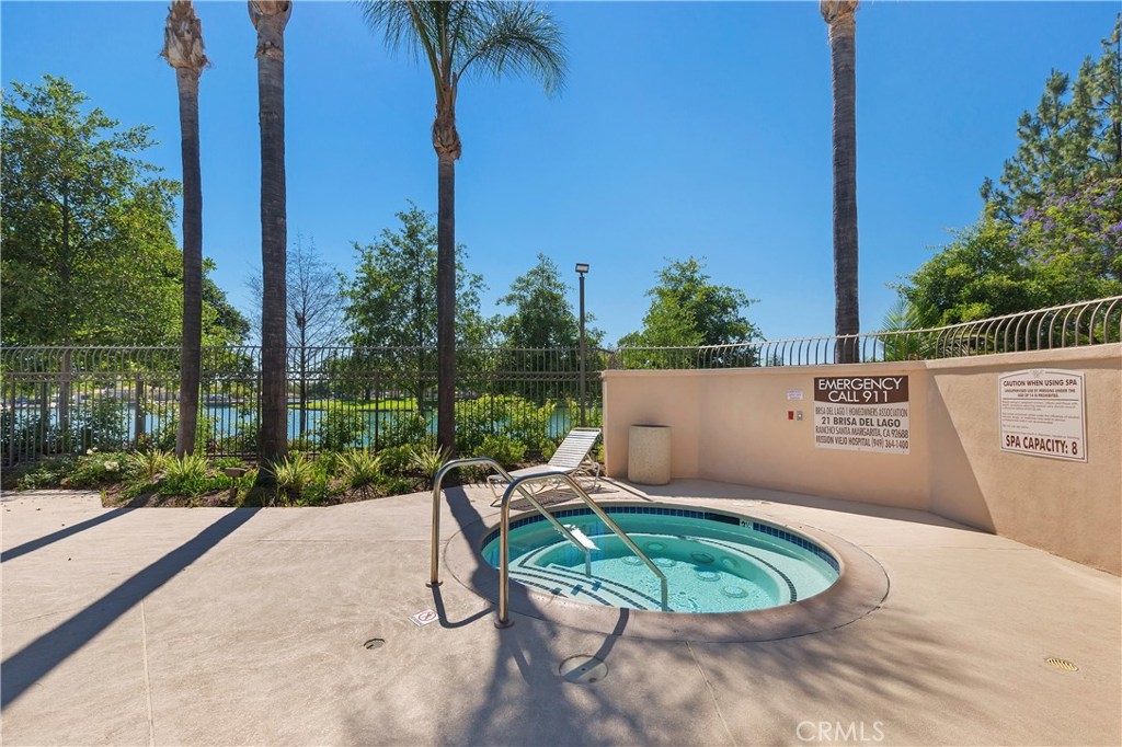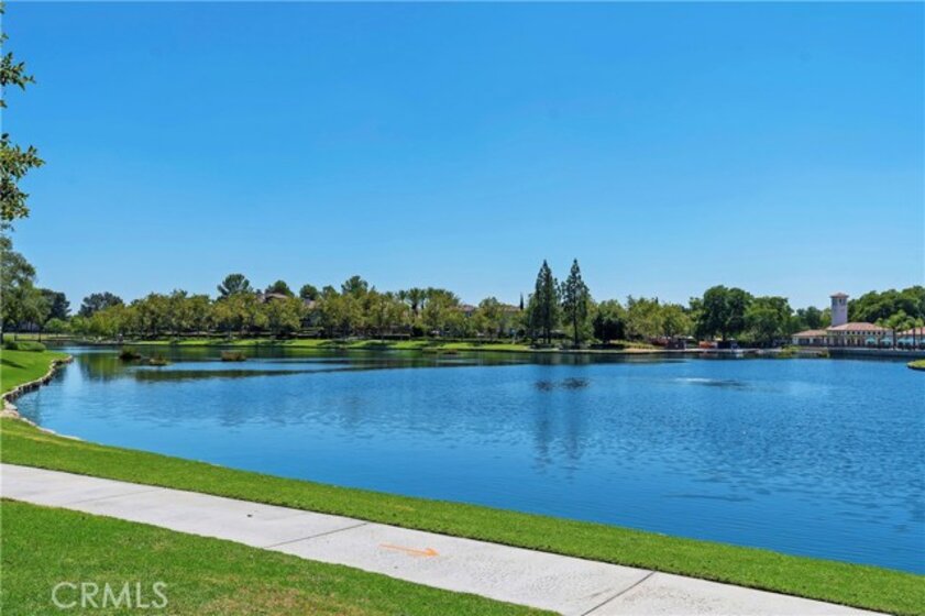 Highly sought-after Brisa del Lago Condo. Very private end unit with lush landscaping. Light and bright 2 Bedroom/2 Bathroom unit. Upgraded Kitchen w/granite counter tops & stainless-steel appliances. Open floor plan with inviting slate stone fireplace in living room. Master bathroom upgraded with double sink granite counters. Guest Bathroom upgraded with vanity and granite counter top. Added can lighting in Livingroom, Ceiling Fans in both bedrooms, and living room. New Air Conditioning & Full-size stackable washer and dryer. Oversized tranquil back Patio, wonderful for entertaining. 1 car attached garage plus 1 car detached garage plus a spot on the driveway, 3 parking spots in total and lots of guest parking. Exterior of complex has been newly painted. Association offers 1 Pool and 2 Jacuzzies. Walk to the lake, beach club access. Close to hiking trails, toll roads, shopping, restaurants. No Mello Roos.