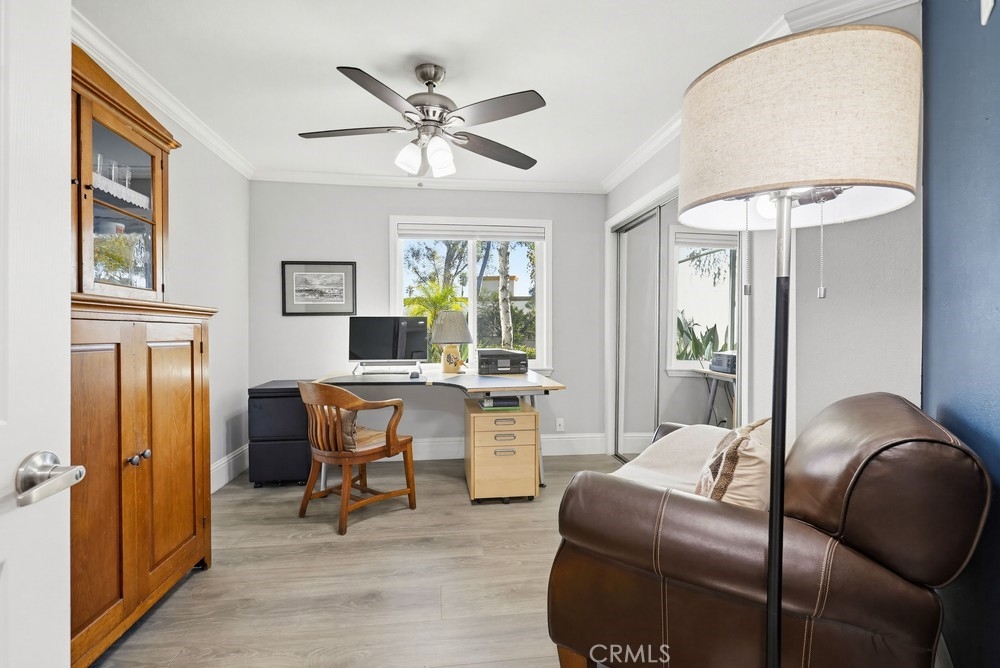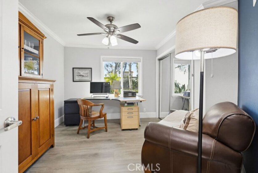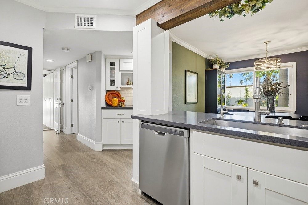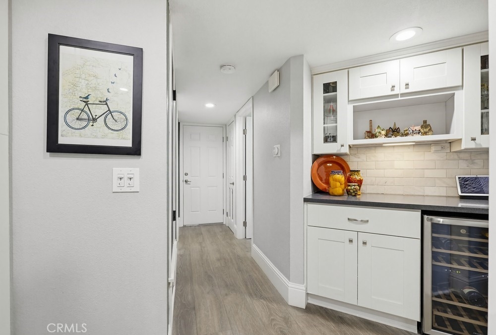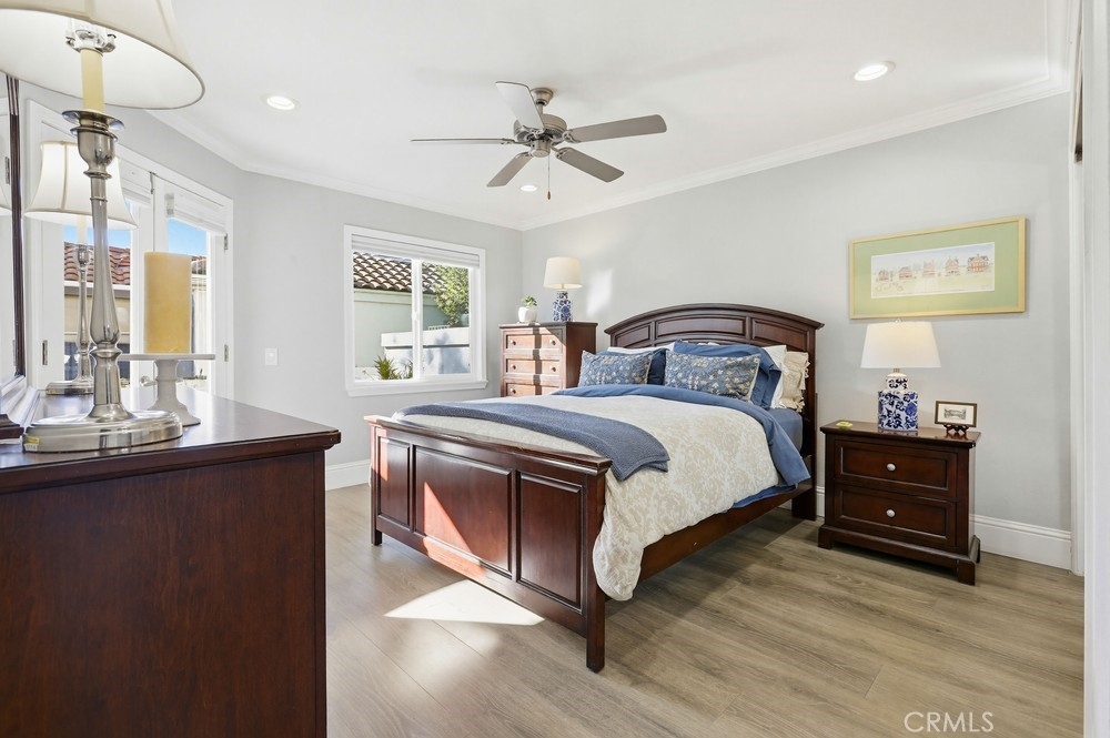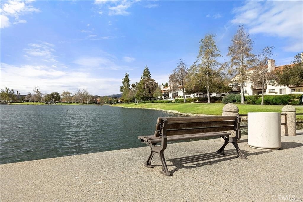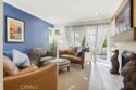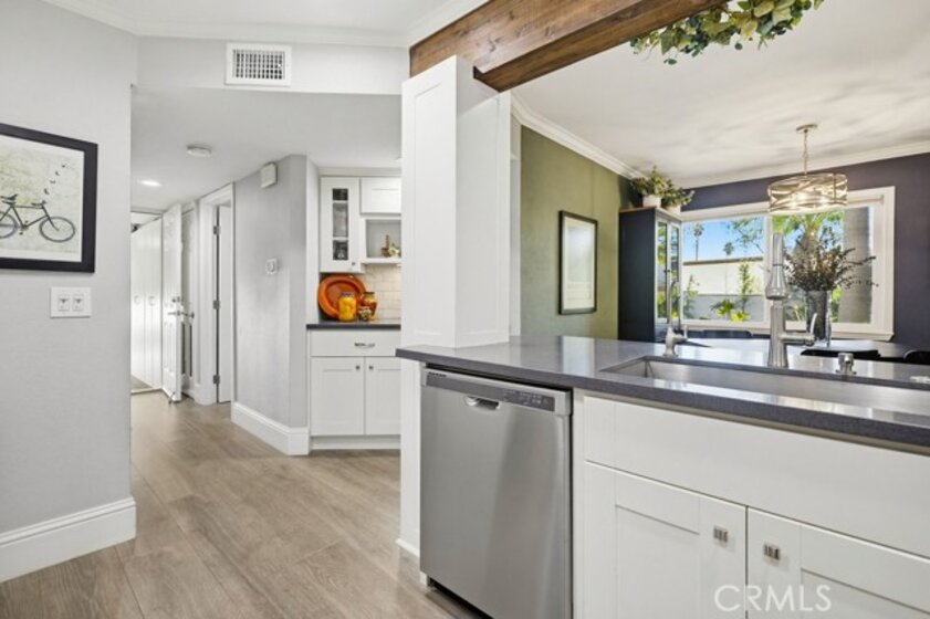 Located in Rancho Santa Margarita, this residence offers a welcoming entry and a thoughtfully divided floor plan with distinct living and private spaces, along with updated flooring throughout the home. The main living room offers fresh paint, crown molding, recessed lighting, and a classic mantel, creating a comfortable and polished gathering area. Off of this area is the primary bedroom which includes crown molding, an ensuite bathroom, and dual closets. Sliding glass doors from the living area open to an outdoor deck accented with extra lighting and makes a pleasant extension of the living space. On the opposite side of the home, the dining area is highlighted by an updated light fixture and recessed lighting, seamlessly connecting to the kitchen. The kitchen features a peninsula breakfast bar, wine refrigerator, and a conveniently located stackable washer and dryer. A hallway off this area leads to a secondary bedroom with ceiling fan, a full bathroom, and direct access to the attached one-car garage. A second detached garage is accessible via the rear alley, providing additional parking or storage options. Ideally located within walking distance to Rancho Santa Margarita Lake, as well as shops and stores near by, the home offers a desirable and convenient setting.