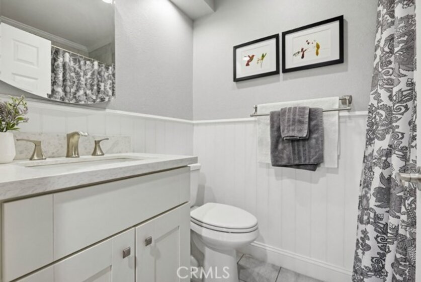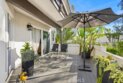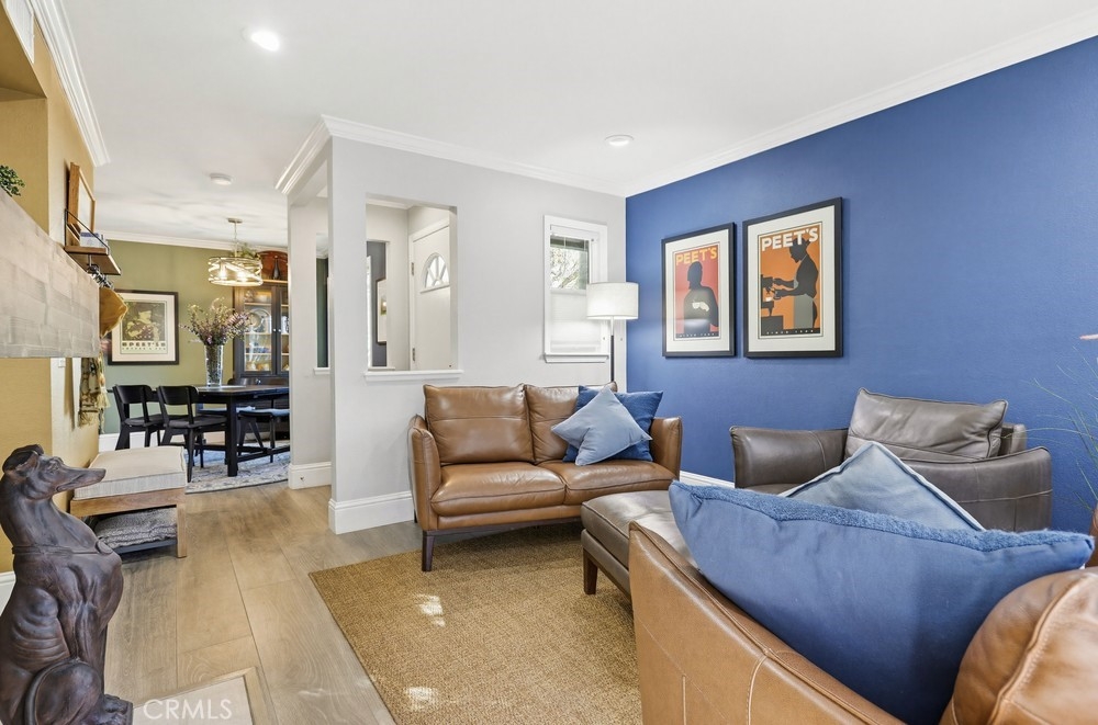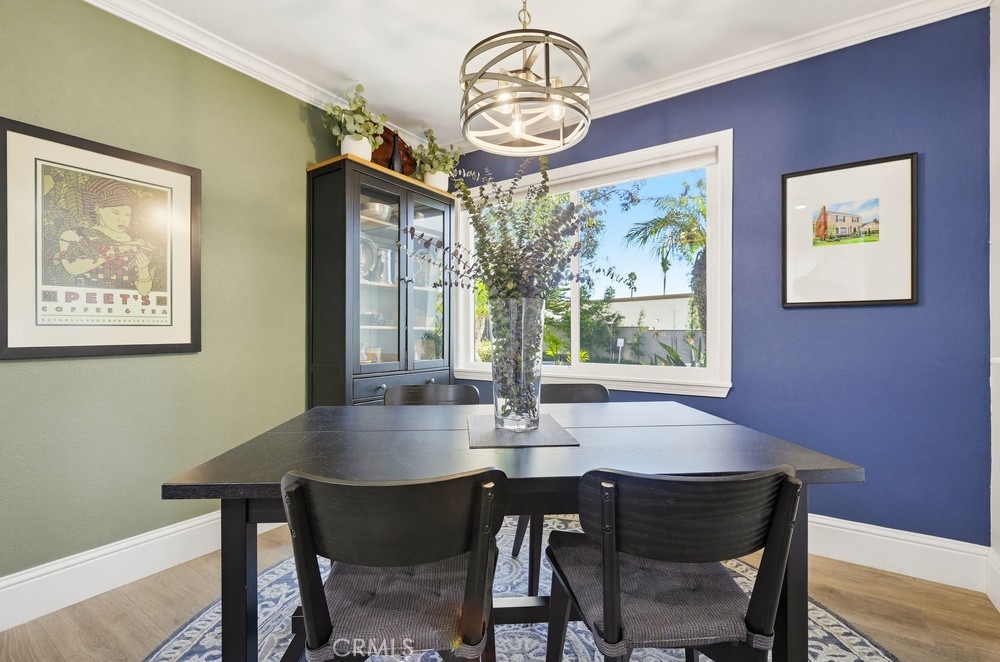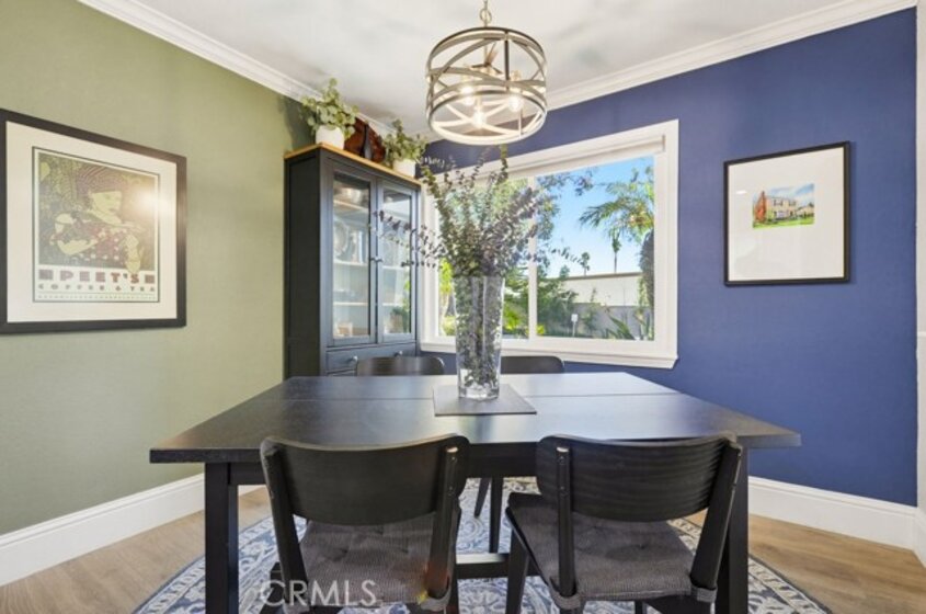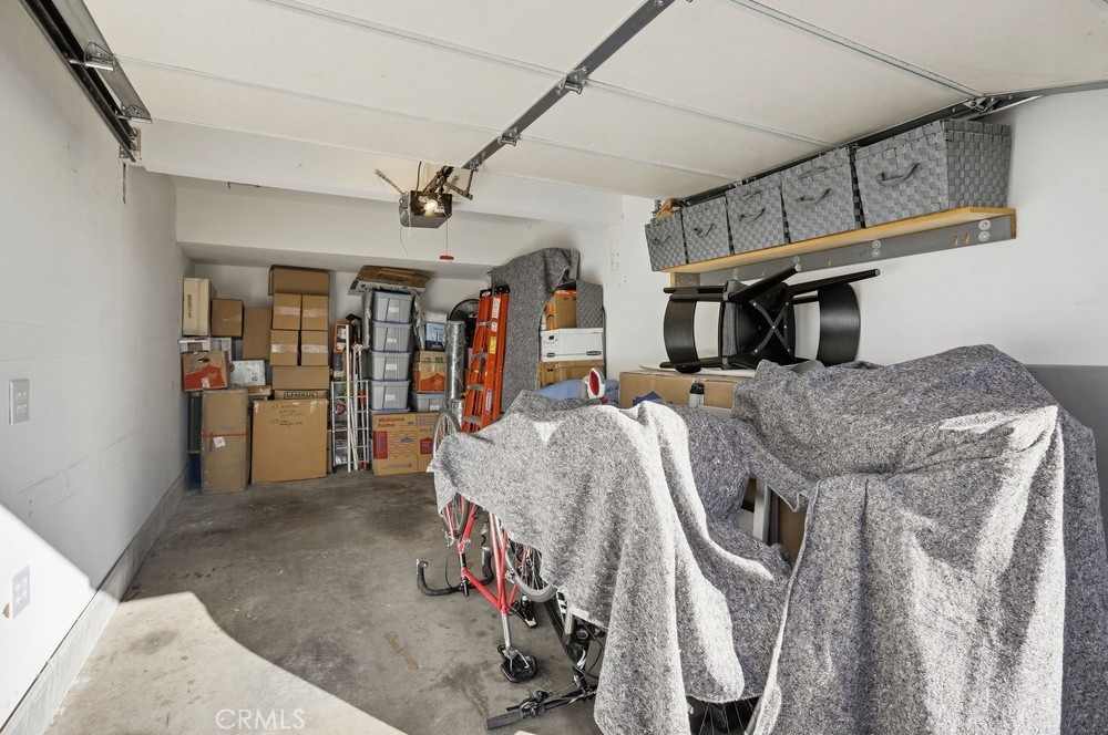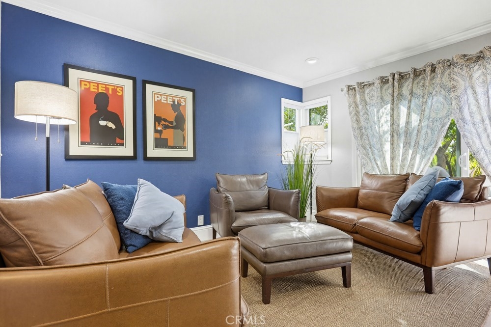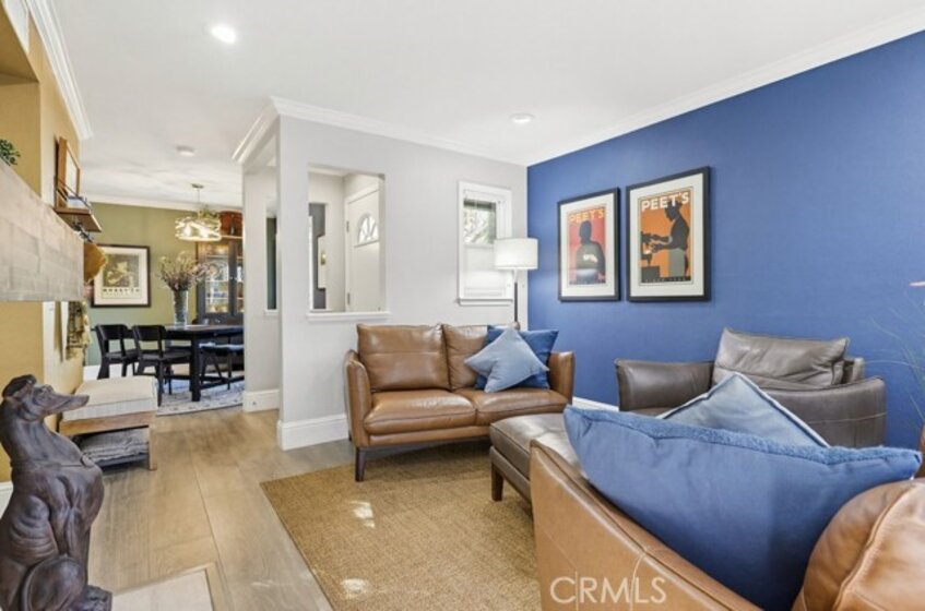 Located in Rancho Santa Margarita, this residence offers a welcoming entry and a thoughtfully divided floor plan with distinct living and private spaces, along with updated flooring throughout the home. The main living room offers fresh paint, crown molding, recessed lighting, and a classic mantel, creating a comfortable and polished gathering area. Off of this area is the primary bedroom which includes crown molding, an ensuite bathroom, and dual closets. Sliding glass doors from the living area open to an outdoor deck accented with extra lighting and makes a pleasant extension of the living space. On the opposite side of the home, the dining area is highlighted by an updated light fixture and recessed lighting, seamlessly connecting to the kitchen. The kitchen features a peninsula breakfast bar, wine refrigerator, and a conveniently located stackable washer and dryer. A hallway off this area leads to a secondary bedroom with ceiling fan, a full bathroom, and direct access to the attached one-car garage. A second detached garage is accessible via the rear alley, providing additional parking or storage options. Ideally located within walking distance to Rancho Santa Margarita Lake, as well as shops and stores near by, the home offers a desirable and convenient setting.