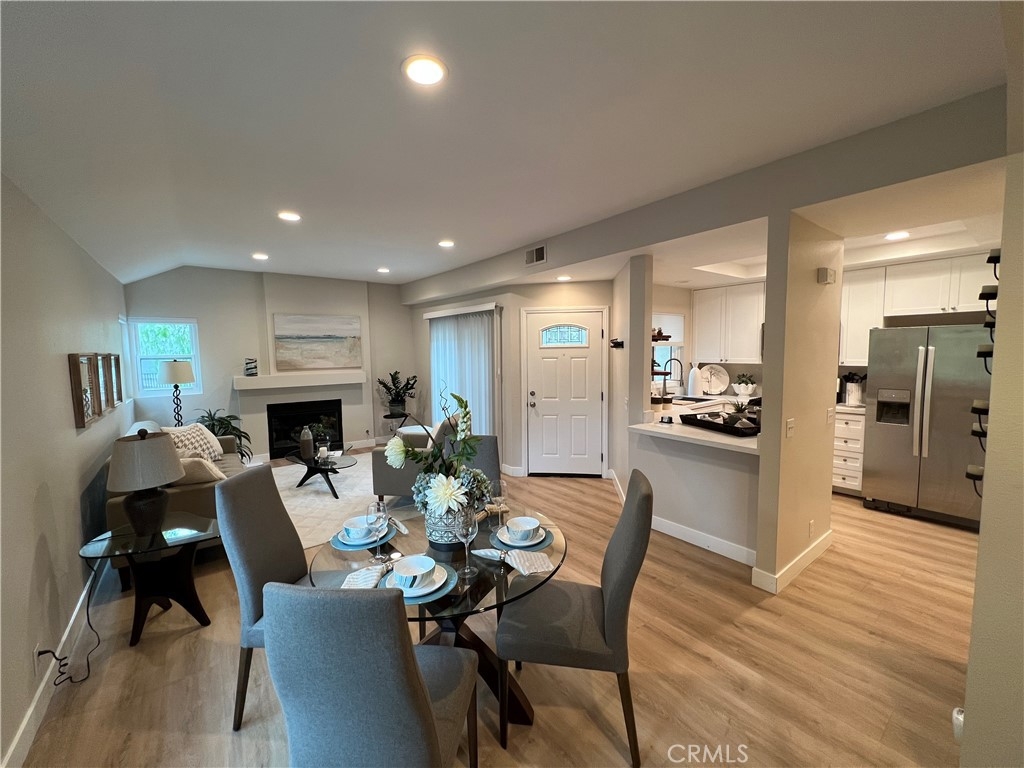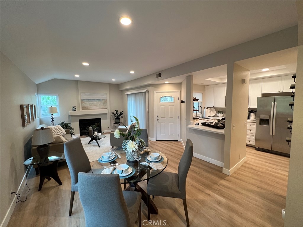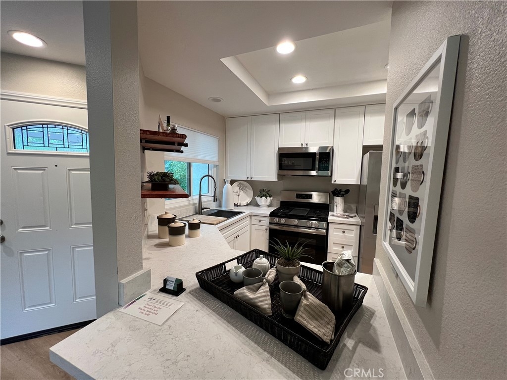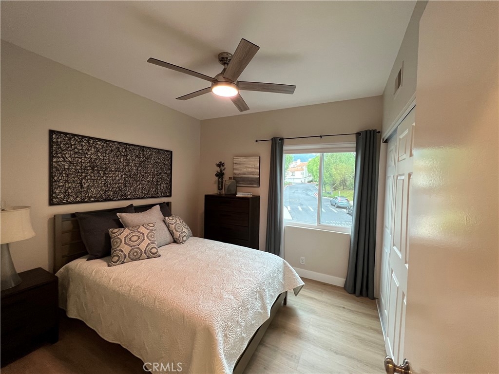 Excellent Location! This corner carriage unit with no one below is just steps to Rancho Santa Margarita Lake, Shopping, Restaurants, Parks and more. Light and Bright. Well maintined and upgraded throughout. New dual pane windows and slider with "quiet package". Pull down shades. Light colored LVP flooring throughout. LED lighting. Living room with fireplace and slider door to patio/balcony. Upgraded Kitchen has Quartz leathered countertops, newer stainless appliances, white cabinets with slow close, Kohler sink. Newer Furnace (less than 5 years) and Water Heater (less than 3 years). Stackable washer and dryer. Ceiling fans in bedrooms. Remodeled Primary bath with dual sinks and vanity, large shower, privacy window and linen closet. Walk in closet off of primary bath. Mountain views from primary bedroom. Secondary bath with newer vanity and shower. Nest thermostat. Patio has gas connection for BBQ. 1 Car garage with room for storage plus assigned carport. Newer garage door opener (less than 6 months) with battery back up. Community is a short distance to schools, shopping, lake, and Beach Club. Access to Rancho Santa Margarita pools, tennis courts, and pickle ball courts. Great Opportunity!