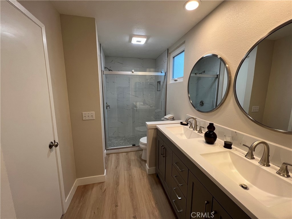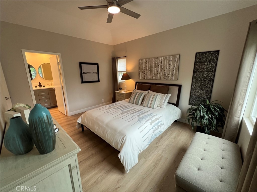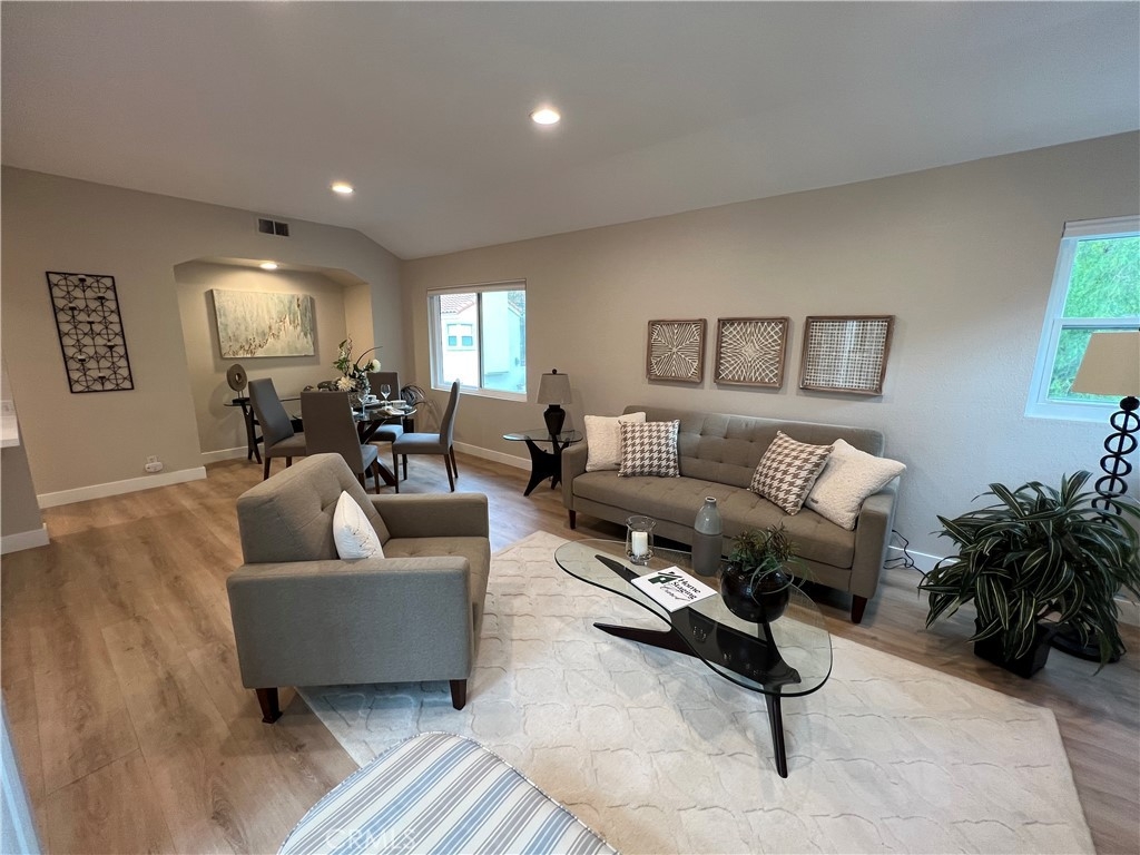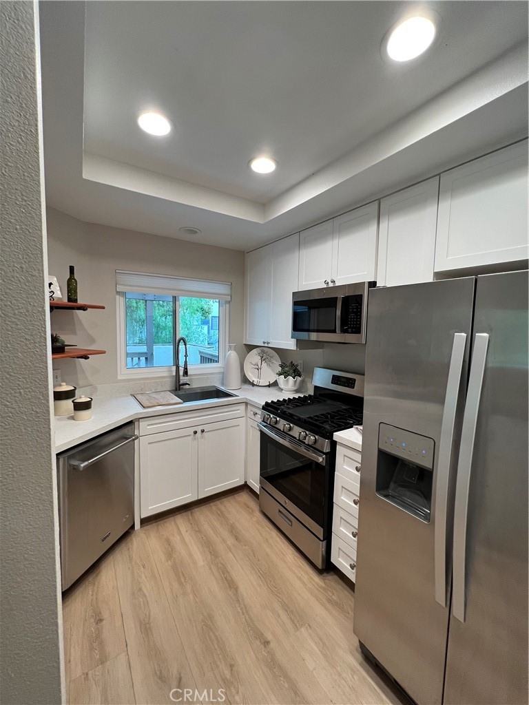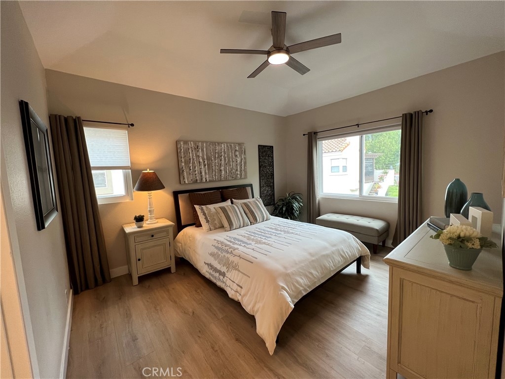 Excellent Location! This corner carriage unit with no one below is just steps to Rancho Santa Margarita Lake, Shopping, Restaurants, Parks and more. Light and Bright. Well maintined and upgraded throughout. New dual pane windows and slider with "quiet package". Pull down shades. Light colored LVP flooring throughout. LED lighting. Living room with fireplace and slider door to patio/balcony. Upgraded Kitchen has Quartz leathered countertops, newer stainless appliances, white cabinets with slow close, Kohler sink. Newer Furnace (less than 5 years) and Water Heater (less than 3 years). Stackable washer and dryer. Ceiling fans in bedrooms. Remodeled Primary bath with dual sinks and vanity, large shower, privacy window and linen closet. Walk in closet off of primary bath. Mountain views from primary bedroom. Secondary bath with newer vanity and shower. Nest thermostat. Patio has gas connection for BBQ. 1 Car garage with room for storage plus assigned carport. Newer garage door opener (less than 6 months) with battery back up. Community is a short distance to schools, shopping, lake, and Beach Club. Access to Rancho Santa Margarita pools, tennis courts, and pickle ball courts. Great Opportunity!