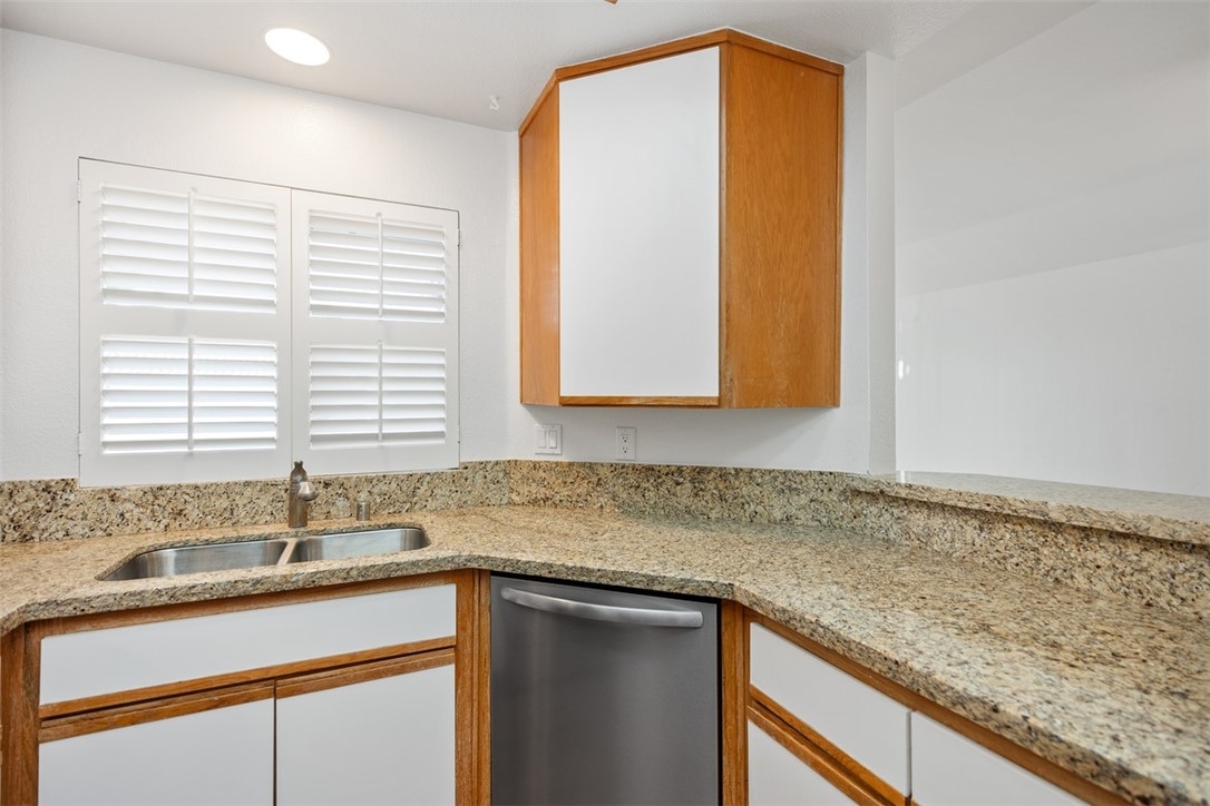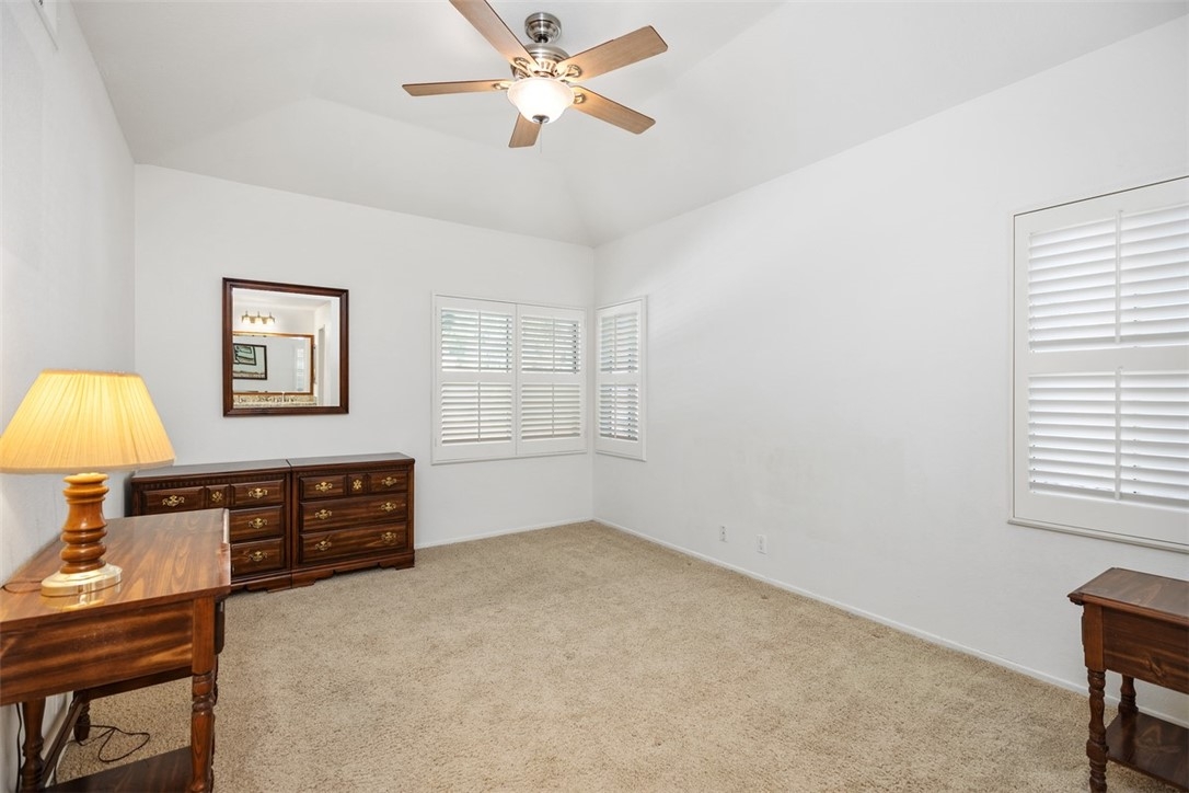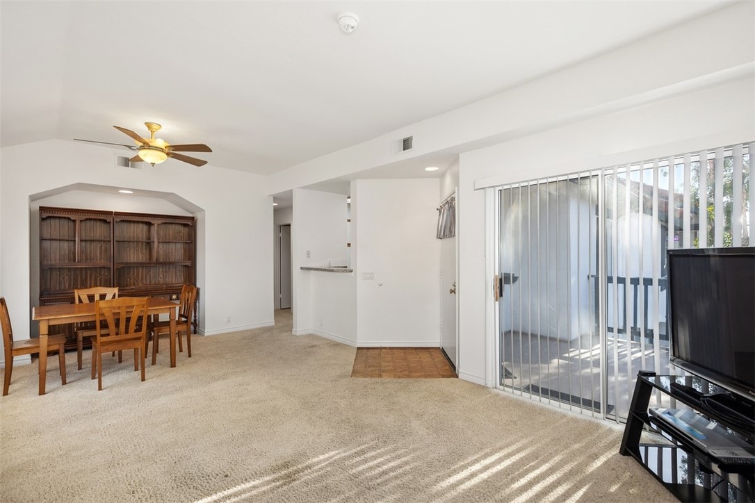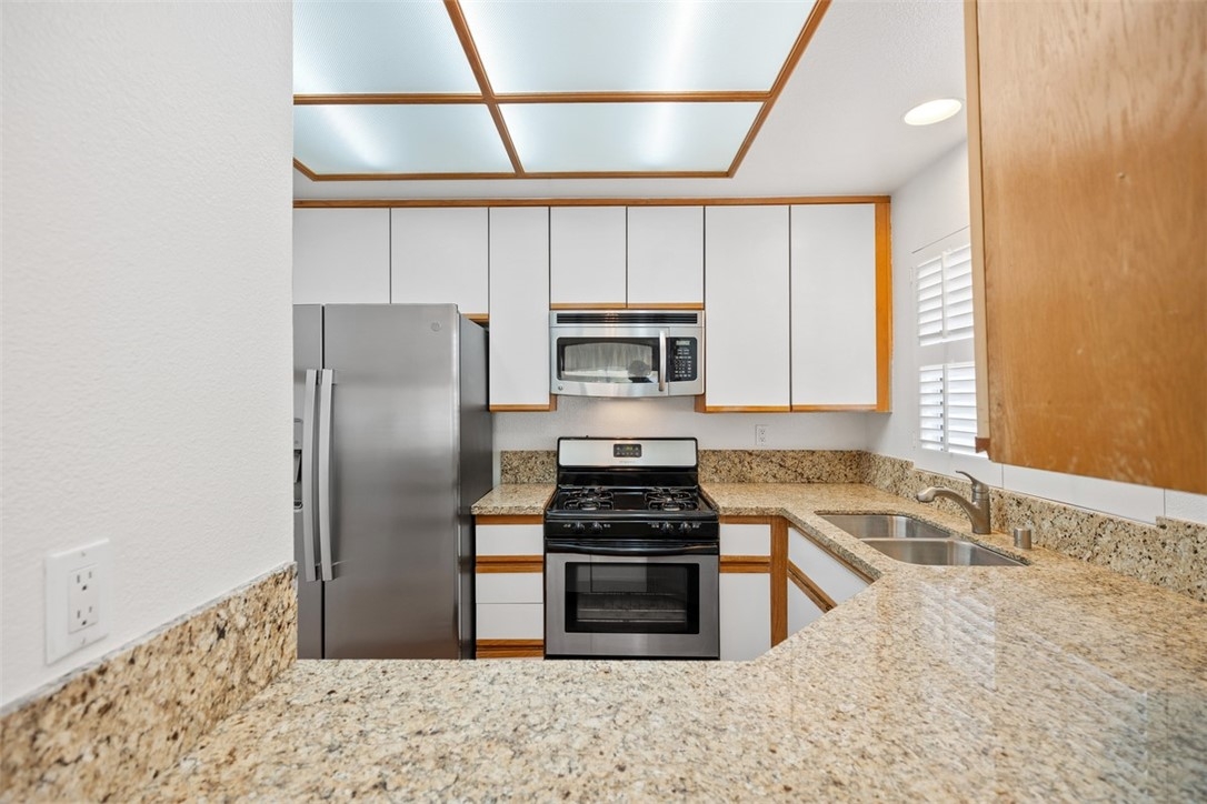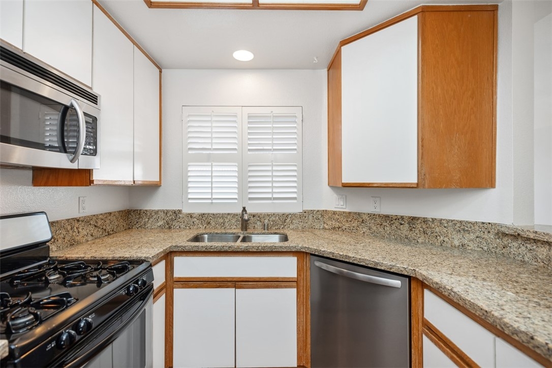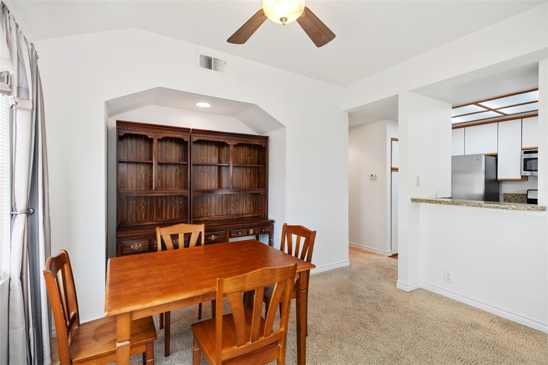 Welcome home to 6 Dianthus. An open floor plan with vaulted ceilings, and windows throughout bringing in natural light to create a warm and inviting home. The kitchen is open to the dining area for ease of entertaining. Amenities of the kitchen include granite counters, stainless steel appliances, a breakfast bar, and a window over the sink provides natural light. The sliding door in the living room leads to the spacious balcony, and the fireplace in the living room provides extra warmth on those chilly nights. The dining room and each of the bedrooms have lovely ceiling fans. The primary bedroom is an ensuite with a walk-in closet. In the primary bathroom, the shower/tub has brand new fiberglass, and a dual vanity with granite counters. The secondary bedroom is currently being used as an office, and has a mirrorred wardrobe. In the secondary bathroom a brand new fiberglass enclosure, plus a brand new glass shower door. A closet in the hallway provides a stackable washer and dryer for the new homeowner. A detached one car garage, with new garage door opener, completes the home. The Homeowners enjoy a well maintained community with an Association pool and spa and recreational area. Brisa Del Lago II is close to beautiful Rancho Santa Margarita Lake, Trabuco Mesa Park, Monte Vista Park, and O'Neill Regional Park. During the year there are numerous events around the lake and park. The community is located close to shopping, restaurants, and entertainment. All furnishings shown in the photos are included in the sale. Do not miss seeing this great opportunity!
