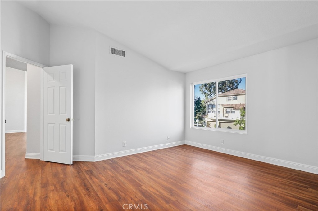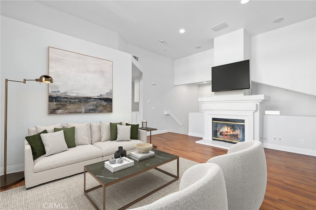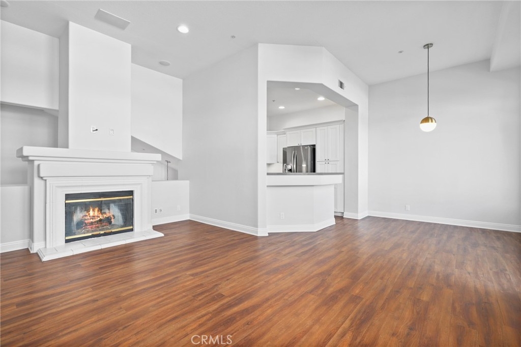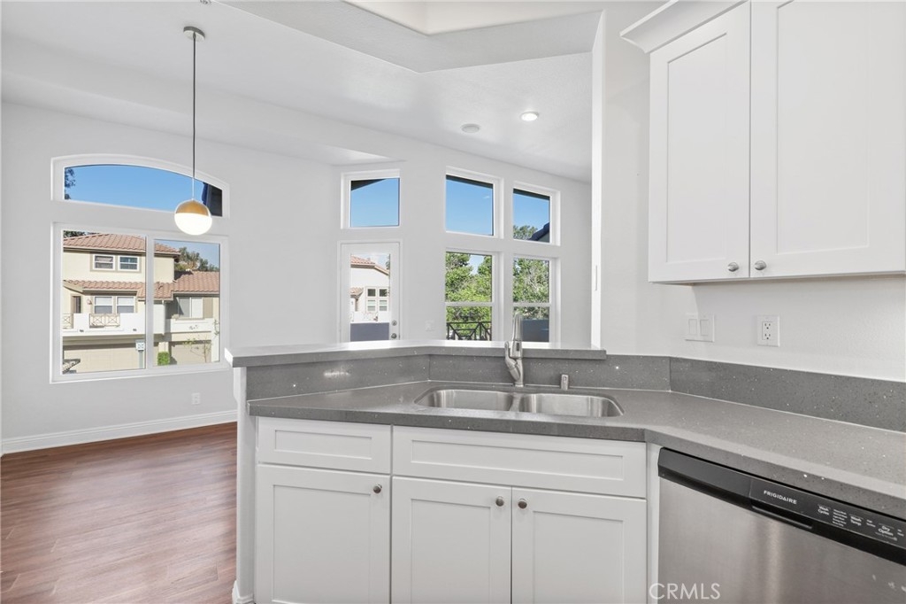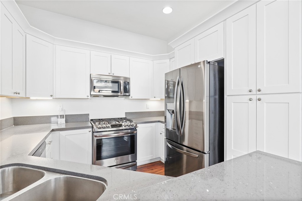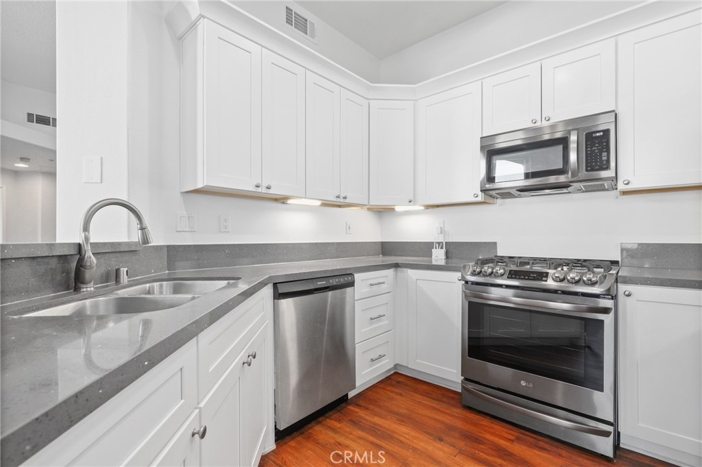 Welcome to this GEM of a home in the great city of Rancho Santa Margarita! This 2 bedroom, 2 bath home in the heart of RSM is located in one of the most sought after communities, Cabo Vista. A freshly painted interior, laminate wood look flooring throughout, a wall flanked with windows to allow natural sunlight in, and an open floor plan makes this living area feel bigger than what it is. The kitchen has been remodeled with shaker style white cabinets, beautiful quartz countertops and full suite of stainless steel appliances (Sink, microwave, freestanding range, refrigerator and dishwasher). Other features include a cozy fireplace in the main living area, surround sound speakers, recessed lighting, smart thermostat, light dimmers plus a separate laundry closet. The primary bedroom suite has a walk in closet with mirrored doors, en-suite bath that includes dual sinks and a walk in shower. A French door leads you outside to the balcony where you can enjoy a perfect summer BBQ or take in the tranquil scenery of the Cabo Vista community. The Cabo Vista pool and spa are just a short distance away. Ownership here also includes access to the abundant Rancho Santa Margarita amenities including pools, the Beach Club, tennis courts, sports fields, parks, playgrounds and so much more! Ranked as one of the safest cities in California, this home surely won't last long! Come see this home today.
