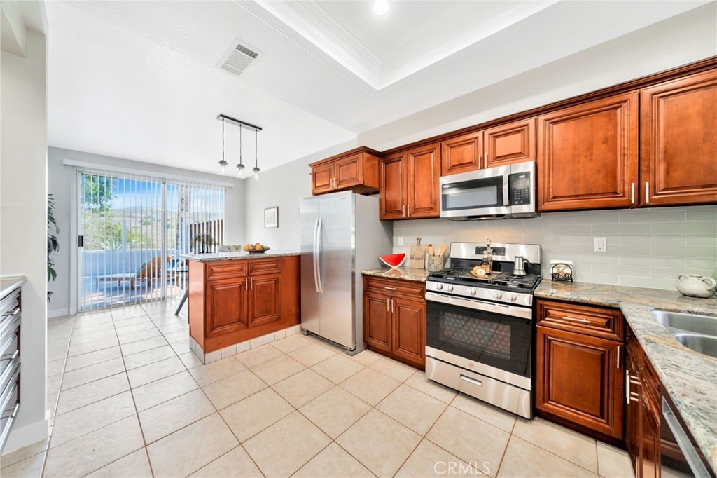 Welcome to your dream home! This beautiful two-story townhome is nestled in Rancho Santa Margarita; a vibrant community rated the safest city in California. 1,644 square foot layout with 3 spacious bedrooms and 2.5 updated bathrooms. Ideal, end of cul-de-sac location, with serene canyon views. The reimagined kitchen has been expanded and opened to adjoining living and dining rooms, enhancing a very comfortable living space. Features include granite counters, updated backsplash, stainless steel appliances (range and refrigerator are new), breakfast nook, and recessed lighting. The spacious dining and living rooms transition seamlessly and feature a cozy two-way fireplace (opposite side is in the breakfast nook). Two large sliding glass doors provide plenty of natural light, and open to a large back patio. The added outdoor space is perfect for larger gatherings (or just enjoying the environment). Upstairs: The large master suite features a sliding glass door (with canyon and sunrise views), balcony, and walk-in closet. The en-suite bathroom includes new garden tub with tile surround (and shampoo niche), new quartz counters, lighting, and plumbing fixtures. The hall bathroom has also been updated with new tub / shower surround, vanity, and plumbing fixtures. The 2nd and 3rd bedrooms provide ample room for queen beds and plenty of closet space. Hard surface flooring throughout, with tile downstairs and attractive luxury vinyl plank floors on the stairs and 2nd floor. In addition to the Candelero pool, your SAMLARC membership includes access to all the city-wide amenities, such as: multiple swimming pools, the Beach Club w/ sand bottom swimming lagoon, basketball, tennis, pickleball, and volleyball courts, clubhouse, parks, and fishing. Other local features: great schools, a skate park, dog park, miles of hiking & biking trails, and the Tijeras Creek golf course. Low property taxes (approximately 1.02%) Welcome to Rancho Santa Margarita, a great place to live!