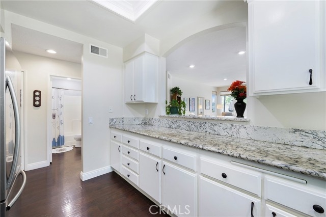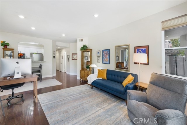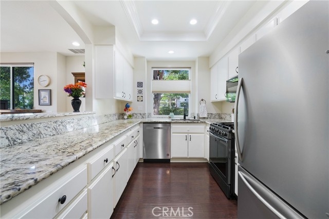 Corner unit with a secret: it lives like a house. Pool on one side, Tijeras Creek's 7th tee on the other, Saddleback Mountain standing guard like it's part of the deal. Two bedrooms, two baths, where someone spent real money on the right things—dark luxury vinyl that flows, granite that grounds the kitchen, stainless steel that makes cooking feel intentional. The layout breathes. Open floor plan that doesn't force connection but allows it, master suite tucked privately in back with its walk-in and spa-level bath, guest room claiming the front like its own small kingdom. Everything where it should be, nothing where it shouldn't. But here's what sets this apart from every other condo you've toured: your own front door, your own two-car garage with direct access, your own entrance that never asks you to share. While neighbors navigate hallways and hunt for parking, you're living the single-family experience without the single-family maintenance. Privacy fence keeps the world at the distance you choose. Artificial turf stays magazine-perfect. Patio holds morning coffee as well as evening wine. The HOA delivers more than promises. Lake RSM access means actual beach days. Tennis courts with nets that stay tight. Sand volleyball where games break out. This isn't fee collection dressed up as community—it's the lifestyle you're buying into, already in motion. The location delivers: walk to what matters, quick drive to everything else. Schools that perform. Restaurants worth discovering. The kind of neighborhood where kids bike to friends' houses and adults walk dogs without checking the time. This is move-in ready for people who know what that actually means. Not just fresh paint over problems, but the deep upgrades that cost real money and save real time. The condo that lets you unpack instead of renovate, host instead of apologize, live instead of wait. This address doesn't just work—it hums. The mountain isn't going anywhere. This condo is.