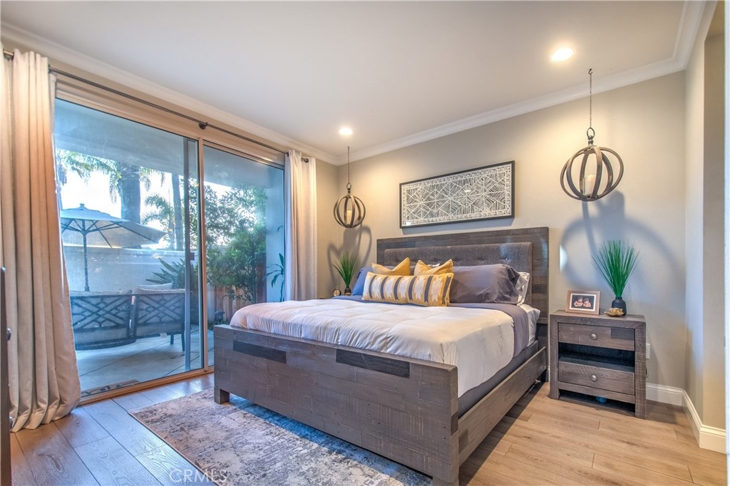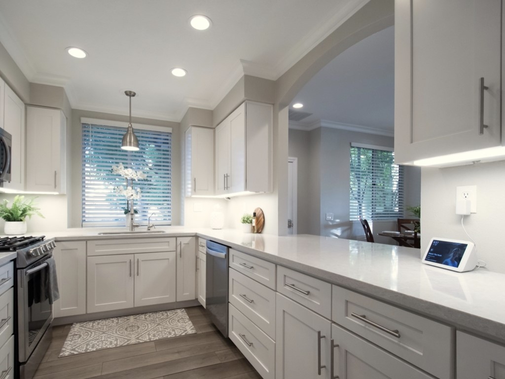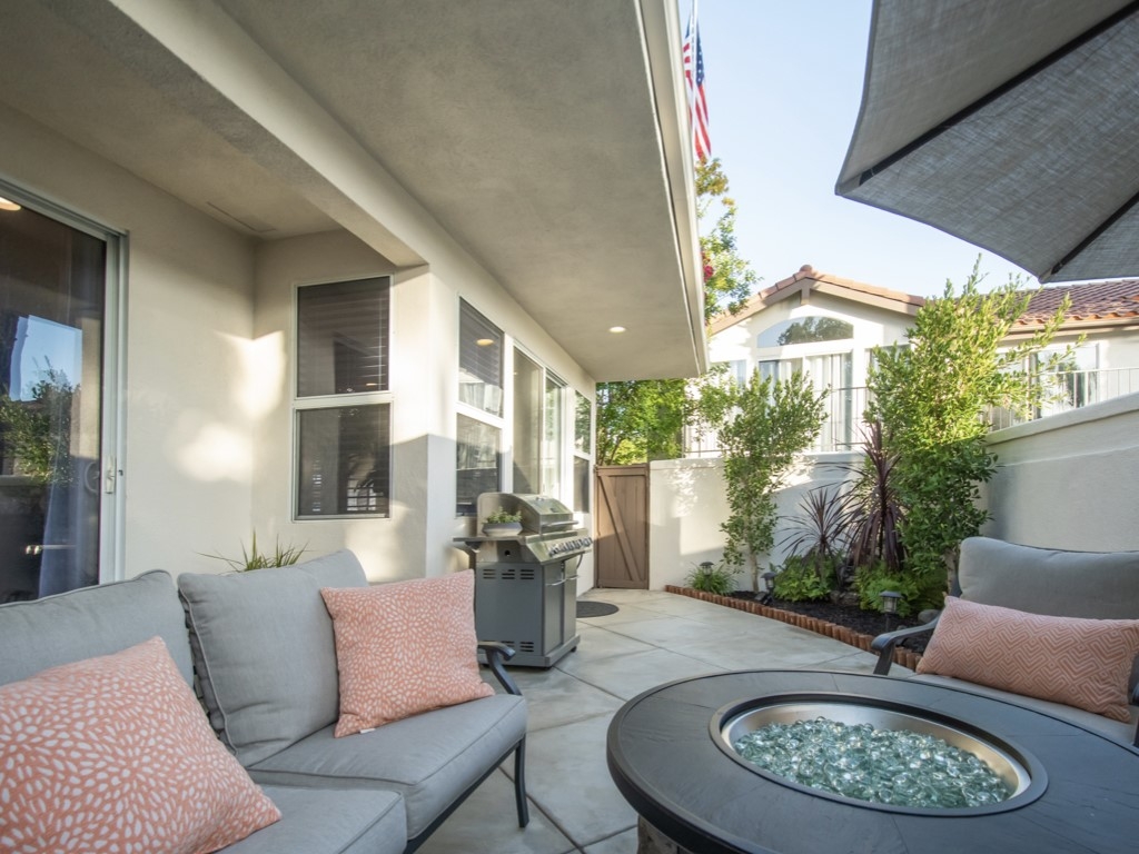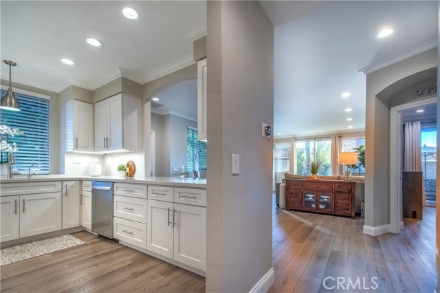 Designer inspired and impeccably maintained home perfectly located in the wonderful community of Candlero. This lovingly cared for home has had a recent remodel featuring a gorgeous kitchen with quartz counters, white shaker cabinets, stainless steel appliances, touchless faucet, and a wonderful breakfast bar. Gorgeous luxury vinyl flooring with decorative baseboard, crown molding and recessed lighting really look great throughout this lovely home. The master bedroom has a private entrance to your patio that brings in lots of natural light. The remodeled bathroom boasts a new vanity, contemporary mirrors and upgraded fixtures and lighting. There is a nice size walk-in closet with an intelligent builtin shelving system. The nice sized secondary bedroom can be configured in multiple ways. The hall bath has also been enhanced with a new vanity, large mirror and updated lighting. There is a private patio perfect for outdoor cooking and meals that uniquely comes with it's own gate to the greenbelt. Stunning sunsets at dusk framed by California palms will take your breath away right from your patio and living room. 2 car attached garage. This community has it's own park with tennis, volleyball, basketball, playground and benches perfect for parties and entertainment. There are walking and biking paths right behind you with amazing canyon and mountain views. Enjoy year-round SAMLARC hosted community events, use of the community parks, a swim lagoon and four swimming pools. The Santa Margarita Lake Beach Club is a great place to meet friends and family, have a birthday party or even rent a water bike to cruise the lake. Nearby, there are shopping and dining options, beautiful Tijeras Creek Golf, hiking & biking trails and easy access to the 241 Toll Road. Truly a great place to live the wonderful So Cal lifestyle!!