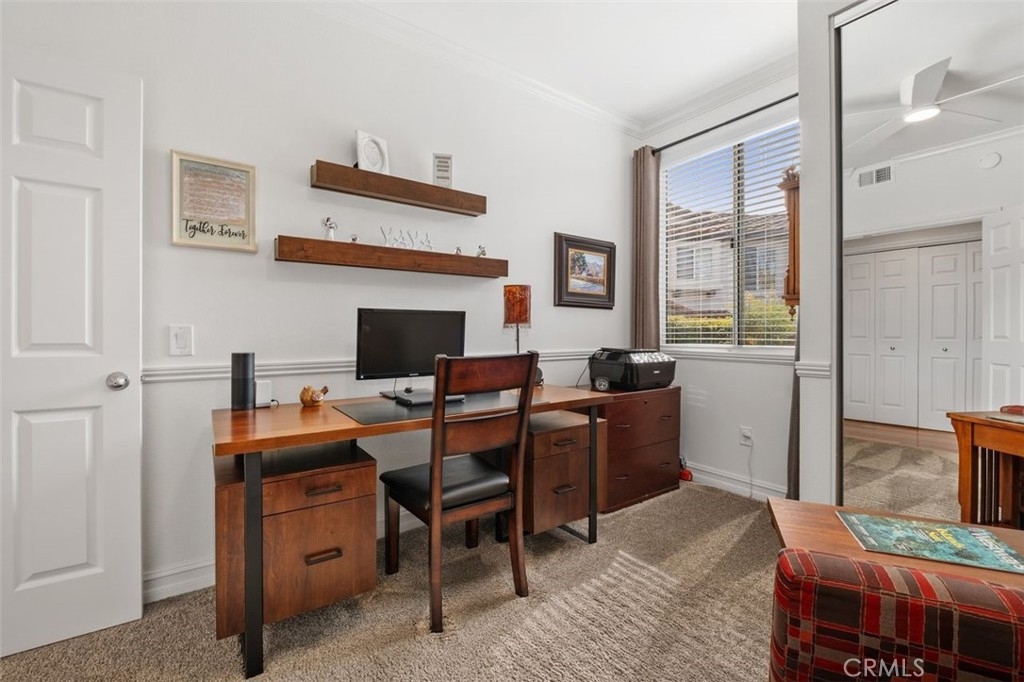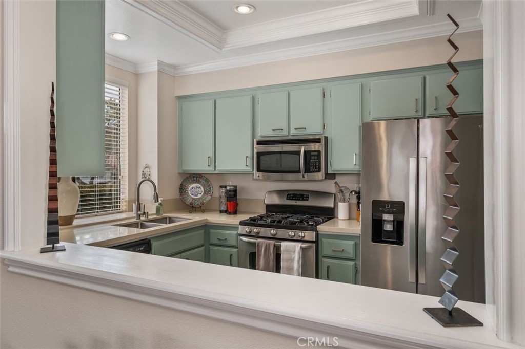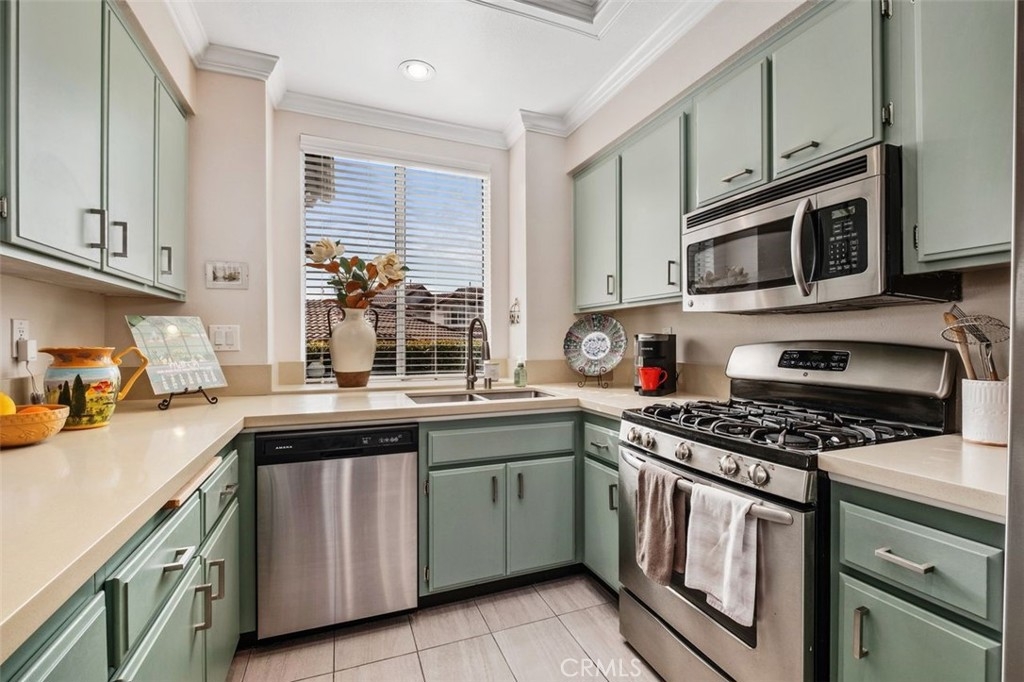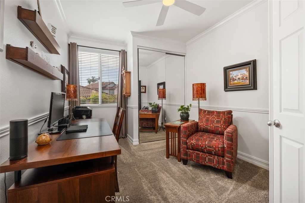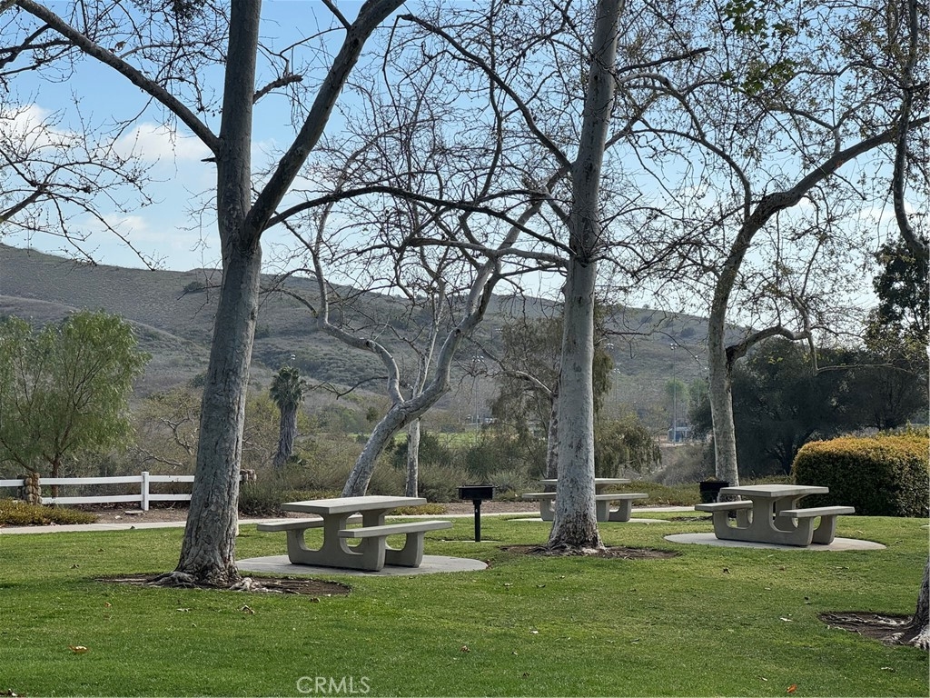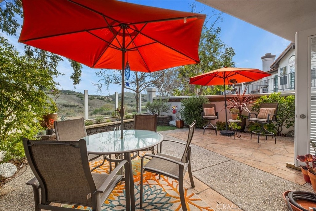 Wait no more! This one story 2 bedroom, 2 bathroom home in Candelero is perfect in every way! It feels like a detached home with a panoramic view of the hills beyond and a peaceful patio yard with bubbling fountain. The living/dining room is large with double French doors and side windows to bring in the light, and the fireplace is modern with newer porcelain tile surround, hearth and reclaimed wood mantel. The sunny kitchen looks out to the living/dining area so it feels like a great room. It has quartz countertops with a stainless steel double sink, painted cabinets with newer brushed nickel handles, GE appliances and a pantry. Imagine waking up each morning in the primary bedroom to the beautiful view right outside your sliding glass door to the backyard. The primary bathroom is completely remodeled with free-standing wood vanity with double sinks, a marble countertop with chrome faucets, newer mirrors, a large shower with custom porcelain tile surround, and a walk-in closet with closet organizers. The secondary bedroom has a closet with mirrored sliding doors. It and the primary bedroom have newer carpet and the decorative drapes and rods in both rooms are included. The remodeled secondary bathroom has a free-standing wood cabinet with decorative countertop and backsplash and a recoated fiberglass tub/shower. The patio is so inviting - you can't help but want to sit outside and enjoy the peaceful atmosphere, look out at the uninterrupted view of the hills through the glass fence, and enjoy the garden and fountain and the professional flagstone and aggregate decking. There are too many upgrades to list - beautiful cherry floor, porcelain tile floor in the kitchen and bathrooms, 3 modern fans, white wood blinds, 2 tone paint, crown molding, door casing, newer baseboards, brushed nickel faucets and fixtures, newer lighting, disappearing screen doors, newer HVAC, recent re-pipe. The washer and dryer are included and are conveniently located in their own closet in the hallway. The 2-car garage has a roll-up garage door, storage cabinets including overhead wire storage areas and a workshop area. Attend excellent schools including Tesoro High School. Enjoy Candelero Homeowners Association's pool and spa, as well as Santa Margarita lake, pools, parks including nearby Mesa Linda Park with tennis courts, volleyball, basketball, children's playground, and eating areas with barbeques. No Mello Roos.