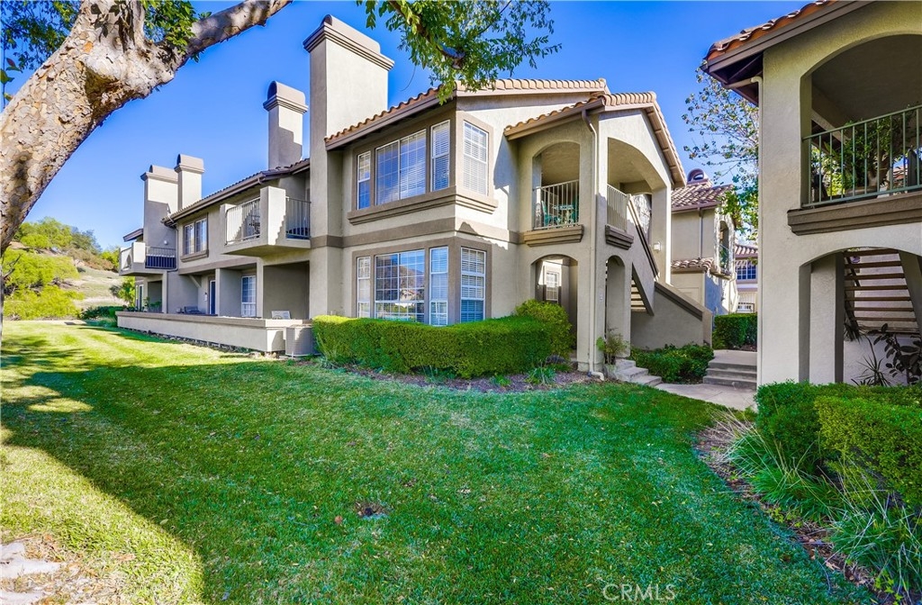Welcome to 15 San Angelo, a 2-bedroom, 2-bathroom, 1,027 sq. ft. corner unit condo featuring timeless Spanish-style architecture with a stucco exterior and tile roofing, nestled in a serene, well-maintained community with nicely treed green spaces. The home’s upstairs entry invites you to a spacious front porch, perfect for a cozy seating area or a collection of plants. Inside, the open-concept living and dining area is bright and inviting, with vaulted ceilings, a fireplace, and plenty of natural light from windows on two walls. Sliding glass doors in the dining area lead to a private back porch overlooking the treed community and open spaces. The kitchen offers a practical layout with a breakfast bar, ample cabinet storage, and tile countertops. The first bedroom, accessed through double doors, has high ceilings, unique textured glass interior windows, and nearby access to a full bathroom with a tub/shower combo and single-sink vanity. The primary bedroom features vaulted ceilings, dual closets, and an en-suite bathroom with a dual-sink vanity, a tub/shower combo, and a separate water closet. Additional conveniences include an in-unit laundry room with storage and access to the water heater, plus an attached one-car garage. This home combines charming design with practical living in a serene community close to dining, shopping, and outdoor recreation. Don’t miss the opportunity to make this corner unit your own!