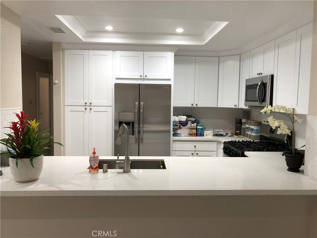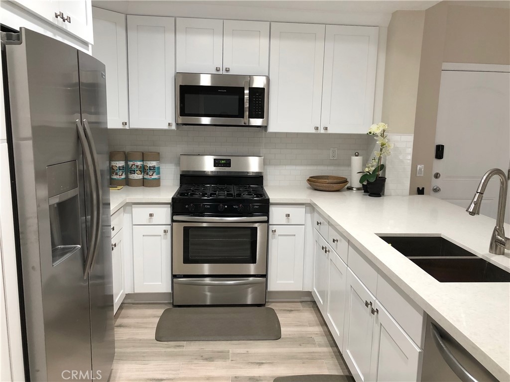 This end unit has two bedrooms and two full baths and has been recently been remodeled. New kitchen Cabinets with stainless steel appliances and quartz counter tops. Newer tile wood grain flooring. 8 Foot walk in shower in master bedroom with Barn Door style shower glass door. Attached one car garage and one assigned parking space. The community was recently re-piped with Pex piping . Fantastic hiking and biking trails located right behind the complex. Shopping, restaurants and grocery store along with several other stores all within walking distance. Close TO 241 Toll Road