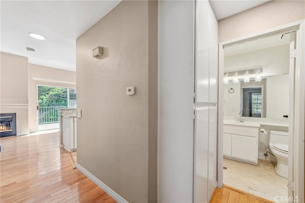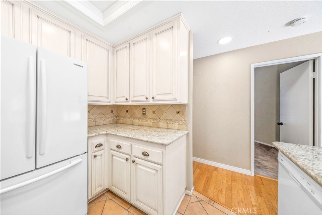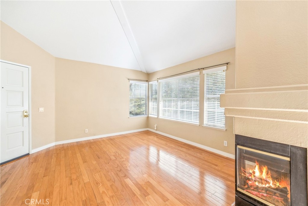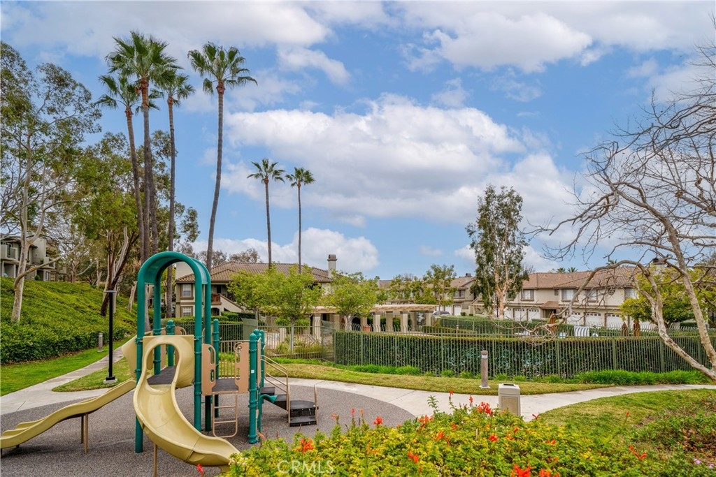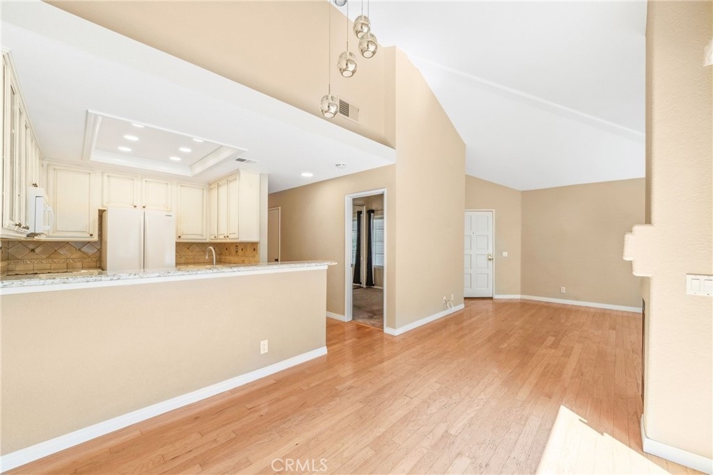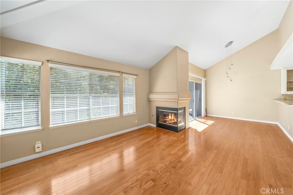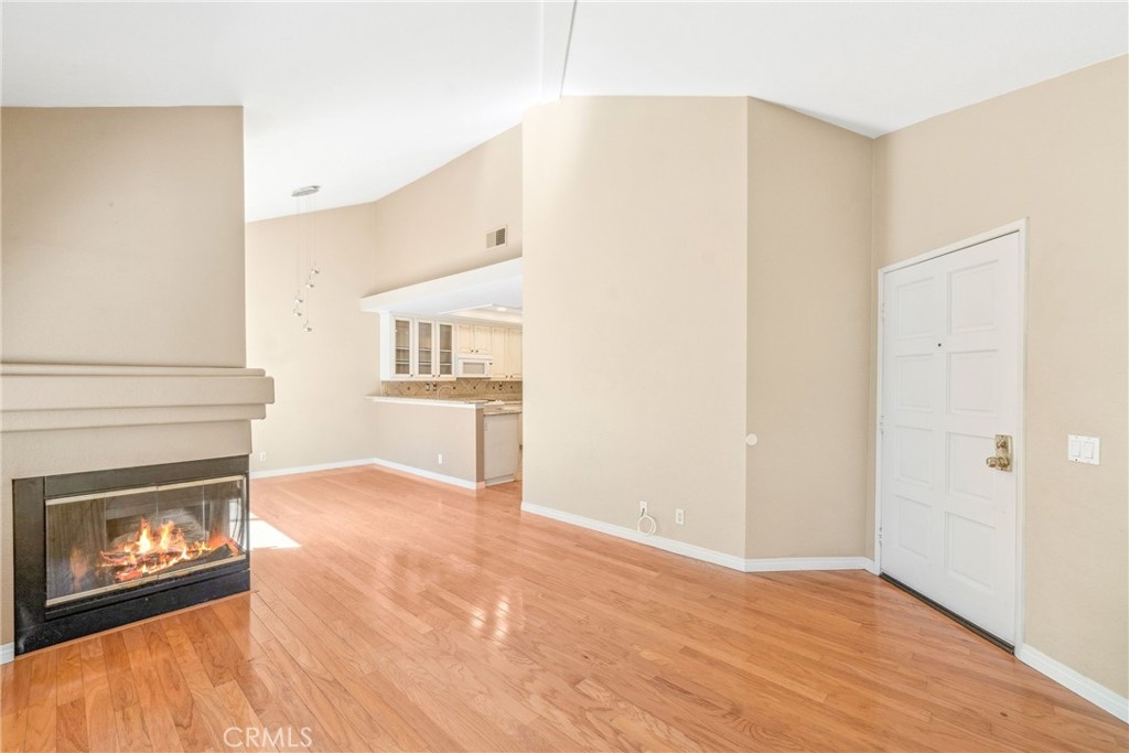 Light, bright and airy is this vaulted ceilings corner upper level condo with great light, a fantastic floorplan and is just steps from the best shopping, dining and entertainment Rancho Santa Margarita has to offer. Situated in the highly sought after enclave of Casafina enjoy sunny afternoons at the community pool and spa complex as well as all the amenities living in RSM provides. From an inviting walk up and spacious landing, with room enough for a café style sitting area, step into a stunning open feel living space with great light from walls of windows that look out to a green hillside with no one looking in. A perk of being on the outer edge of the complex with hills, trees and mountain views. With a cozy fireplace and an abundance of space the living room is open to a stylish dining room, complete with a designer chandelier, which has a large sliding door out to the entertainer’s deck and shares a breakfast bar peninsula with the fully remodeled chef’s kitchen. With warm French cottage inspired cabinetry, a custom tile back splash with inset details, granite counters, recessed lighting, an abundance of prep and storage space and all of this open to the dining room and living room the kitchen has it all. Beyond the living spaces are two large bedrooms, one as a primary with a dual sink vanity ensuite, great light and space and a wall of mirrored closets, a guest bath and a laundry/mechanicals room complete the interior living spaces. A single car attached garage and an assigned parking space are included with the unit. Enjoy enviable access to a multitude of community and RSM lifestyle conveniences, great local schools and an overall fantastic way of life found nowhere else. This is the one! Welcome Home.