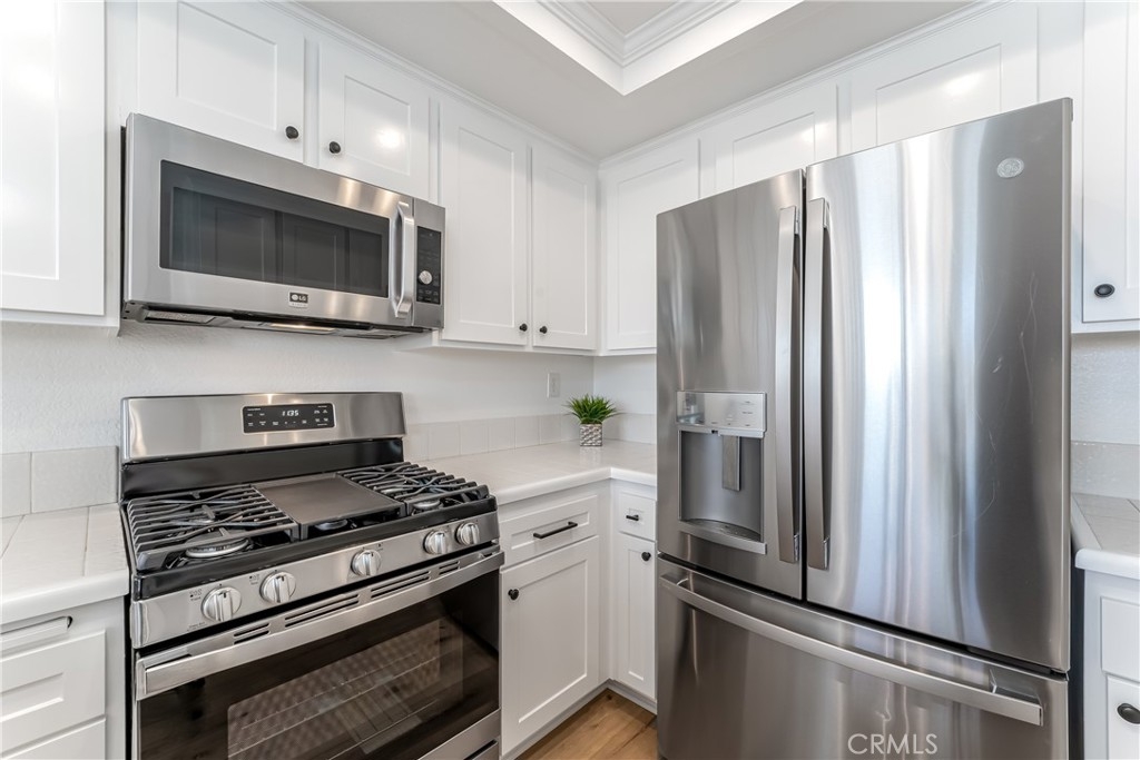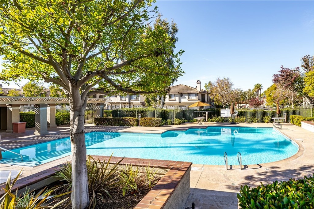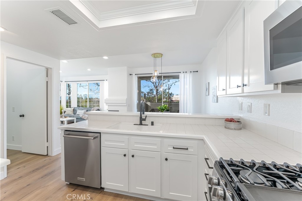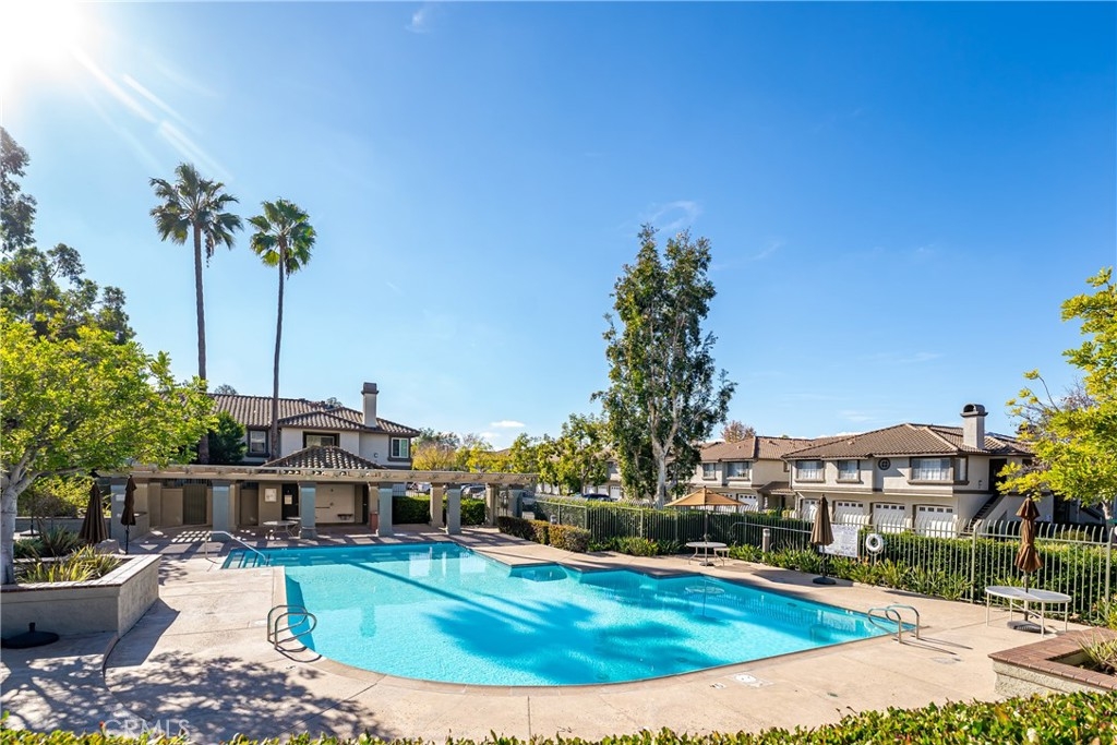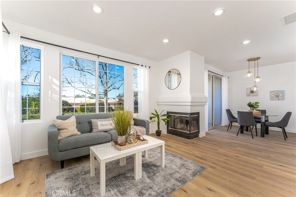 Darling ground level 2 bedroom 2 full baths with a one car ATTACHED GARAGE. End unit tucked in a picturesque corner location overlooking the greenbelt. Feels like your very own backyard. Casafina is a small and highly desirable community located very close to Coto de Caza. As you enter the open and spacious living room you will notice how light, bright and inviting it is. The cozy gas fireplace is a lovely added feature, which separates the dining room; equipped with a beautifully upgraded light fixture, a sliding glass door that gives you access to the entertaining sized patio with peek-a-boo views of the Saddleback mountains, and a counter height bar that opens to the updated kitchen. The kitchen includes: New refaced white cabinets with sleek modern black hardware and matching faucet, brand new stainless steel oven & microwave, stainless steel refrigerator (less than a year old), and recessed lighting. So many other upgrades include: All new LVP flooring & baseboards throughout, beautiful new dual pane windows in living room, new water heater replaced in 2023, and newer A/C replaced in 2020. Freshly painted throughout: All doors, walls, vanities, and cabinets. Brand new black door handles upgraded to give it an updated finishing touch. Both bedrooms include ceiling fans and window coverings. The primary bedroom is spacious with dual closets, en-suite bathroom w/ separate toilet area, dual sinks, and soaking tub. Both bathroom shower heads were also recently upgraded. A bonus closed door laundry room with full size washer and dryer is located off the attached garage. The garage contains added shelving and a spacious closet providing ample storage space. This beauty is perfect in every way! Very close to the pool, sits in the heart of RSM, close proximity to RSM Lake, Beach Club and within walking distance of many shops and restaurants.