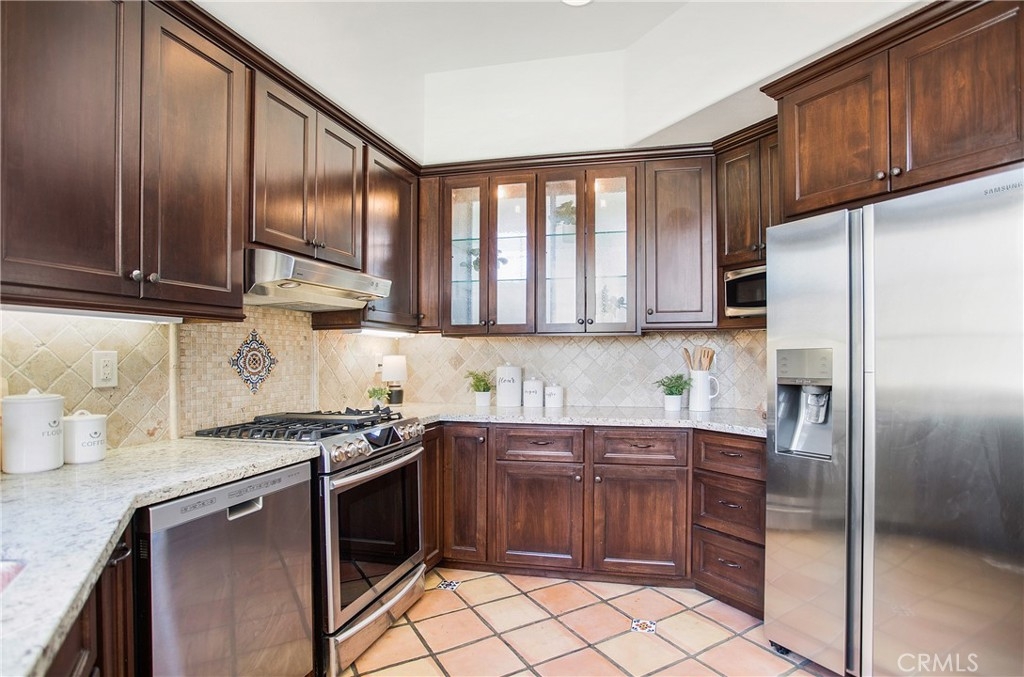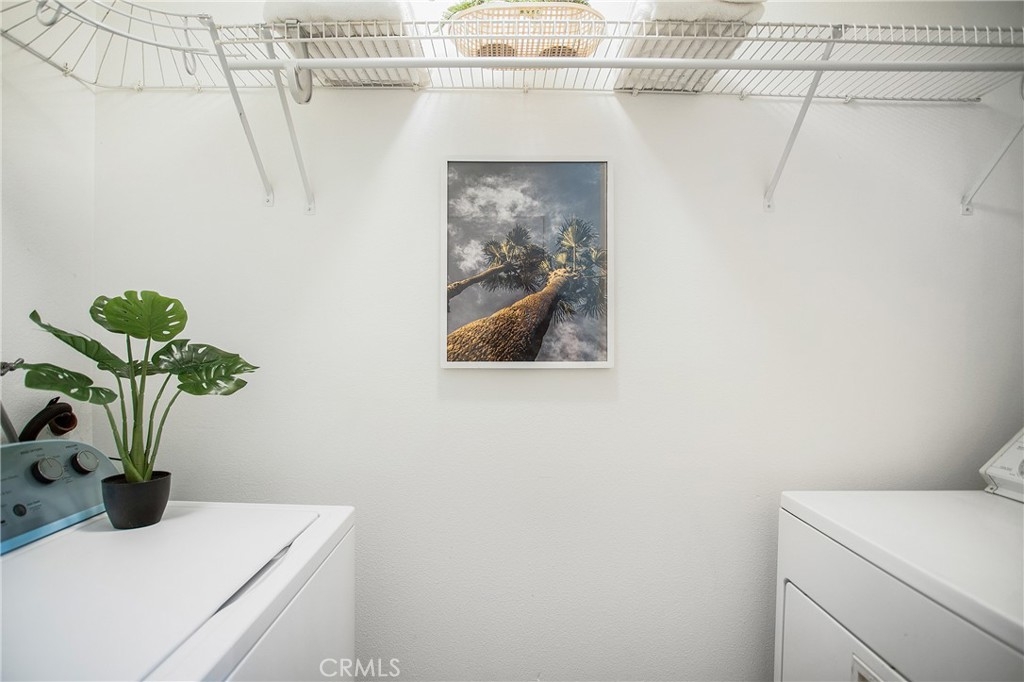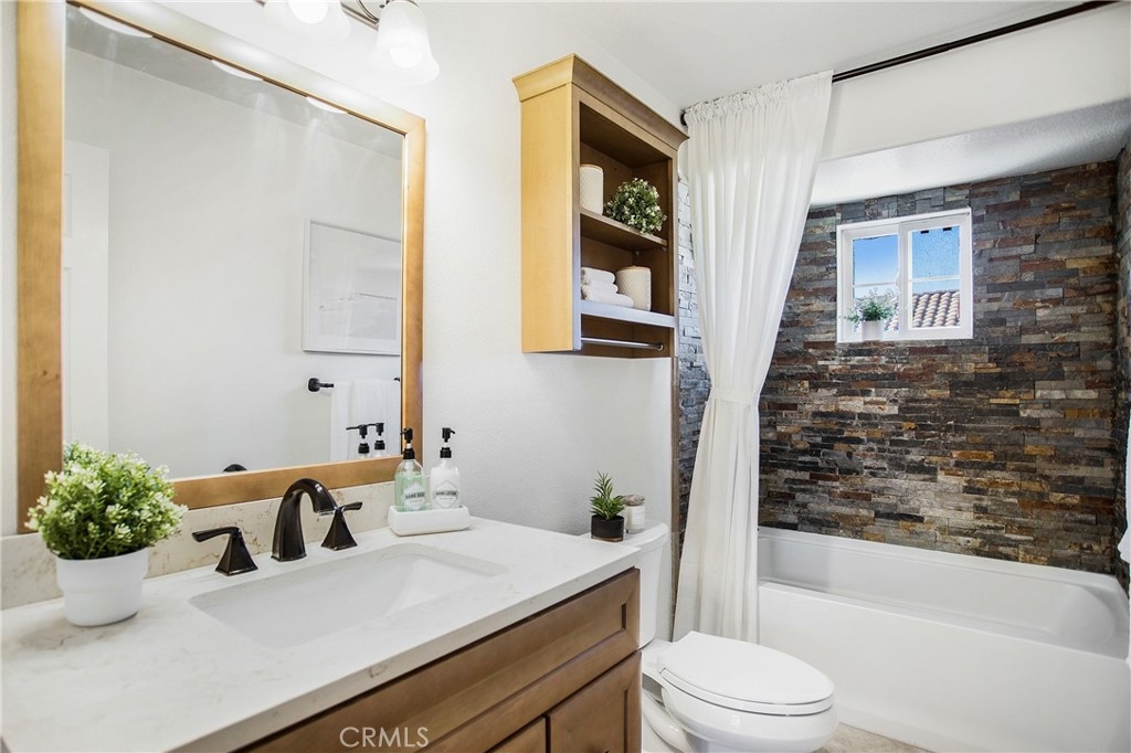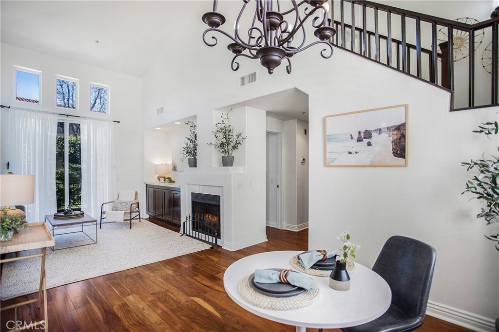 Welcome Home ~ A lovely Corte Melina residence located in the heart of Rancho Santa Margarita. Tastefully upgraded 2 bedroom, 2 bath home offers attractive finishes throughout. Crisp white walls, cathedral ceilings, wrought iron banisters, sconce and chandelier lighting, gorgeous warm-toned hardwood flooring in the living, dining and bedroom areas with exquisite Saltillo Terracotta Tile, featuring decorative Mosaic accents in the kitchen and bathroom. The exceptionally bright open floor plan seamlessly connects the living, dining, and kitchen areas with an abundance of windows and sliding door, to a large private balcony ideal for relaxing, barbecuing and entertaining, with views of mature hillside landscape ~ a peaceful retreat. A media center inset with recessed lighting, built-in cabinets and a gas burning fireplace are perfectly positioned to create an ideal living room layout. The kitchen offers plenty of counter space and storage with custom cabinets including glass displays and under-mount lighting, stainless steel appliances, granite countertops and travertine backsplash. The spacious main-level bedroom can easily be used as a home office, featuring new closet doors, custom shelving and direct balcony access through a dual pane slider, allowing plenty of natural light. The main level bathroom includes a custom sink, large bathtub, travertine tile, decorative pendants and recessed lighting. The private Master retreat is conveniently located upstairs, complete with custom shutters, ceiling fan, and dual mirrored closets with built-in shelving. The Master bath is tastefully designed with travertine tile, a large tub, quartz countertops, coordinating vanity and an open shelf cabinet. A lower-level laundry area with built-in storage is conveniently located near the attached single car garage with multi-purpose flex space and a newer LiftMaster aluminum garage door. Additional upgrades include interior paint, dining area blinds, a remote controlled Honeywell Thermostat, Ring Doorbell, Whirlpool washer, and water heater. The washer, dryer, refrigerator, microwave, Ring doorbell, drapery rods, sconce and chandelier lighting are ALL included! Residents enjoy a community pool, spa and fitness center, along with nearby entertainment, parks, hiking/biking trails, pools, RSM Lake, Beach Club Lagoon and more! This well-cared-for, highly upgraded, move-in ready home is waiting for the next homeowner to enjoy!