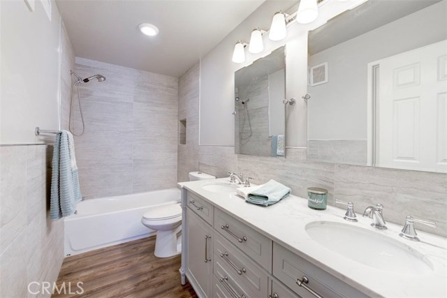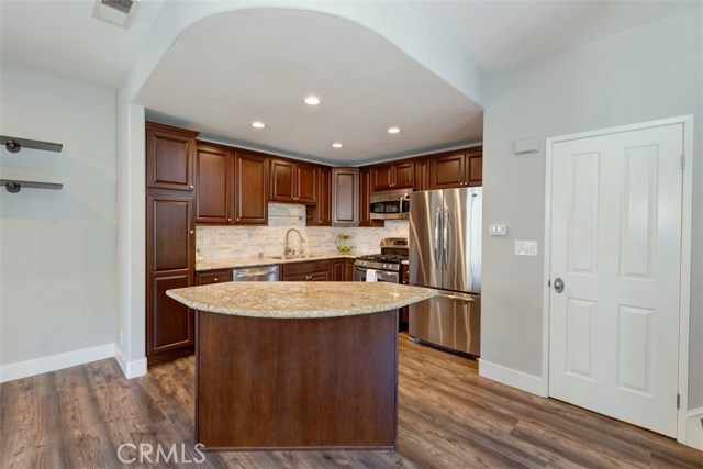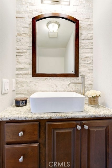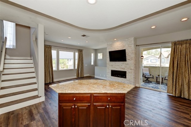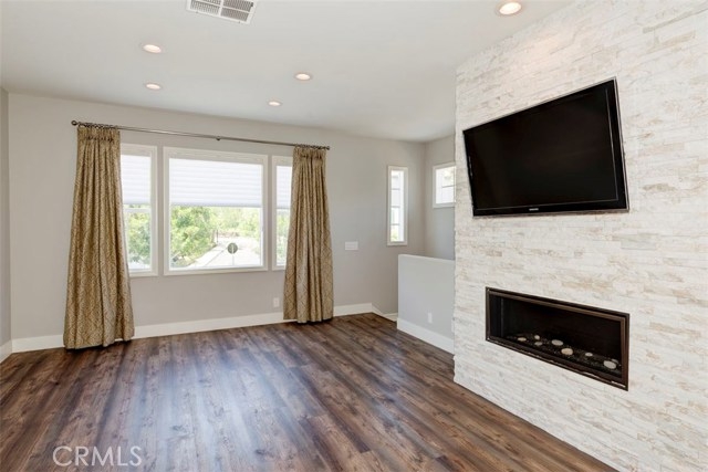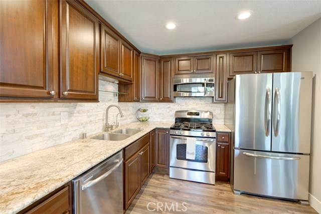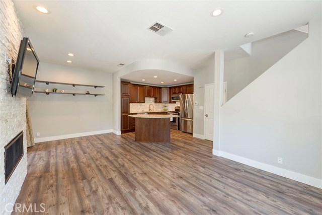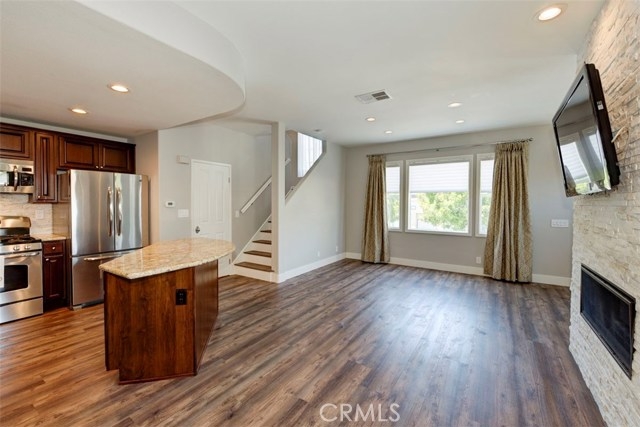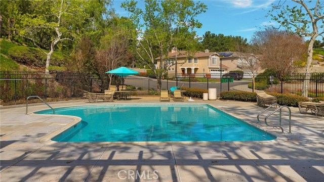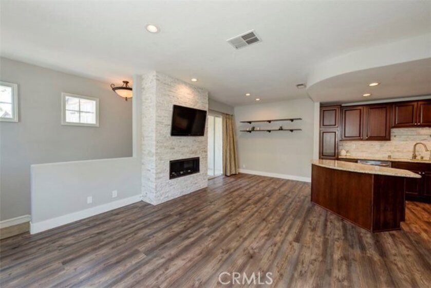 Come and take a look at this modern townhome in the highly sought after community of Wagon Wheel in Trabuco Canyon! This home features 2 bedrooms, 1.5 bathrooms and 1089 sq ft of living space. You will love the stylish luxury vinyl plank flooring, the expresso colored cabinetry, the granite countertops (matched throughout the house), and the beautiful stone backsplash. The home features a lovely fireplace with a custom stone accent wall and a slider to the balcony off the dining area. A modern paint palette throughout enhances the light and bright feel of the home. The spacious bedrooms include ample closet space. Both bathrooms include upgraded vanities. The upstairs bathroom also features a modern tile upgrade in the shower/tub. The home is complete with a one car, attached, direct access garage, and a parking spot. A washer/dryer & refrigerator are included. Enjoy the newly renovated community pool and spa, or the local park within walking distance. Great schools within walking distance. Low HOA and No Mello Roos. FHA AND VA APPROVED. Take a tour today!