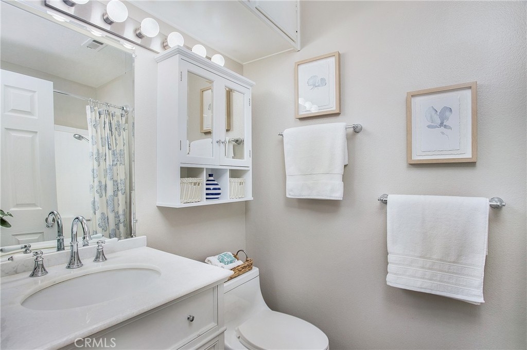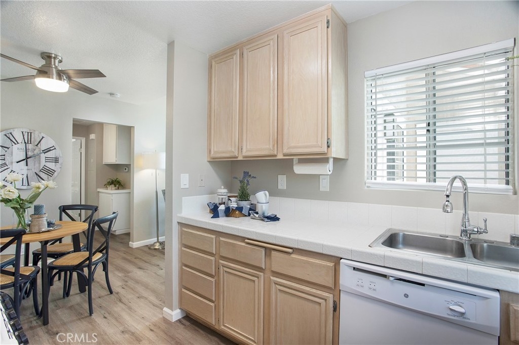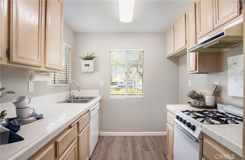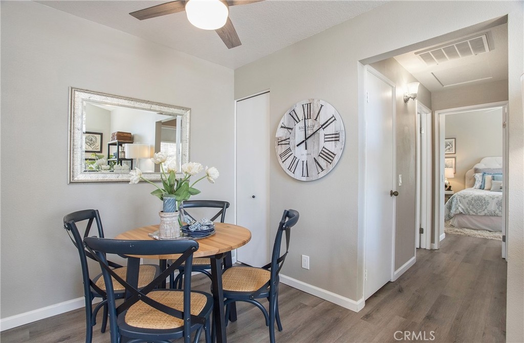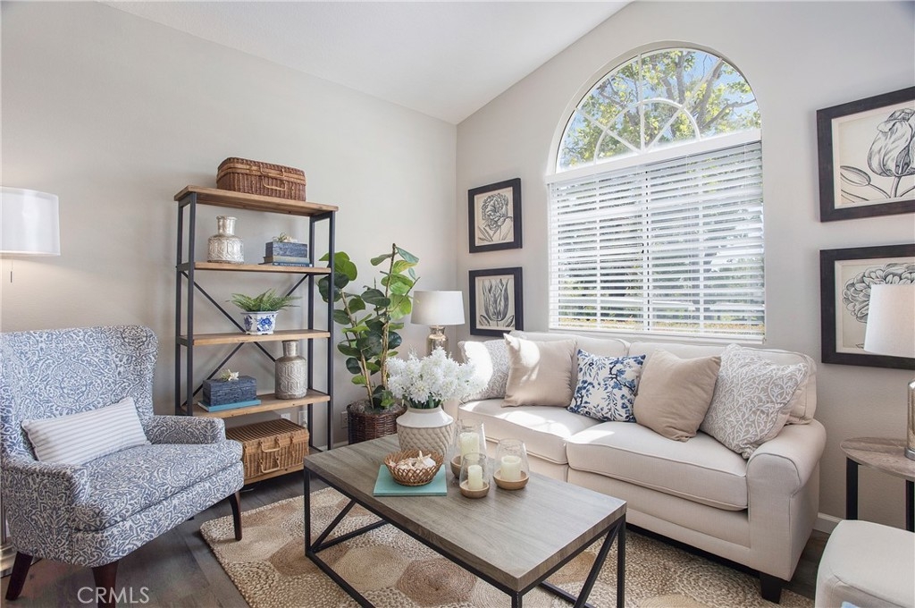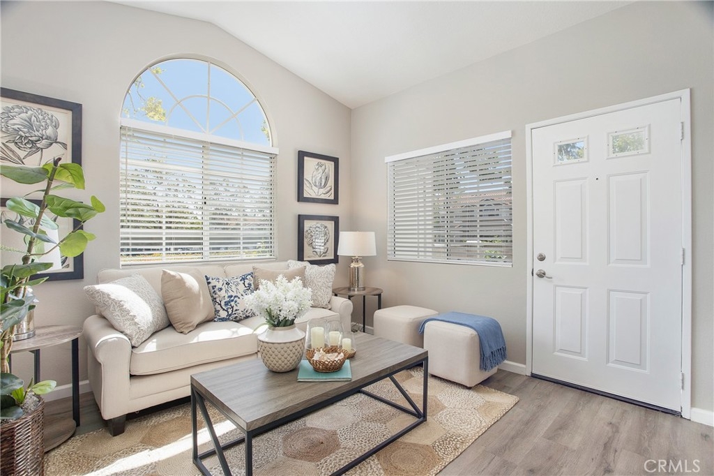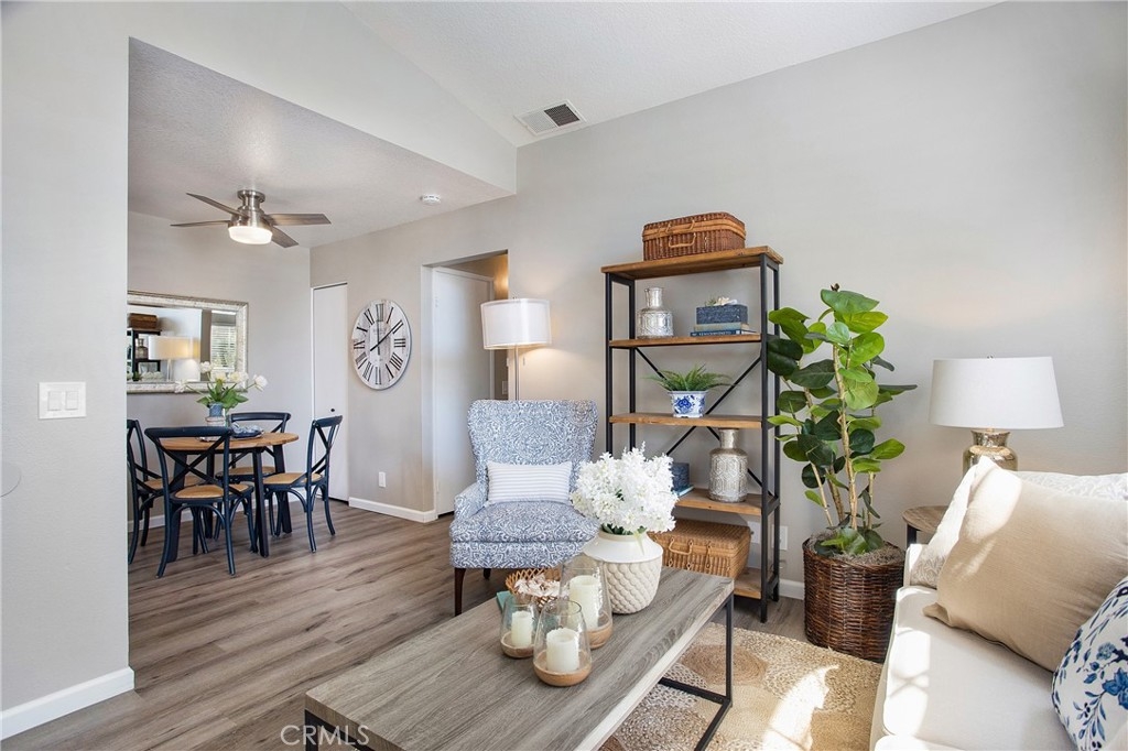 RARELY ON THE MARKET IN LAS FLORES III IS THIS COTTAGE STYLE HOME. Only a few locations within this tract have this end unit that is with no one above or below you. Perfect for SINGLE LEVEL living. Your open parking space is immediately in front of your gated patio entry for easy access, plus there is a carport. The interior has wood, vinyl plank flooring throughout and a neutral paint color to compliment the flooring. The living room has a large window which opens to the front patio and provides an abundance of natural light. A separate dining area connects the living and kitchen space. The washer/dryer hookups are in the hallway closet and are suitable for a stackable set. Both bedrooms offer full sized closets with ample space for storage and each room has a ceiling fan. The full bath is conveniently located off the hallway, between both bedrooms. The amenities in Las Flores III include a pool and spa area. This location provides a plethora of shopping, restaurants, a movie theater and the best part is that your HOA membership includes membership in SAMLARC. The SAMLARC community amenities include 13 community parks, 4 pools, the Beach Club Lagoon, and the Lago Santa Margarita. In addition, SAMLARC Members can take adveantage of 9 trails, a variety of sports fields and courts, picnic shelters, 2 amphitheaters, and an abundance of park space where Members can gather together. RSM is a wonderful place to call home for so many reasons.
