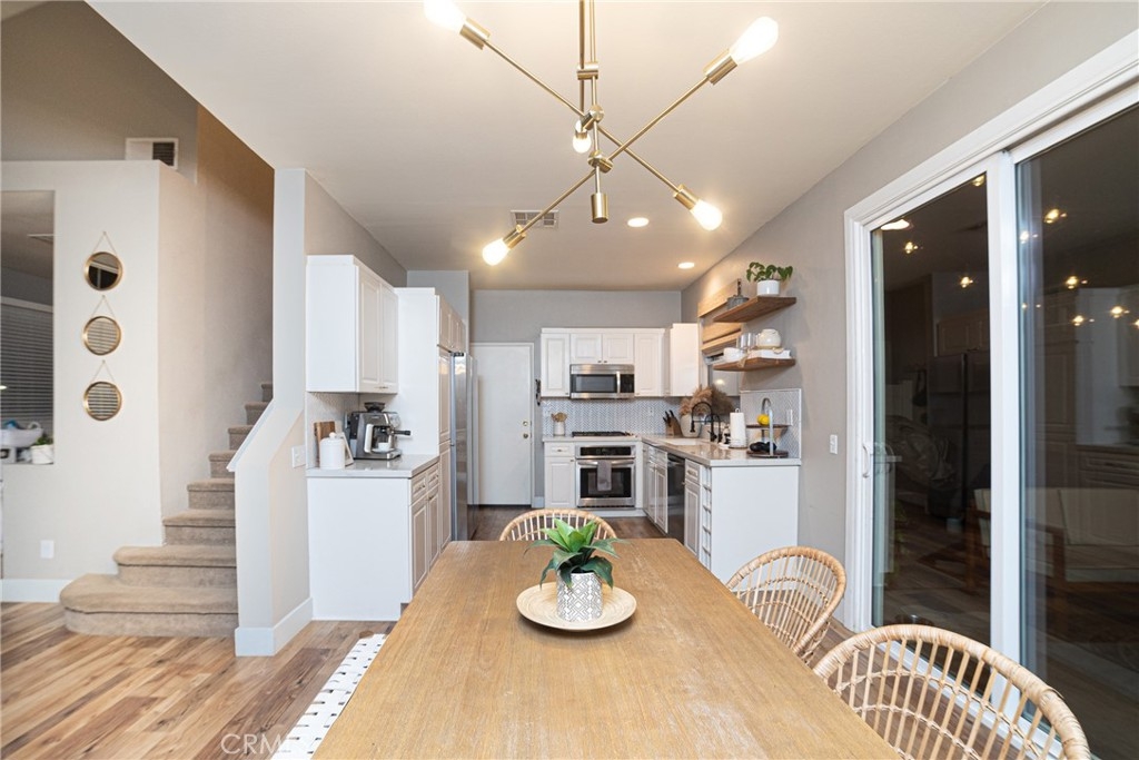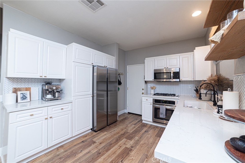 THREE SPACIOUS BEDROOMS AND A GROUND FLOOR OFFICE!! The most sought after floor plan in the highly desired community of Los Abanicos in the beautiful city of Rancho Santa Margarita. This highly remodeled home is turnkey and ready to move in. With three spacious bedrooms, two and a half bathrooms, there is also a downstairs den/office. The open floor plan concept shows light and bright with surrounding slider door (newer) and loads of windows. The STUNNING remodeled kitchen offers quartz counter tops, herring bone back splash, farm style sink, newer stainless steel appliances and floating shelves. There is up to date wood laminate flooring. Beautiful remodeled bathrooms include modern vanities, upgraded hardware and fashionable mirrors. Other accents include contemporary light fixtures and ship lap. All the bedroom closets have Custom Cabinet organization. Replaced air conditioner perfect for Summer heat! Step out to the charming wrap around yard with a newer vinyl fence that creates privacy for entertaining. The grass turf is drought friendly. The garage has tons of storage with attached cabinets and over head storage system. The garage door motor has been replaced. Don't forget to use your green Nest thermostat with the ability to schedule/change your home temperatures from your phone! WALKING DISTANCE to gym, restaurants and centrally located to schools, the 5, 405 and toll road. SAMLARC has the best amenities including BEACH CLUB, pools, parks, out door eating areas, tennis courts, beach club and more!!