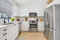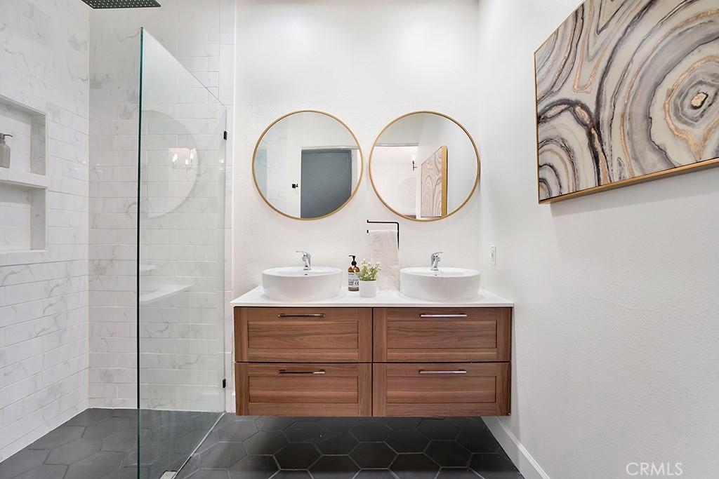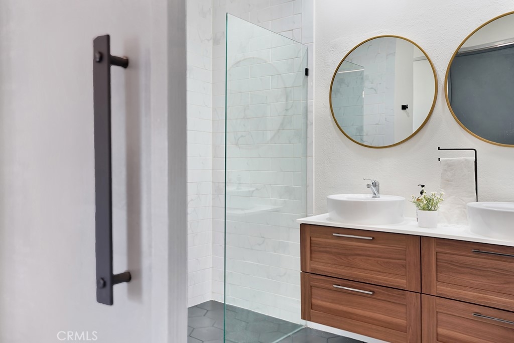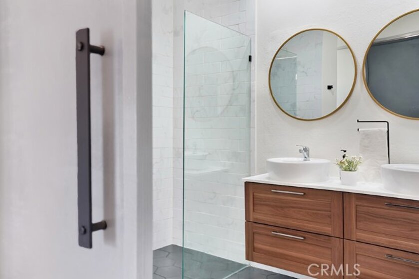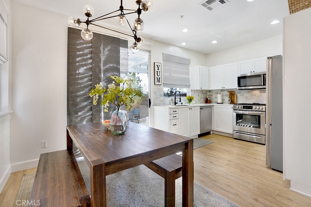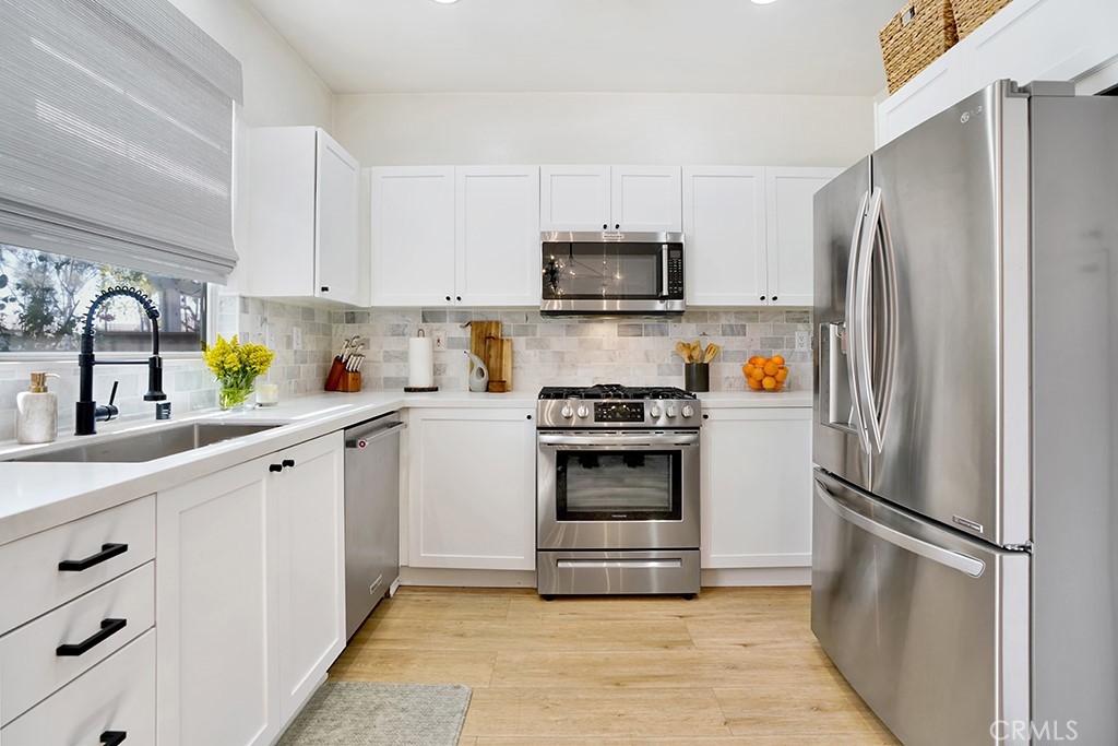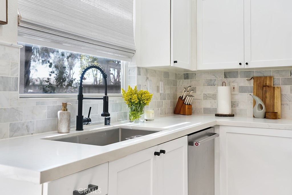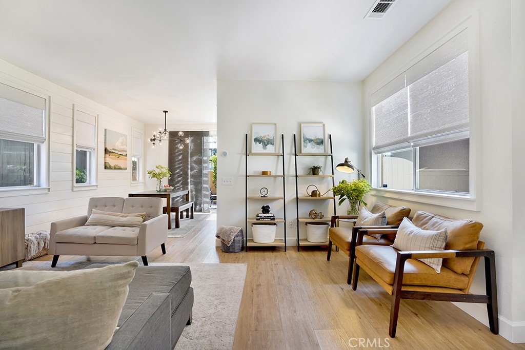 Highly upgraded 3 bedroom 2.5 bathroom detached townhome located in the community of Los Abanicos in Rancho Santa Margarita. When you enter the front door you are greeted with a light and bright welcoming home! Entertain in the spacious living room unique with a floor to ceiling shiplap feature wall! The kitchen opens to the dining area and is highly upgraded. The kitchen includes new modern quartz countertops, real marble subway backsplash, new cabinets doors and hardware, stainless steel appliances, new stainless steel deep under bowl under mount sink with Matte black coil high-arc-pull-down sprayer faucet! The master bathroom includes a barn yard door, frameless shower glass, curb-less entry shower, a rain shower head, and a double walnut vanity. Enjoy the sunshine in one of the largest yards in the community that has been professionally landscaped which includes artificial turf, newly painted privacy fence and new custom side gate. The home includes an extensive amount of upgrades some of which are new modern shaker style doors, all new baseboards, doors and window trims, luxury vinyl flooring with custom real wood stair treads and trim, new woven shades on windows, new modern light fixtures in all bedrooms and dining to name just a few. The community includes one of the lowest HOA's for RSM that includes a clubhouse, swimming pool and tennis courts. Do not miss your opportunity to own this highly upgraded beautiful modern home!