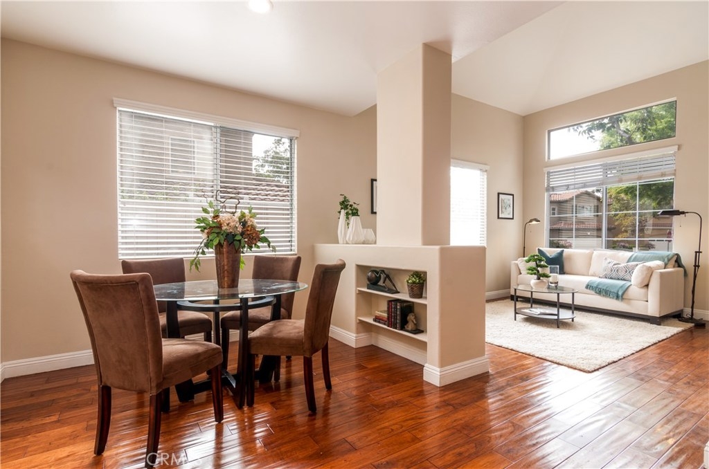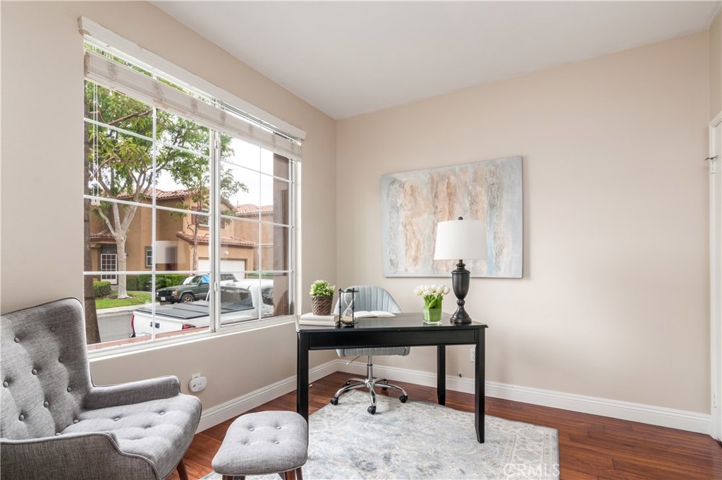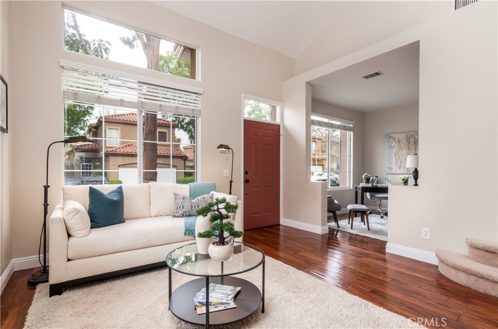 WELCOME HOME to Rancho Santa Margarita and this amazing DETACHED HOME located in the extremely desirable community of Los Abanicos. This 3 bedroom, 2 1/2 bath home WITH a separate office (or 4th bedroom) boasts an open-airy floor plan with high, vaulted ceilings and lots of windows for natural light. The living room has a cozy fireplae and is just the right place to relax with family and friends. The kitchen with its adjoining dining room is just perfect to host family meals and get togethers. The kitchen has granite countertops and beautiful wood cabinets with pull-out drawers in the pantry. Stainless steel appliances and lovely tile floors finish off the room. The large slider opens out onto a private backyard that has just the right amount of space and privacy. Enjoy summer nights BBQing in the backyard or just relaxing after a long day! Also downstairs is the den/office with the half bath. Upstairs, the home features the master suite with the master bath that has dual master sinks, plenty of cabinet space, walk in closet and tub/shower combination. The two secondary bedrooms are a great size and share a second full bath upstairs. Other features of the home are the hardwood floors downstairs, two car attached garage & laundry area. This home is centrally located in the heart of the city close to shopping, restaurants, theater, pools, parks, schools, lake and so much more. Come see this gorgeous home and make it your own today!