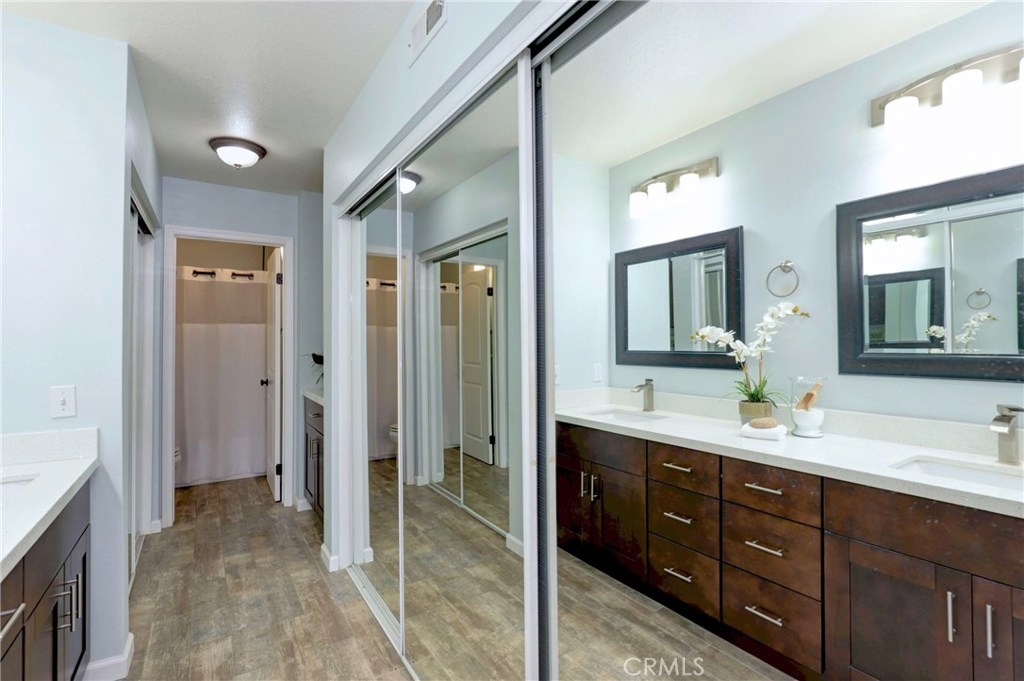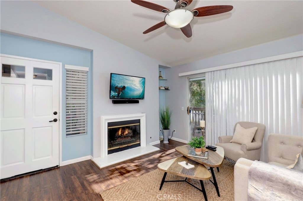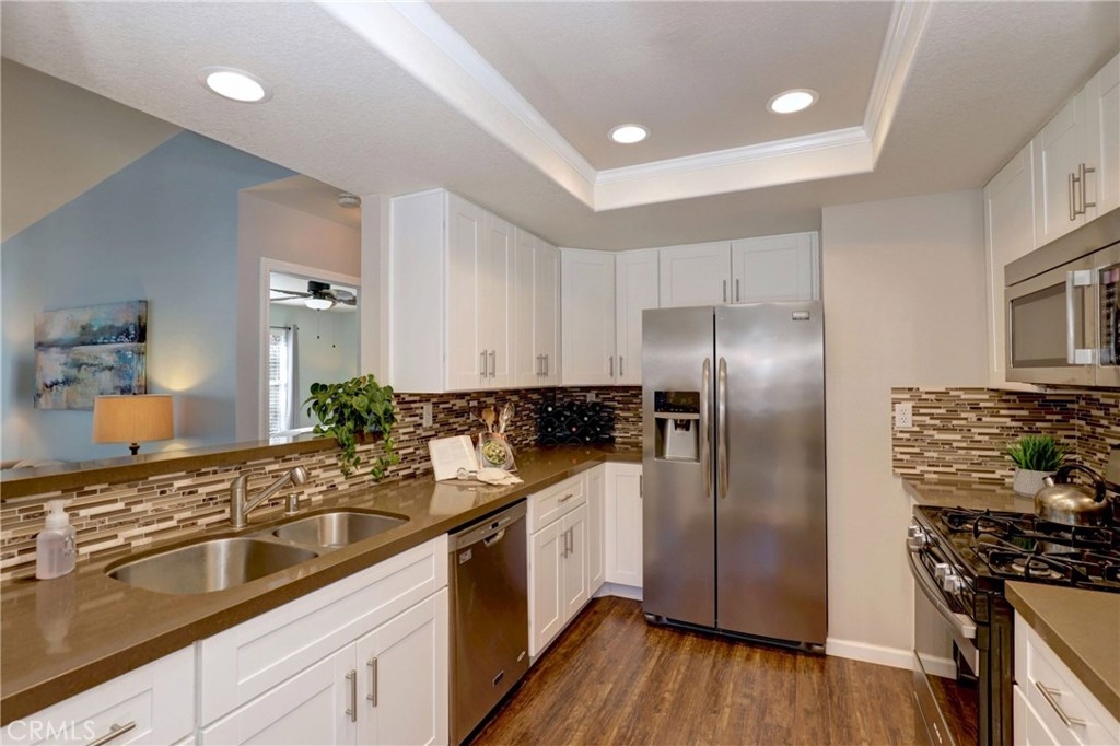 FANTASTIC TURNKEY TWO BEDROOM, TWO BATH HOME WITH ALL THE GREAT AMENITIES OF RANCHO SANTA MARGARITA! This perfectly situated upper end unit offers an enviable eastern exposure providing nice morning light. This is truly a must see first home opportunity, downsize option or a perfect income property investment! Beginning with a welcoming porch landing, enter to a light and bright great room with vaulted ceilings, neutral designer paint and updated laminate wood floors, both of which continue throughout the home. With a focal point fireplace, the living room opens to a large shady deck with plenty of space to relax or entertain. Next is the dining room which has an abundance of light and is opposite a fully updated chef’s kitchen which has a mosaic glass tile backsplash, quartz counters, stainless steel appliances and updated lighting, hardware and fixtures. Combined with the living room, the sizable kitchen will be the heart of the home where everyone will gather. Beyond the living area, is the spacious master suite and a beautiful updated spa-like bath which includes a quartz dual sink vanity, a privacy door to the toilet and shower and a wall of mirrored closets. Opposite the living areas is the second bedroom, an updated guest bath, inside upper level laundry and a stairway to the direct access single car garage. A detached carport is also included. Located near shopping, restaurants and hiking trails with access to fabulous community and RSM amenities! This is a must see!