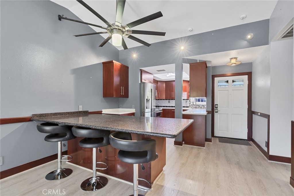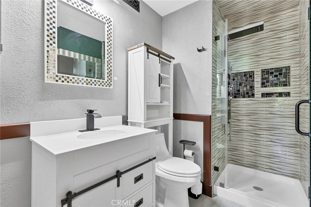 Welcome to 42 Abrigo in Rancho Santa Margarita, located in the desirable Los Portillos community. This beautifully upgraded upper-level 2 bedroom, 2 bathroom 1-car detached garage with abundant overhead storage and 1 carport #34. The home showcases gorgeous upgrades throughout, creating a move-in-ready space with a warm and inviting feel. The thoughtfully expanded chef’s kitchen is a standout feature, designed for both functionality and entertaining. It features rich cherry cabinetry with soft-close drawers and doors, quartz countertops, and a large peninsula island that provides generous workspace, storage, and seating. The kitchen flows seamlessly into the dining and living areas, enhancing the home’s open and practical layout. The primary bedroom offers a private en-suite bathroom, ample closet space, and new mirrored wardrobe doors that add both elegance and functionality while enhancing the sense of space and light. The primary bath also features new mirrored wardrobe doors for a cohesive and updated look. The secondary bedroom is ideal for guests, a home office, or flexible living needs. The exquisitely fully remodeled second bathroom is a true showpiece, featuring a beautifully designed walk-in shower with high-end finishes, modern fixtures, and elegant detailing that elevate the space with both style and sophistication. The home is finished with a combination of laminate and carpet flooring and includes a newer A/C, furnace, tankless water heater, and water softener for year-round comfort. The community was recently repiped, providing added peace of mind. Enjoy the privacy of an upper-level unit, just steps from the Arroyo hiking trail, with easy access to shopping, dining, parks, and award-winning schools. An excellent opportunity to own a beautifully upgraded home in the heart of Rancho Santa Margarita’s Los Portillos community.