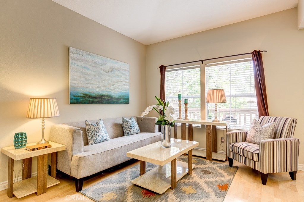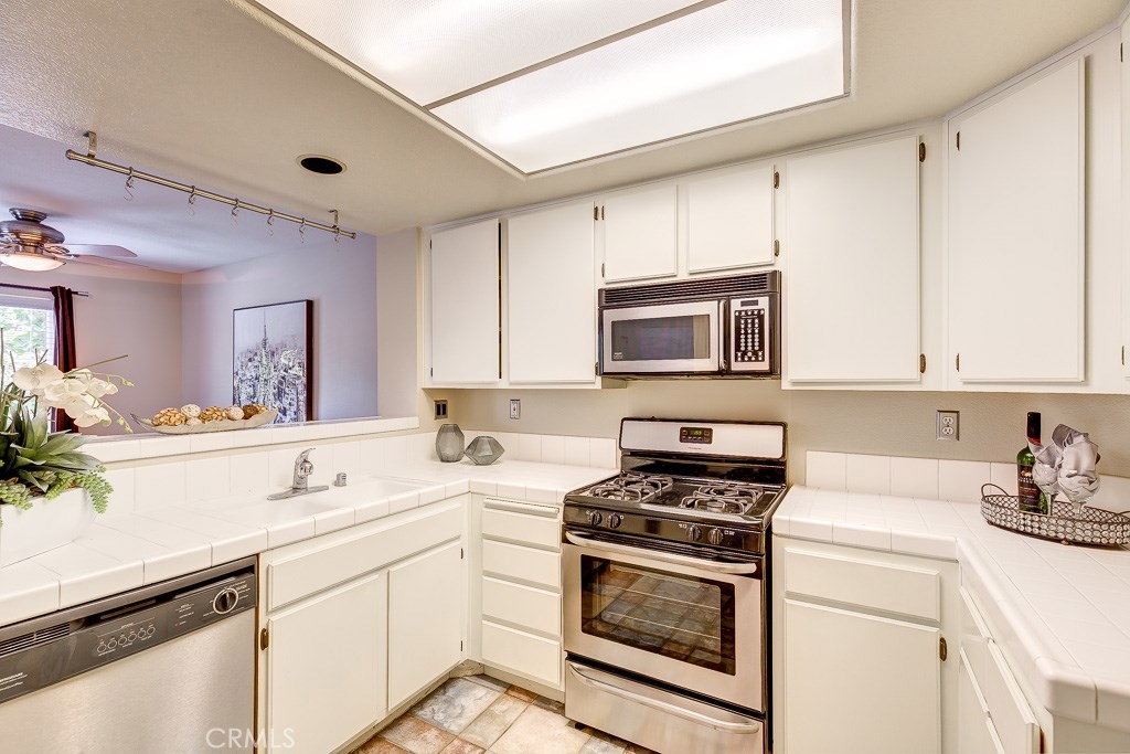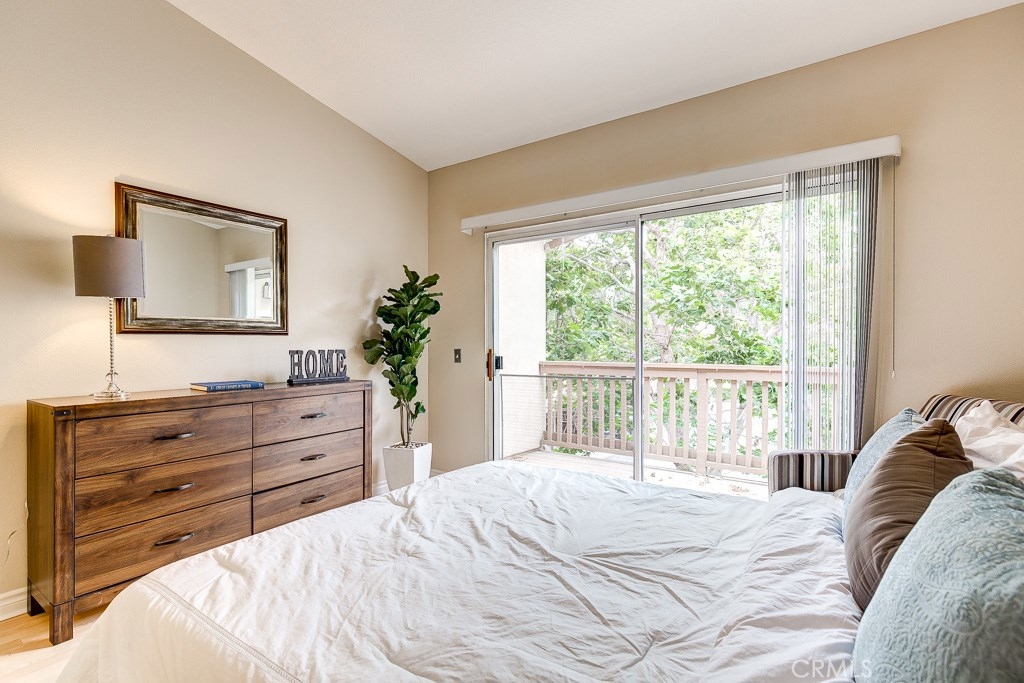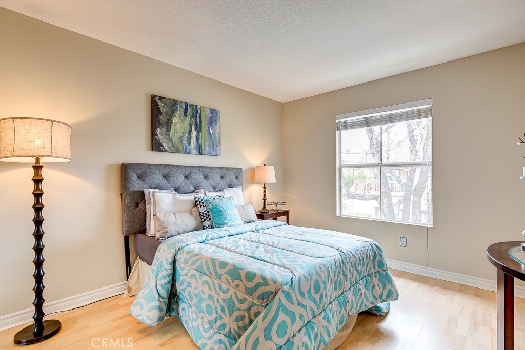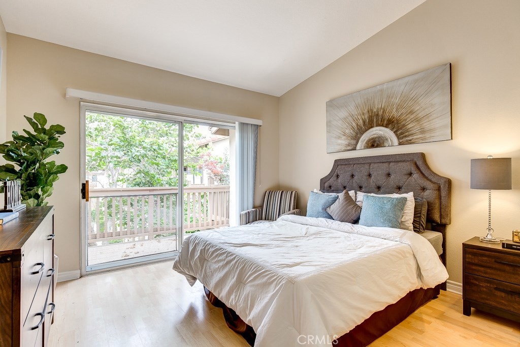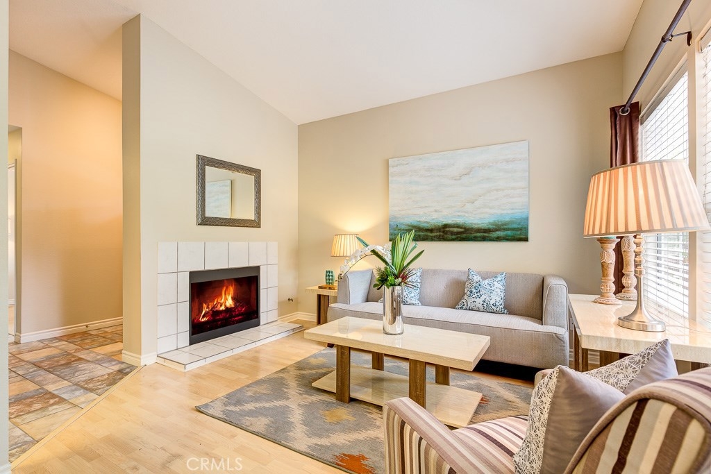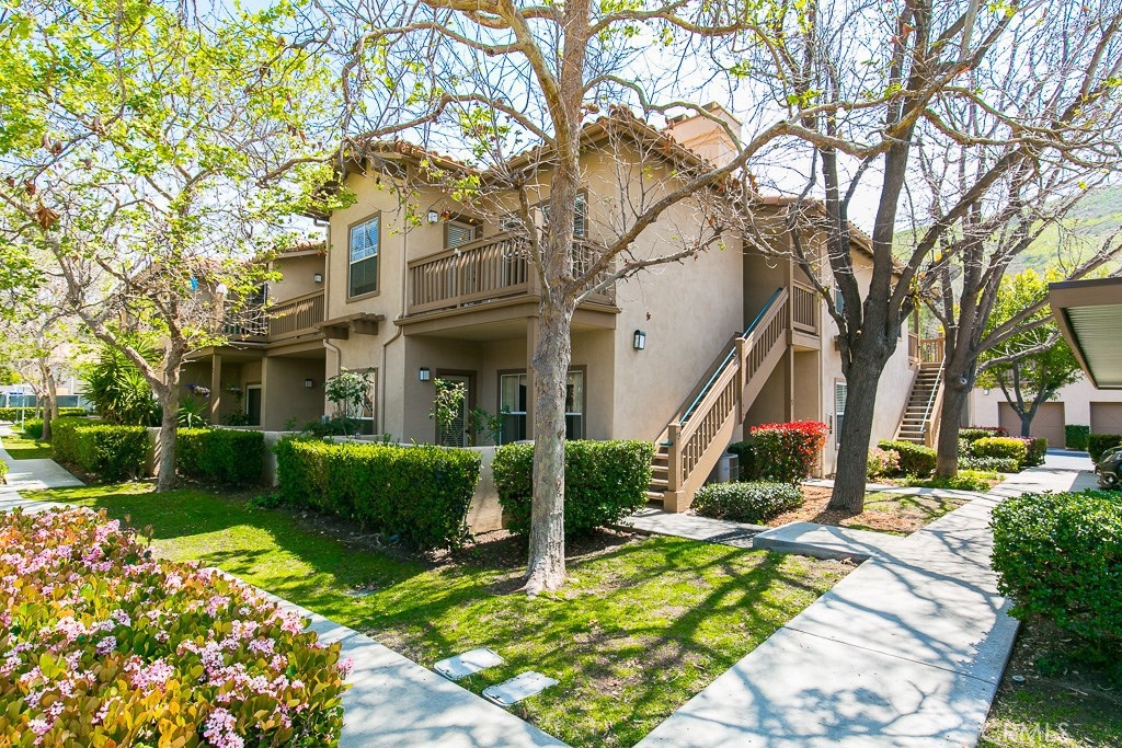 Opportunity knocks in the heart of Rancho Santa Margarita! Spacious 2 bed/2 bath upper level end unit with a direct access one car garage and one assigned carport. Prime, interior location. Volume ceilings with lots of light. Desirable open concept floor plan. Living room has fireplace and door out to balcony. Separate dining area. Kitchen features a breakfast counter and stainless steel appliances. 2 spacious bedrooms. Master has a private balcony, mirrored wardrobes, and bathroom with soaking tub and dual vanities. Laminate wood and tile flooring throughout. Freshly painted interior. Enjoy the community pool and spa and nearby parks, RSM Lake and hiking & biking trails. Conveniently located in central RSM, near shopping, dining and entertainment. Easy access to the 241 toll road. Excellent first time buyer or investor opportunity.