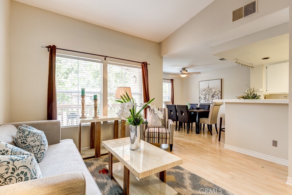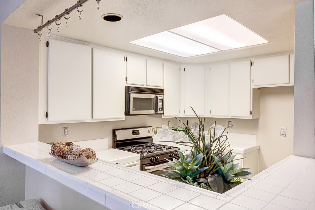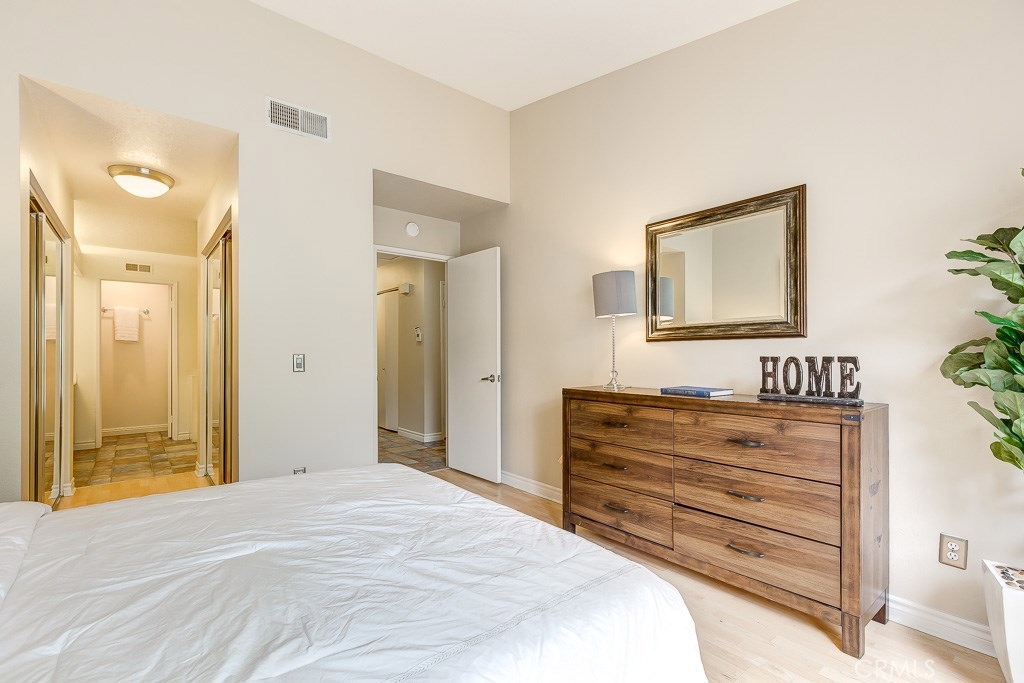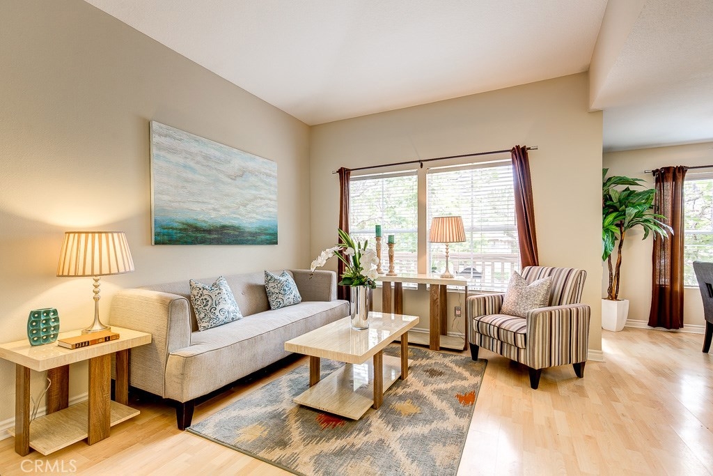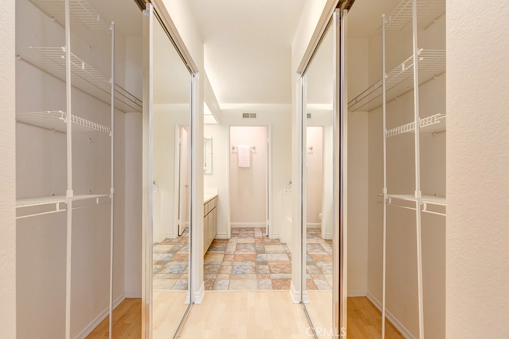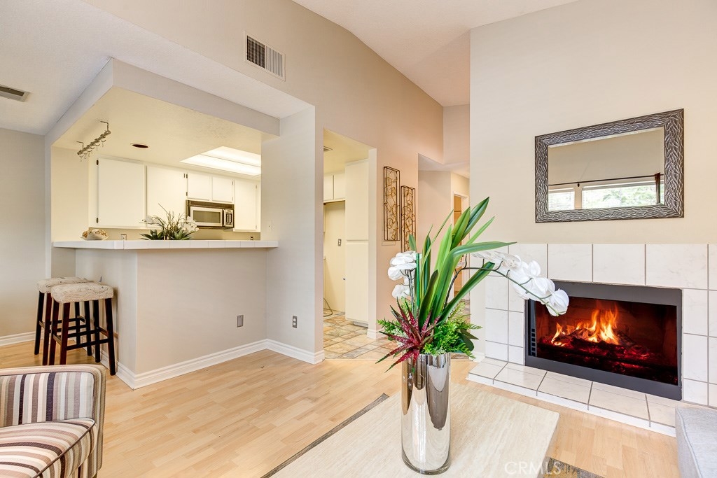 Opportunity knocks in the heart of Rancho Santa Margarita! Spacious 2 bed/2 bath upper level end unit with a direct access one car garage and one assigned carport. Prime, interior location. Volume ceilings with lots of light. Desirable open concept floor plan. Living room has fireplace and door out to balcony. Separate dining area. Kitchen features a breakfast counter and stainless steel appliances. 2 spacious bedrooms. Master has a private balcony, mirrored wardrobes, and bathroom with soaking tub and dual vanities. Laminate wood and tile flooring throughout. Freshly painted interior. Enjoy the community pool and spa and nearby parks, RSM Lake and hiking & biking trails. Conveniently located in central RSM, near shopping, dining and entertainment. Easy access to the 241 toll road. Excellent first time buyer or investor opportunity.