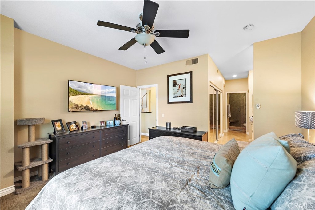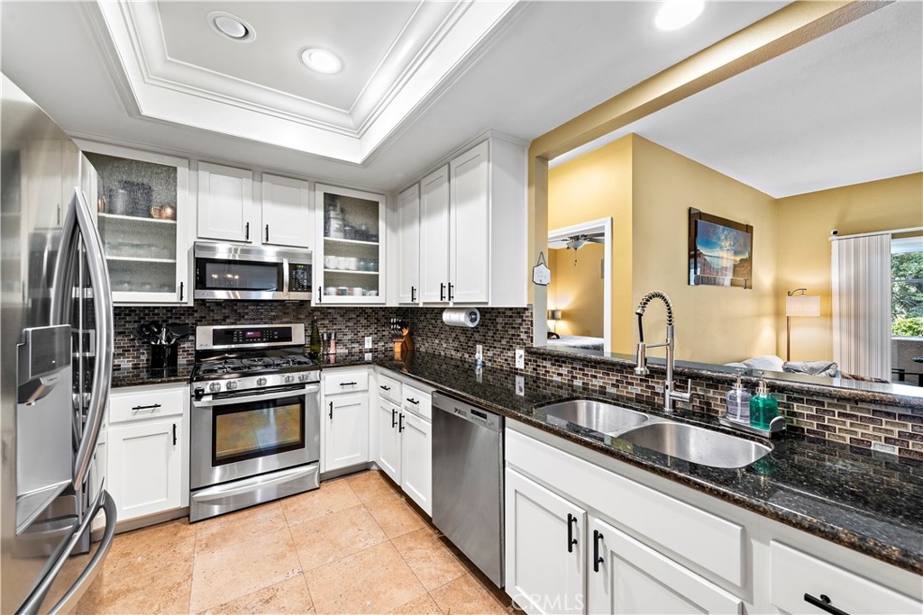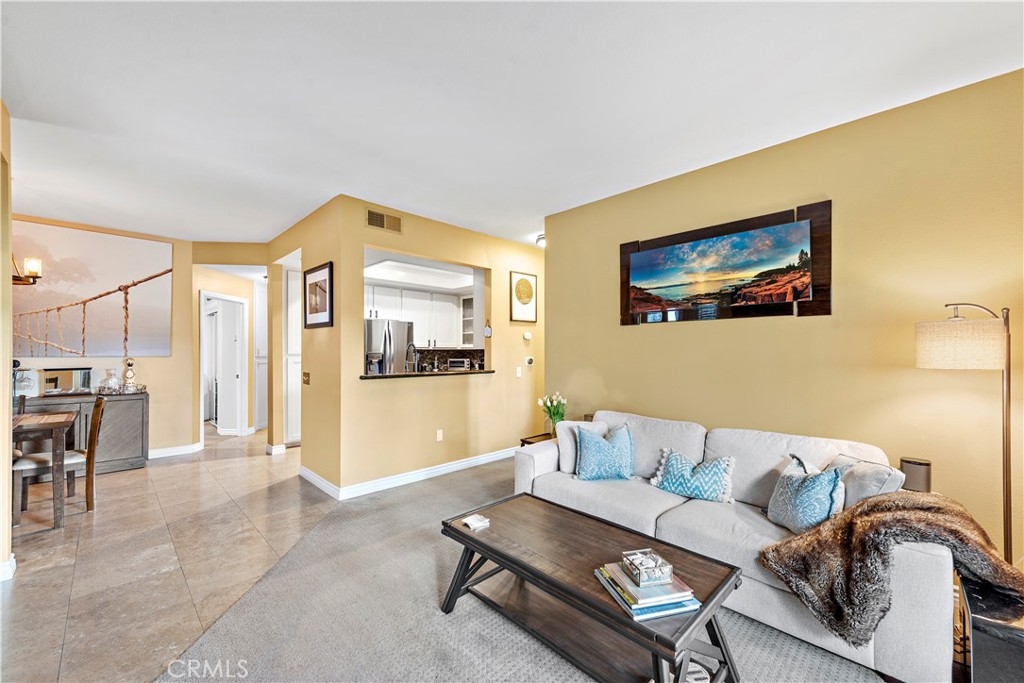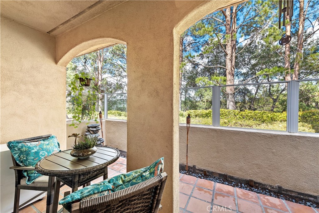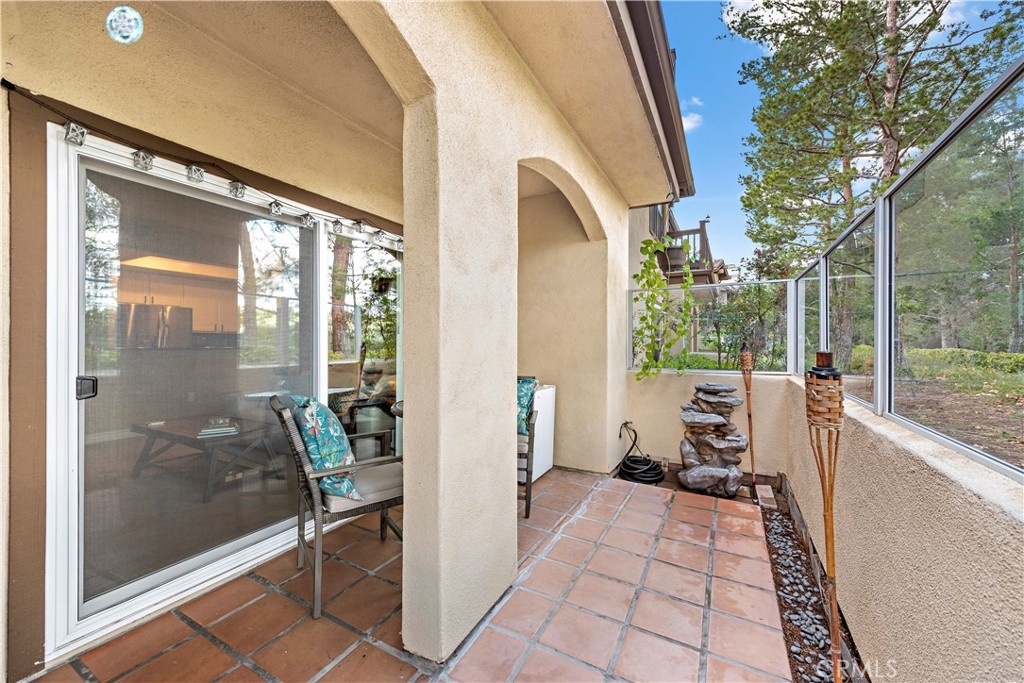 Perfect turn-key starter home or investment. End unit home with ample natural lighting coming through the vinyl windows and sliders. Located in a wonderful location in the community, it's private and quiet with an enjoyable outdoor patio backing to greenery. This ground floor home features no steps. Once you enter you'll notice the high quality upgrades with thoughtful renovations. The home is in pristine condition and along with the high ceilings, help the open floor plan feel much larger. The kitchen features custom cabinetry, granite counters, stainless steel appliances and travertine flooring which flows into the dining room. The kitchen is open to the spacious living room that boasts a custom entertainment center. The large primary bedroom is a wonderful sanctuary. It features a view of greenery from the window and an envious attached primary bathroom with a tiled step-in shower and dual sink vanity. An added bonus is indoor laundry that will accommodate a stackable full size front load washer and dryer. The garage is direct access and storage is abundant. Wonderful community located close to entertainment and shopping as well as toll road and freeway access. Rancho Santa Margarita has amenities for everyone to enjoy; many parks and playgounds, numerous pools - some heated year round, beach club, tennis/pickball courts and sports parks.