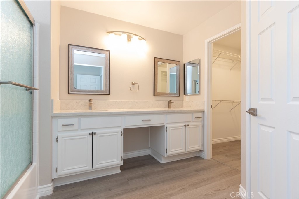 Great location and floorplan!! This 3 bedroom detached home is conveniently located in the highly sought after neighborhood of Magnolia Lane in Rancho Santa Margarita/Las Flores. The downstairs features an open concept living/dining/kitchen space with recessed lighting and a beautiful statement fireplace. The kitchen has been tastefully updated with quartzite countertops, stainless steel appliances and white cabinetry with beautiful glass uppers. Brand new neutral paint throughout as well as luxury vinyl plank flooring and brand new carpet in all bedrooms providing the perfect neutral palette. Dual pane windows and white plantation shutters set off the home. Upstairs, the master suite features a large walk in closet and spacious dual sink vanity that has been updated with quartzite countertops, wall sconce, stainless steel faucets and framed vanity mirrors. There is also a shower/tub enclosure to round out the space. The 2 secondary bedrooms enjoy plenty of natural light from the large windows as well as ample closet space. The shared hallway bathroom has also been tastefully updated with quartzite countertops, stainless faucet and beautiful light fixture and mirror. Outside, enjoy the wrap around rear patio with outdoor fireplace, lush landscaping and beautiful custom hardscape. Attached direct access 2 car garage with epoxy floor and laundry hookup. The home has been partially re-piped. Magnolia Lane is a wonderful community w/ a pool, spa, fire pits, BBQ area and splash pad. Conveniently located near top rated schools, toll road, hiking trails and shopping centers. A must see, this one will go fast!