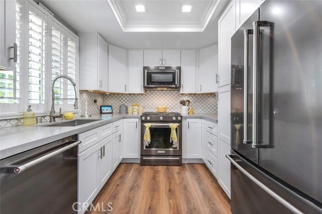 Welcome to your light and bright upgraded home!! This beautiful upstairs corner unit has been upgraded with high-end appliances including a beer and wine refrigerator and gas range, quartz counters, recessed lighting, luxury vinyl floors, a breakfast nook, an upgraded kitchen and bathrooms. All windows are newer (installed within the last two years), with gorgeous 4-inch wood plantation shutters. The living room and primary bedroom have vaulted ceilings. Luxury vinyl flooring extends through both bathrooms which are further upgraded with stunning vanities. The primary bathroom has double sinks, a walk-in closet, and a secondary closet with mirrored doors. The second bedroom has custom built-in shelving, lighting, and drawers. The second bedroom has a large closet with mirrored doors as well! Modern ceiling fans adorn many of the rooms. To make a great home even more incredible, it is one of the rare units in the community that has two single detached garages. Both garages are close to the unit, with high ceilings and loft storage for plenty of storage space. This lovely home comes complete with a recently installed water heater and newer 2.5 ton AC unit and furnace. You will find yourselves lucky to be looking down to lush greenbelt and trees instead of facing out to the main streets. This community has a private pool, tot lot, and ample parking. Walk across the street to Lake RSM, the Beach Club, grocery stores, and great restaurants. RSM has 13 community parks, four community pool facilities, a lake, a skate park, and a dog park. This is an ideal home to buy for your family, first home, or as an investment.