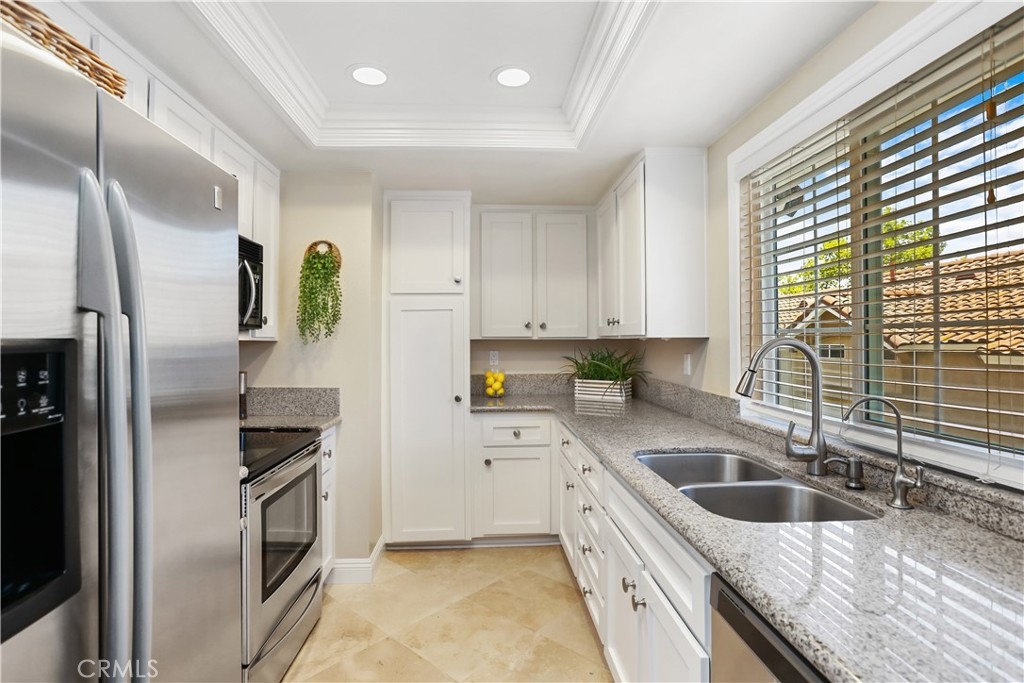 Welcome home to this beautifully remodeled, bright and cheery, 2BR, 2BA condo in the sought-after community of Mission Courts, with the perfect floor plan and 1-car garage. From the moment you step into this move-in-ready home, you will enjoy plenty of natural light, high ceilings, and the most functional layout where everything has been elegantly upgraded. The spacious front patio, great for entertaining, welcomes you into the home where you are greeted by a spacious living room with high ceilings and modern fireplace with multi-color flames (and so much more), gorgeous LVP floors throughout, crown molding and recessed lighting, leading into the spacious dining room with large, new windows. Continue on to the newly remodeled kitchen with new white shaker style custom wood cabinetry, pantry, granite counter tops, and stainless-steel appliances with Italian travertine marble floors. Down the hallway you will find the linen closet, spacious secondary bedroom with wall-to-wall mirrored door closets and plenty of natural light. You’ll also find the secondary full bathroom completely remodeled with new granite countertop vanity and new tub with frameless glass shower enclosure, including the stackable washer and dryer. At the end of the hall, you will be greeted by the spacious master suite with direct access to secondary patio/balcony and newly remodeled master bathroom with his and hers dual sinks, granite counter tops, with new marble floors. Noteworthy upgrades include new windows, new window coverings, new flooring, crown molding, recessed lighting, new kitchen cabinets, granite counters, newly remodeled bathrooms with marble tile enclosures and new frameless shower doors, ceiling fans, new HVAC system, stainless steel appliances, 1-car garage plus additional permitted parking space. Also enjoy RSM Lake, Beach Club, parks, playgrounds, pools, courts, hiking, biking trails, and TOP-RATED SCHOOLS. Centrally located w/quick access to shopping, freeways, near parks, pool and spa. No Mello Roos, low HOA.