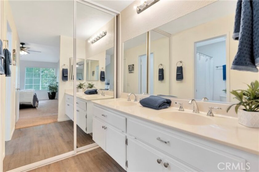 Great view of the hills and city lights from this upstairs end unit. Spacious living room with gas fireplace. Dining area off kitchen with bay style window. Impressive floorplan with dual master suites with their own bathrooms and closets. Vaulted ceilings, laminate wood flooring in kitchen and dining area, neutral carpet in bedrooms. Property recently updated with new flooring, newer AC unit, new paint, and more. Great location on greenbelt within walking distance of pool and spa. Lake RSM, walking trails, playground, swimming, and more within 1/4 mile of community. You'll love being a part of such a wonderful community! Located minutes away from shops and schools. FHA AND VA approved community.