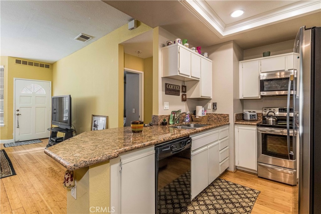 Welcome to this beautifully maintained condo in the Mission Courts community. This home welcomes you with a private patio on a first floor entrance. Once you enter the home you are greeted by updates, from wood flooring throughout the home to the updated kitchen. The home also has a detached 1 car garage, in-unit washer/dryer, central heating and air and is in close proximity to the community pool and playground. Also within walking distance you have beautifully maintained green walking trails including the Rancho Santa Margarita Lake. So many great attributes to the community and surrounding area to list. Come make this condo yours!