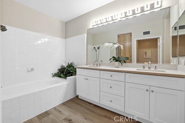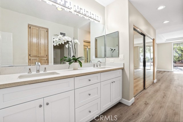 Welcome to 103 Mira Mesa! Located in the desirable community of Sausalito in the heart of Rancho Santa Margarita, sits this charming 2 bedroom 2 bathroom single level condominium. Fresh neutral paint, recessed lighting and updated, wide plank laminate flooring creates a truly cohesive unified feel in this space. A completely refreshed kitchen awaits with crisp white shaker style cabinetry, all new stainless appliances, quartz countertops and breakfast bar with barstool seating. A large light infused great room with stone faced gas fireplace sits adjacent. All bathrooms have been recently updated with new quartz countertops and new cabinetry. A large main ensuite bedroom has slider access to the private backyard. The large ensuite bathroom includes dual his and hers closets with sliding door access, dual vanities, a tub shower combo with updated showerhead and shower wand and generous cabinetry. .A secondary bedroom is generously sized as well and includes a dual panel sliding closet. This home enjoys a convenient two car attached garage with direct access. An impeccably kept backyard with pristine white fencing surrounds a large patio with raised hardscape planters and reveals a private serene view of the hills of O'Neil Regional Park. Located walking distance to highly-rated Melinda Elementary and the Altissima park and pool. The 241 freeway is only a few minutes away. Welcome Home!