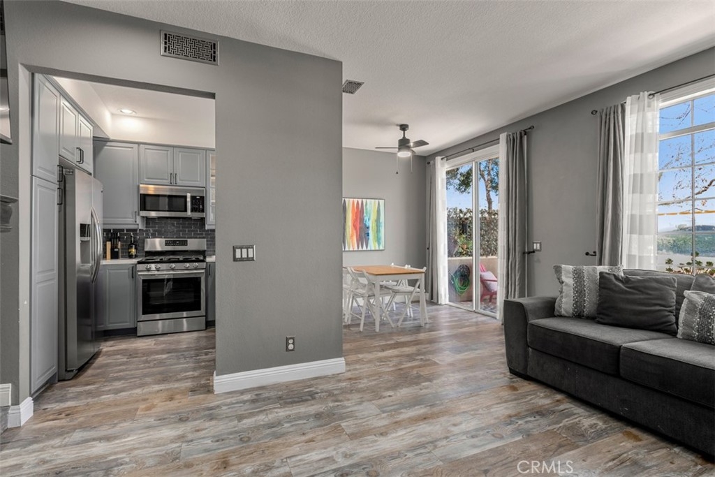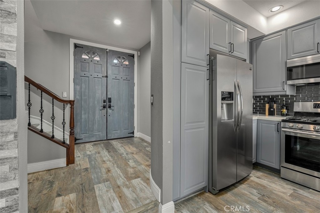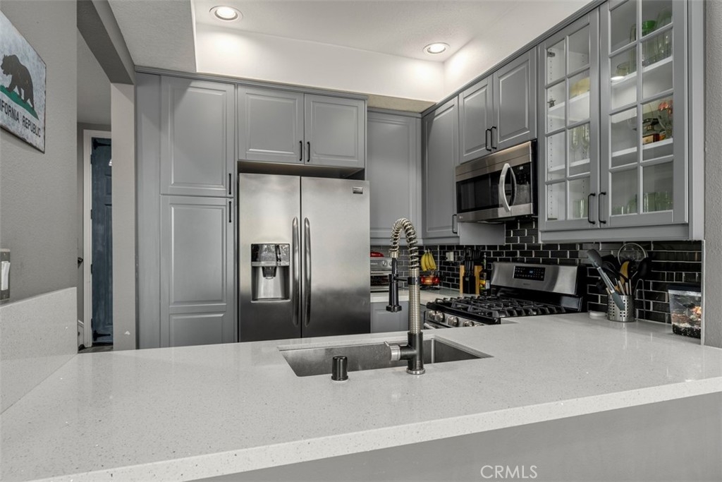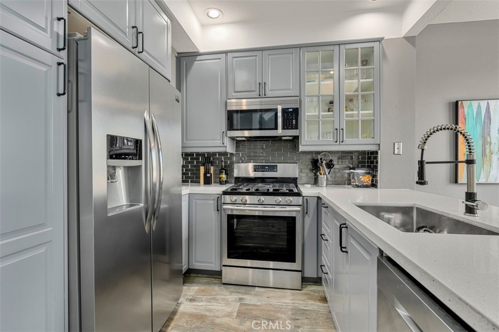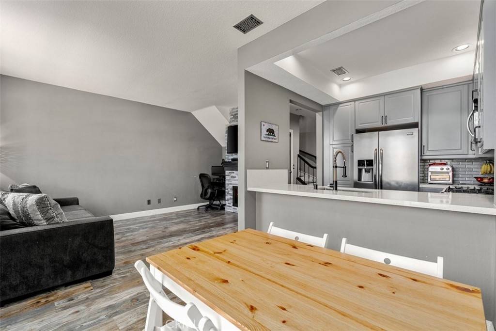 Welcome to the beautiful and highly desirable community of Serabrisa! This impeccable 2 bedroom, 2 1/2 half bath, two-story condo features an elegant double door entry, an open floor plan, vaulted ceilings, and luxury vinyl plank flooring. The cozy stacked stone fireplace adds both warmth and ambiance while the large, abundant windows fill the home with beautiful natural light. The tastefully remodeled kitchen boasts Quartz countertops, modern light grey cabinetry, newer stainless-steel appliances, a beautiful backsplash, a farmhouse sink, and a breakfast bar perfect for enjoying a morning coffee. Upstairs you’ll find 2 primary suites! The larger suite features a renovated bathroom with dual sinks, Quartz counters, a walk-in tiled shower, a beautiful barn door, and large dual paned windows. The secondary bedroom features a large vanity with lots of storage, Quartz counters, and a custom tile + stone rain shower. Both bedrooms have huge closets with built-in storage. The large patio just off the dining room is the perfect space for gatherings and BBQs! This condo has both a one-car detached garage with a washer/dryer and built-in storage + attic space, as well as an additional assigned parking space. The furnace and AC condenser are new along with an upgraded smart nest thermostat, the community has been re-piped with PEX, and the fire insurance is covered by the HOA!!! Across the street from Arroyo Vista Elementary, Arroyo Vista Park, and very close to Tijeras Creek golf course make this a perfect location to enjoy all RSM amenities such as the Lago Santa Margarita beach club, multiple pools, parks and playgrounds, sports courts, hiking and biking trails, and community events. This is your chance to live near award-winning schools, fantastic shopping and dining while living in the #1 ranked safest city in California! Welcome home!