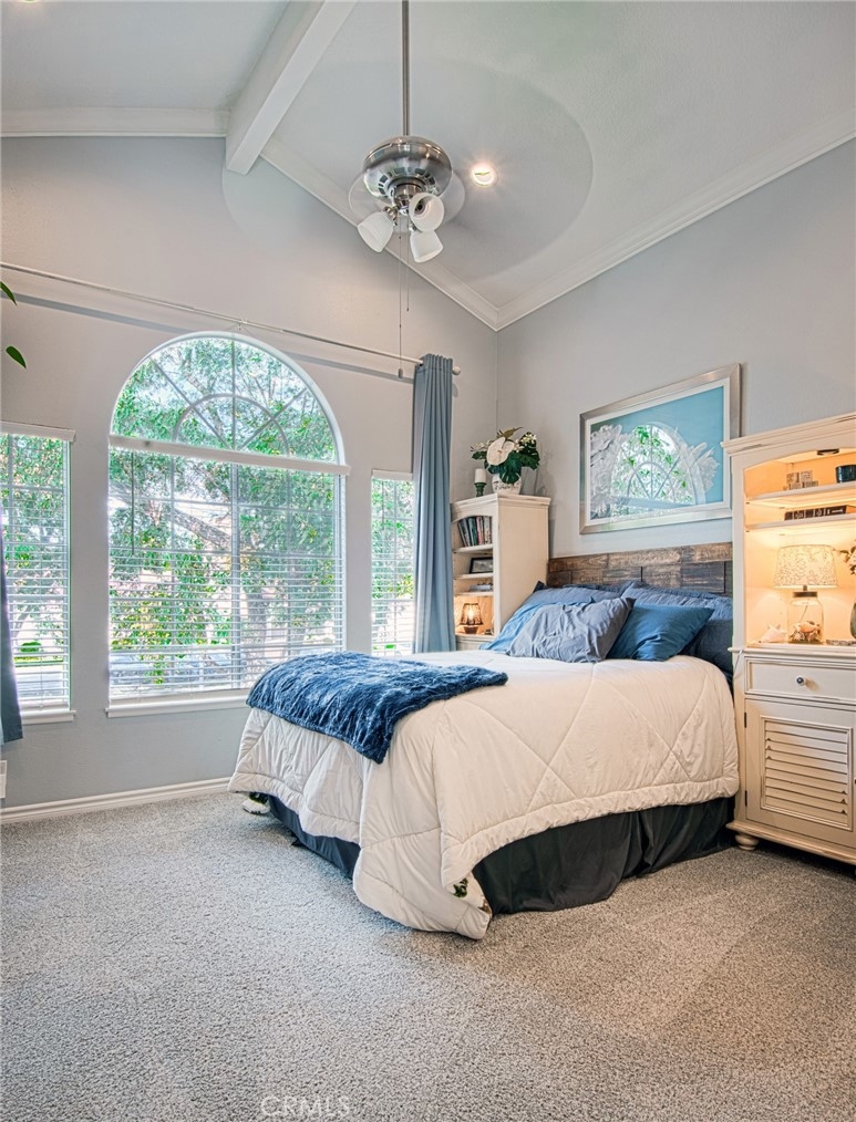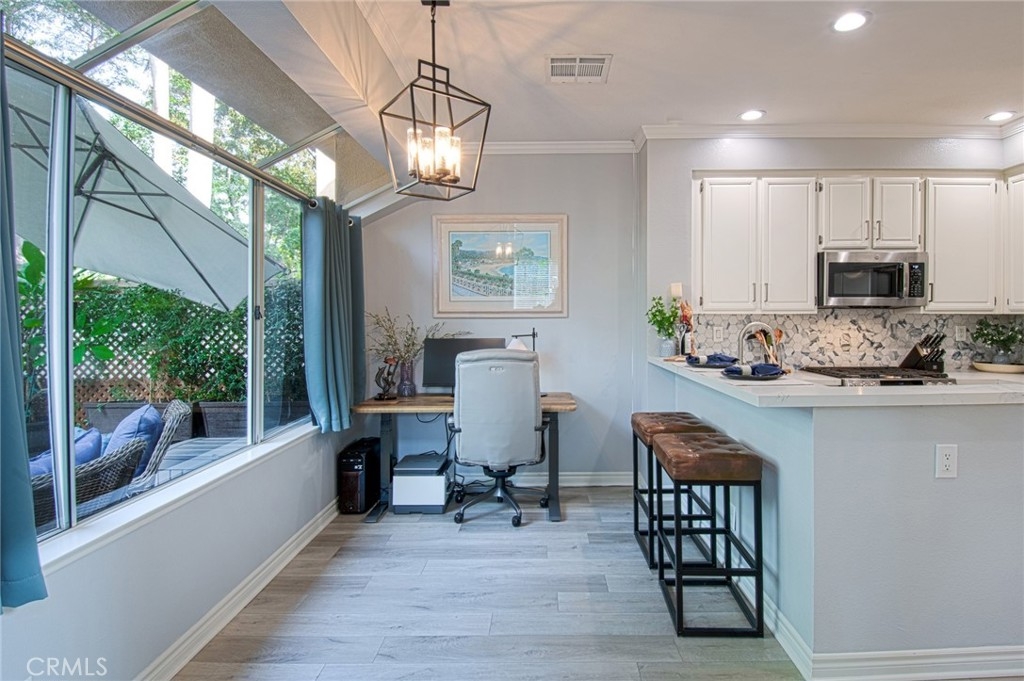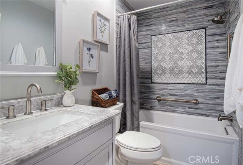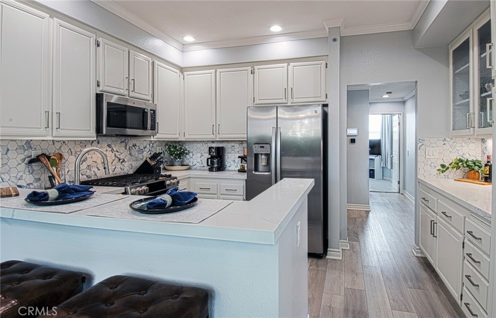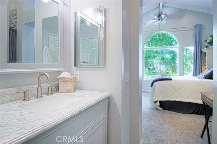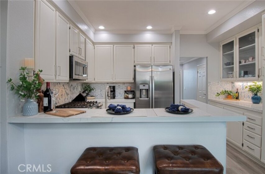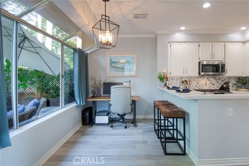 Unlike many homes that offer cosmetic updates alone, this immaculate, rarely available end-unit townhome combines designer finishes with substantial mechanical improvements, delivering both beauty and long-term peace of mind. Look beyond the HOA—this extensively upgraded home may offer lower overall ownership costs thanks to its low-risk fire zone (helping keep insurance lower) and tens of thousands invested in major system upgrades that reduce future expenses. With HOA-covered walls-out insurance and trash, no Mello-Roos, a low base tax rate, and comparatively lower insurance costs than many surrounding areas, ownership here offers financial predictability. Extensive upgrades include a full PEX repipe (unit and building), new water heater (2023), new furnace, and a brand-new HVAC system with Honeywell smart thermostat. Inside, premium vinyl plank flooring (2023), newer carpet with upgraded waterproof padding (2024), oversized baseboards, crown molding, fresh interior paint, and updated LED lighting. The remodeled kitchen (2023) features resurfaced cabinetry with new hardware, quartz countertops, modern backsplash, updated fixtures, and quality appliances including a GE Profile gas range, Bosch dishwasher, GE microwave, and Insinkerator Pro disposal. All bathrooms were remodeled in 2023 with custom vanities, updated fixtures, new lighting, whisper-quiet ventilation fans, and refreshed tub enclosures. A highly desirable downstairs bedroom with full bath offers flexibility for guests, multigenerational living, or a private office. Upstairs, both bedrooms feature private en-suite baths-a layout rarely available at this price point. Sun-filled living and dining areas open to a beautifully landscaped private patio with resurfaced concrete, new outdoor tile, and removable privacy lattice-ideal for outdoor dining and relaxed Southern California living. Additional enhancements include professionally built under-stair storage, cleaned ductwork, new registers, updated window coverings, and a finished garage with epoxy flooring, built-ins, overhead storage and a LiftMaster opener. Convenient parking with a one-car garage, private driveway, assigned space directly beside the home, and nearby guest parking. Located in the desirable Serabrisa community, residents enjoy a renovated pool, spa, and BBQ area, along with SAMLARC amenities including the lake (with adjacent shops and dining) pools, lagoon and trails. Arroyo Vista Elementary is just one block away.
