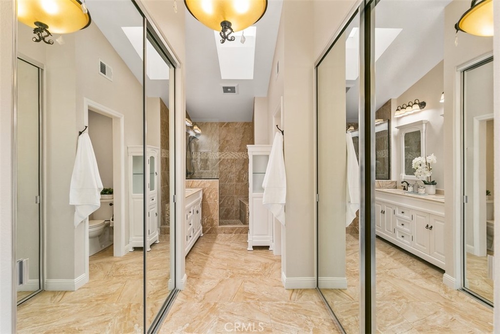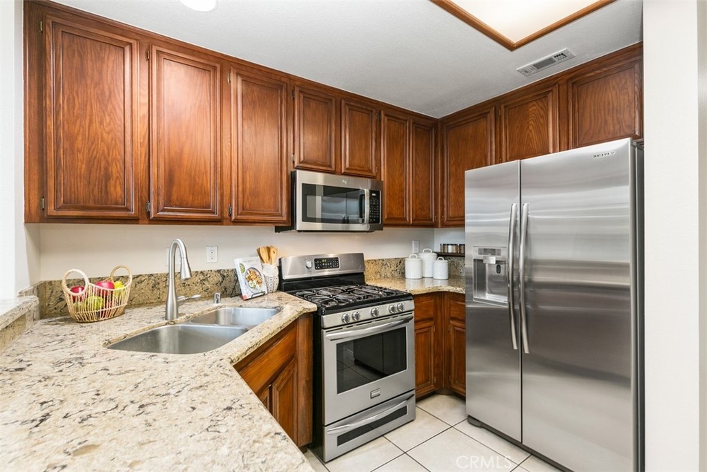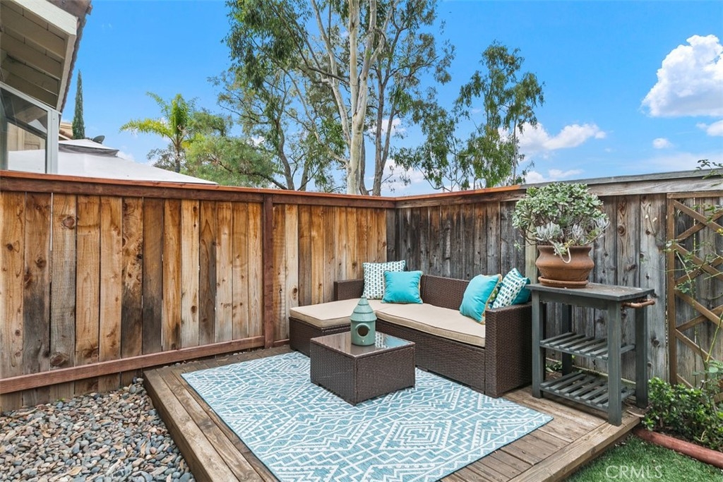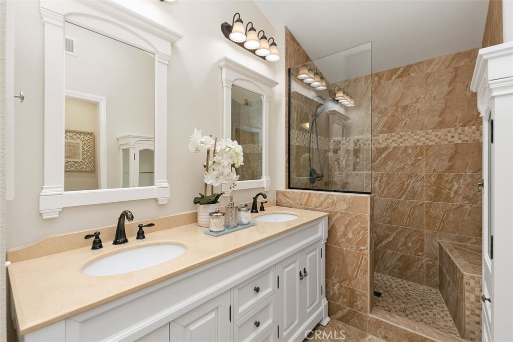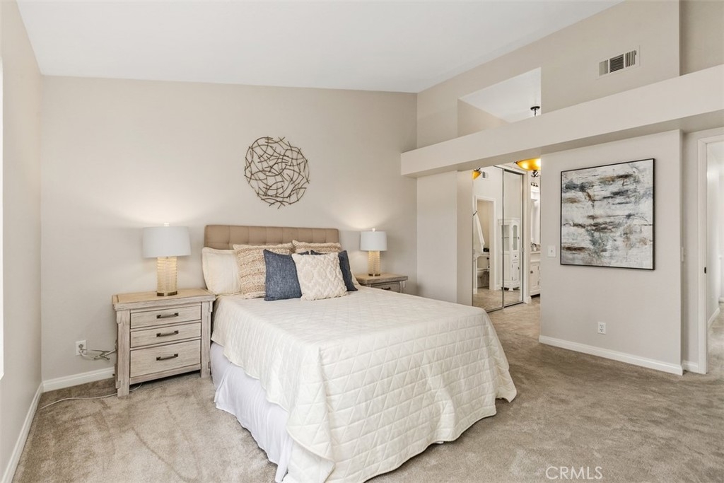YOU HAVE TO SEE IT TO BELIEVE IT! This home adjacent to Tierras Creek Golf Course has so much to offer. Lots of light pours in through the many windows on the main floor making it light & bright with low maintenance tile & a beautiful ornate fireplace in the large living room to warm chilly evenings. Several of the windows have custom beveled stained-glass adding to the privacy & beauty found here. The vaulted ceiling contributes to the open feeling of this lovely home. The kitchen has updated granite counters with stainless steel appliances & lots of storage. Indoor laundry room plus updated powder room finish off the main floor. The stairs have unique wrought iron railings. The stairs, hall & both bedrooms are carpeted. Each bedroom has its own en-suite bathroom. The primary suite has a vaulted ceiling, a view, a skylight & a completely updated bathroom with dual closets & a custom remodeled walk-in shower. The 2nd bedroom has a vaulted ceiling, a window seat & en-suite bathroom with tub. In the backyard there is a patio & separate wood deck with artificial turf creating lots of room to entertain. The 2-car garage has direct-access & PLENTY of storage. This lot is elevated which provides much desired privacy. A/C was replaced 2022. There is a nest thermostat. Home is freshly painted throughout the interior. The Sierra Verde community has its own pool & spa just a short walk away. One of the bonuses of living here is that you are also a member of the SAMLARC master association which allows you access to all of the amenities they have to offer like pools, the beach club, & tennis courts to name a few.