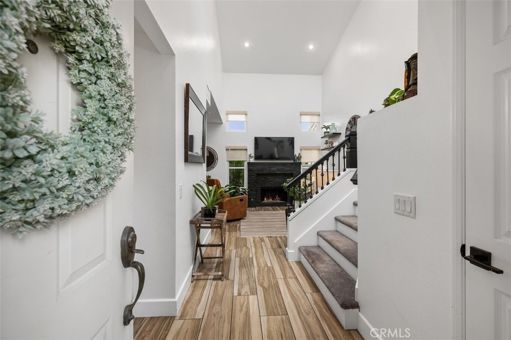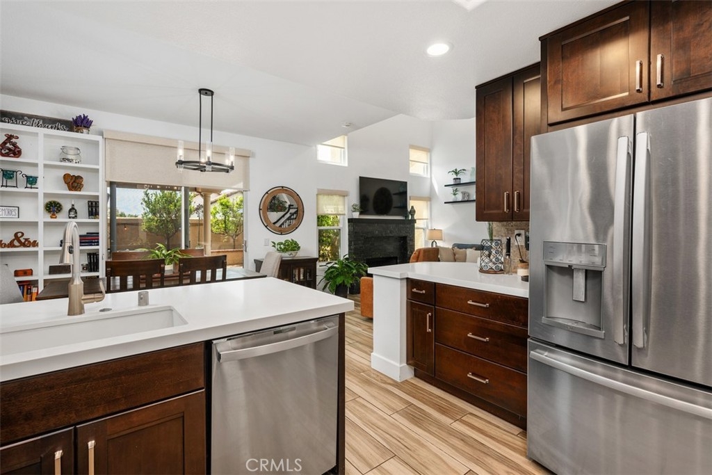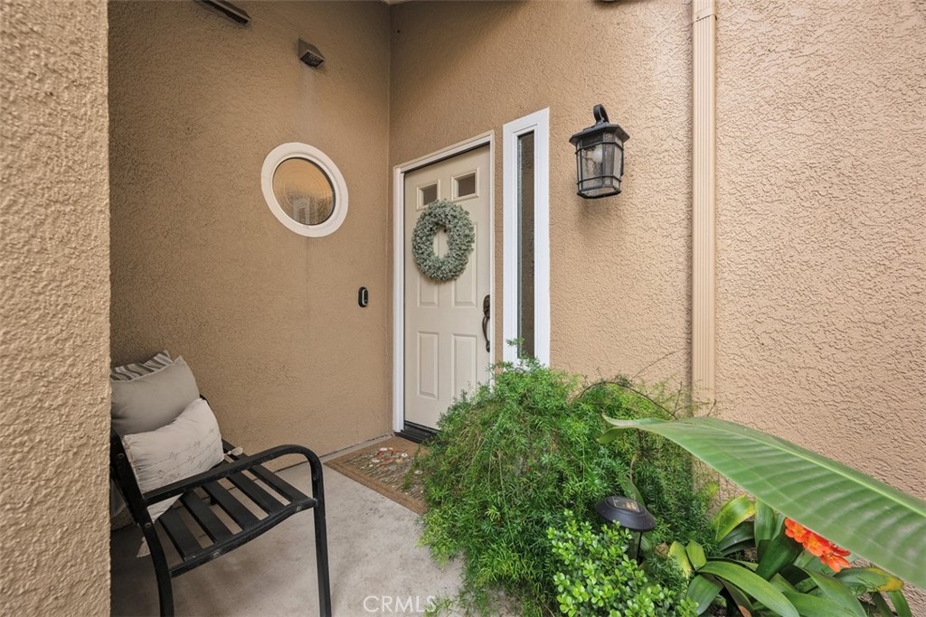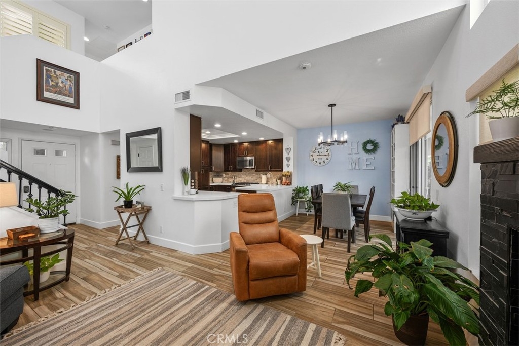 This beautifully upgraded 2 bed, 2.5 bath home is one of the finest in Sierra Verde. Backing to a small greenbelt, the enclosed yard offers privacy and peace. The inside was recently updated with flooring, carpet, and interior paint throughout. The kitchen has been fully remodeled as of 2025 with wood cabinetry, quartz counters and stainless steel appliances. Vaulted ceilings, a custom dark stone fireplace, dual-pane windows, and a combination of plantation shutters and automated curtains complete the inviting living space. A separate laundry room with washer/dryer is located opposite the downstairs hall bath. The master suite features a walk-in shower, quartz counters, and recessed lighting, while the second bedroom includes its own upgraded bath. The two-car garage has been upgraded with polished concrete floors, overhead and wall storage racks and a 220V electric vehicle plug. HOA recently replaced roof and skylight. A short walk across Arroyo Vista to the scenic Tijeras Creek trails. Close to parks, RSM Beach Club, and toll roads.