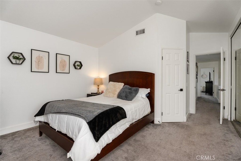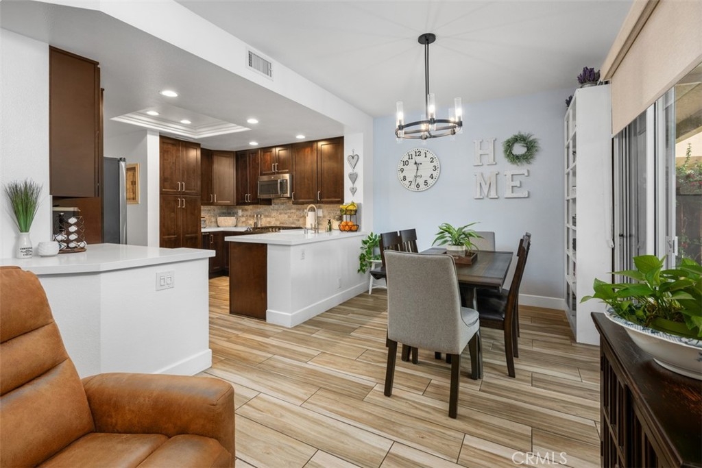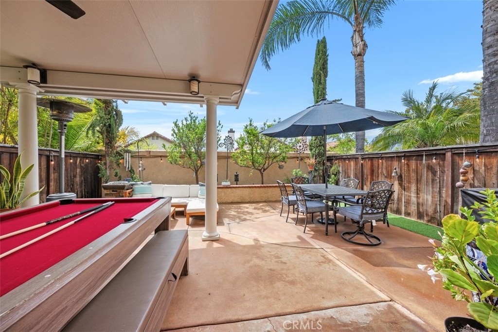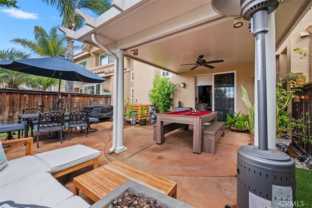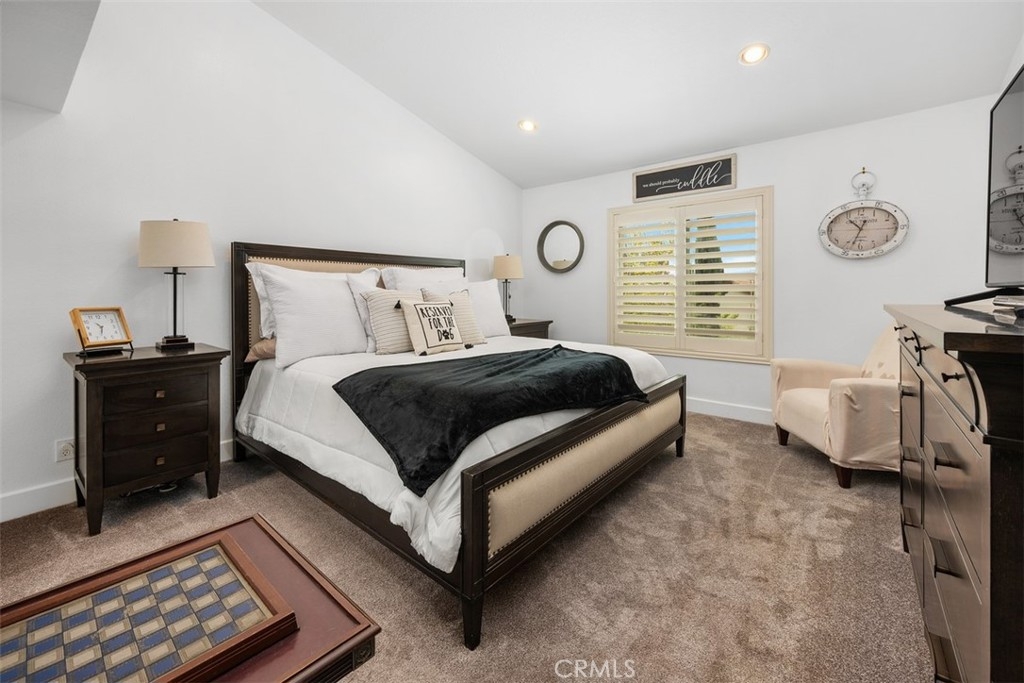 This beautifully upgraded 2 bed, 2.5 bath home is one of the finest in Sierra Verde. Backing to a small greenbelt, the enclosed yard offers privacy and peace. The inside was recently updated with flooring, carpet, and interior paint throughout. The kitchen has been fully remodeled as of 2025 with wood cabinetry, quartz counters and stainless steel appliances. Vaulted ceilings, a custom dark stone fireplace, dual-pane windows, and a combination of plantation shutters and automated curtains complete the inviting living space. A separate laundry room with washer/dryer is located opposite the downstairs hall bath. The master suite features a walk-in shower, quartz counters, and recessed lighting, while the second bedroom includes its own upgraded bath. The two-car garage has been upgraded with polished concrete floors, overhead and wall storage racks and a 220V electric vehicle plug. HOA recently replaced roof and skylight. A short walk across Arroyo Vista to the scenic Tijeras Creek trails. Close to parks, RSM Beach Club, and toll roads.
