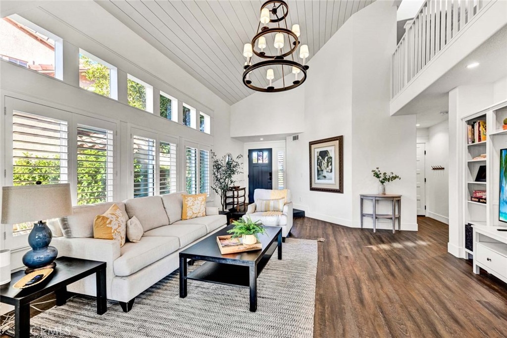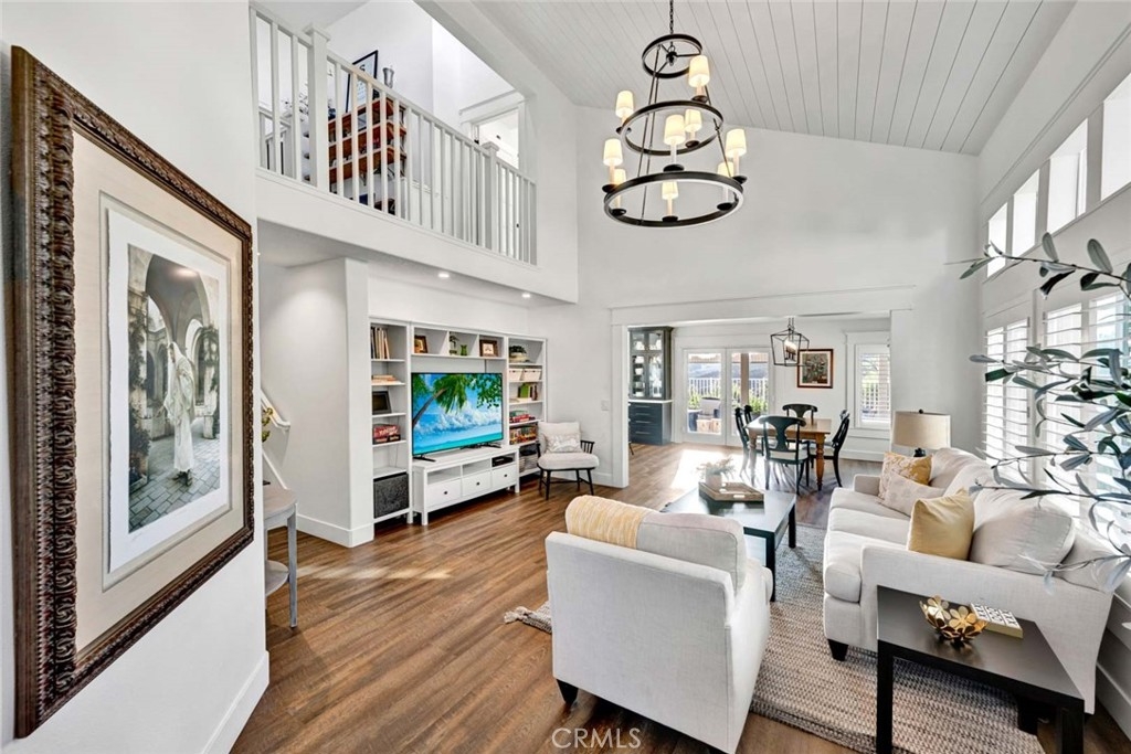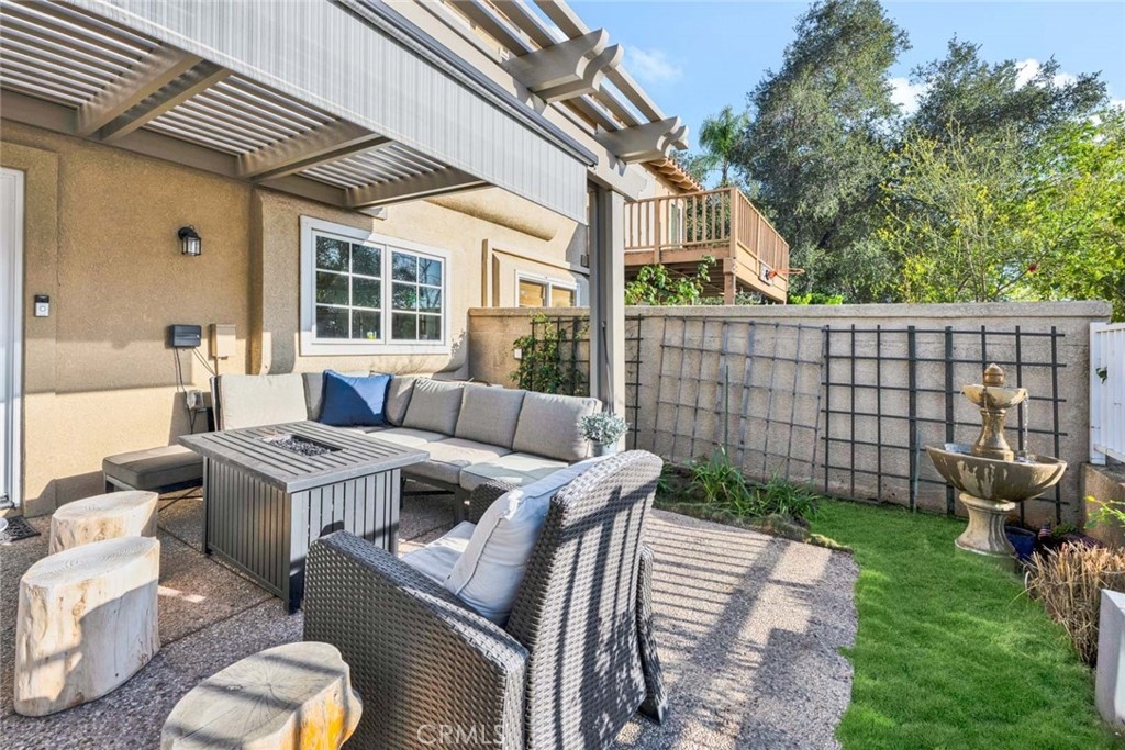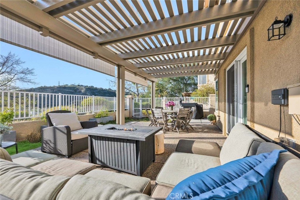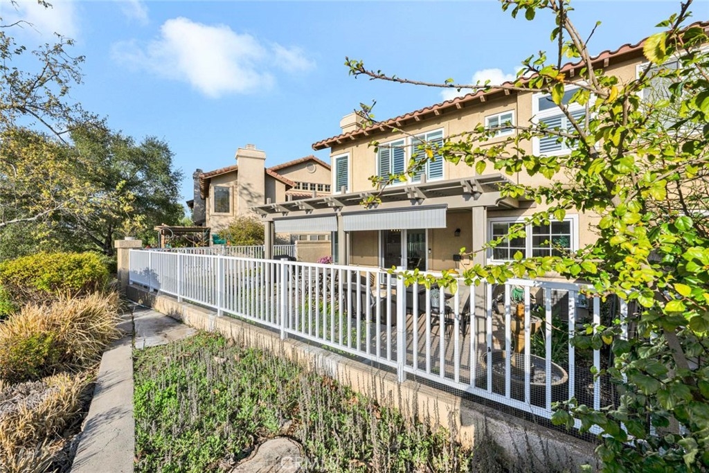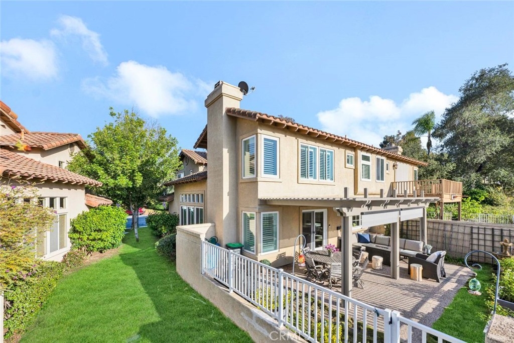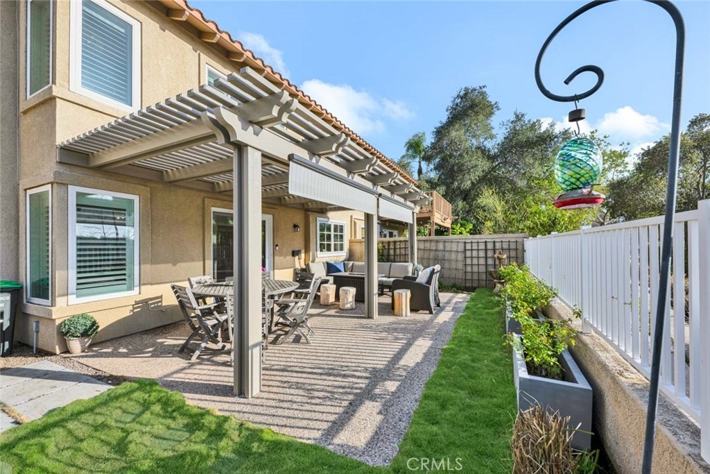 Welcome to the Most Amazing Remodeled Home in Tierra Linda! Step into a captivating Great Room with breathtaking views of the wilderness, visible right from the front door. Experience the elegance of beautiful brown laminate flooring that stretches throughout the home, paired with large windows adorned with plantation shutters, cathedral white wood slat ceilings, and a stunning candle light fixture. This room also boasts a charming built-in bookcase and dual-paned windows that flood the space with natural light. Venture into the inviting dining area, where a mesmerizing fireplace with mosaic tile and a black wood mantle awaits, illuminated by a striking light fixture. The heart of this home is the incredible kitchen, showcasing sleek black cabinets, pristine white quartz counters, a spacious island, a chic white tile backsplash, and a white porcelain farm sink. Cook to perfection on the stainless steel 6-burner stove beneath decorative wood shelving and an exhaust hood. The solid core craftsman-style door opens to a humungous pantry, ideal for all your storage needs. Step outside through the dual-paned sliding door to discover a serene and expansive yard, complete with pebble rock concrete inlay and a durable aluma wood patio cover. The easy-to-maintain Japanese grass adds a touch of tranquility, making it perfect for family gatherings, BBQs, or simply relaxing and enjoying the breathtaking sunsets. The downstairs bath features a walnut-toned cabinet with a large sink and shiplap walls, adding a touch of rustic charm. Upstairs, the primary bedroom boasts vaulted white wood slat ceilings and offers picturesque views of the Arroyo Trabuco Wilderness area. The master bath is a true retreat, with mosaic tile flooring, black cabinets topped with white quartz, dual bowl sinks, a walk-in shower with glass doors, and a spacious walk-in closet. Stroll along the catwalk to find a built-in loft desk area and a custom upstairs stackable laundry area. Two additional good-sized rooms feature laminate flooring and fresh white paint. The second bath upstairs is stylish with honeycomb white tile flooring, a grey cabinet, and grey and white quartz counters, along with a bath and shower. This home includes a two-car garage with an Official Tesla Electric Car Charger and a large attic storage space. Plus, some of the lights even work with Alexa for added convenience. Come explore this enchanting oasis—perfect for making lasting memories