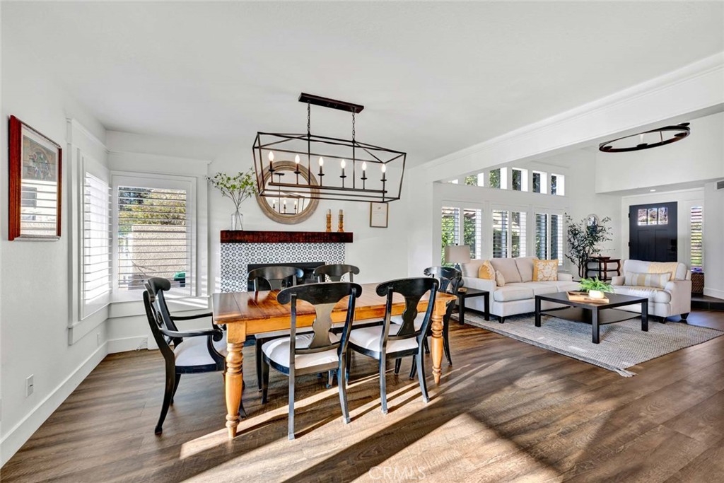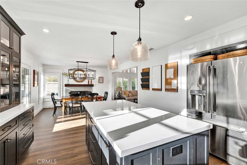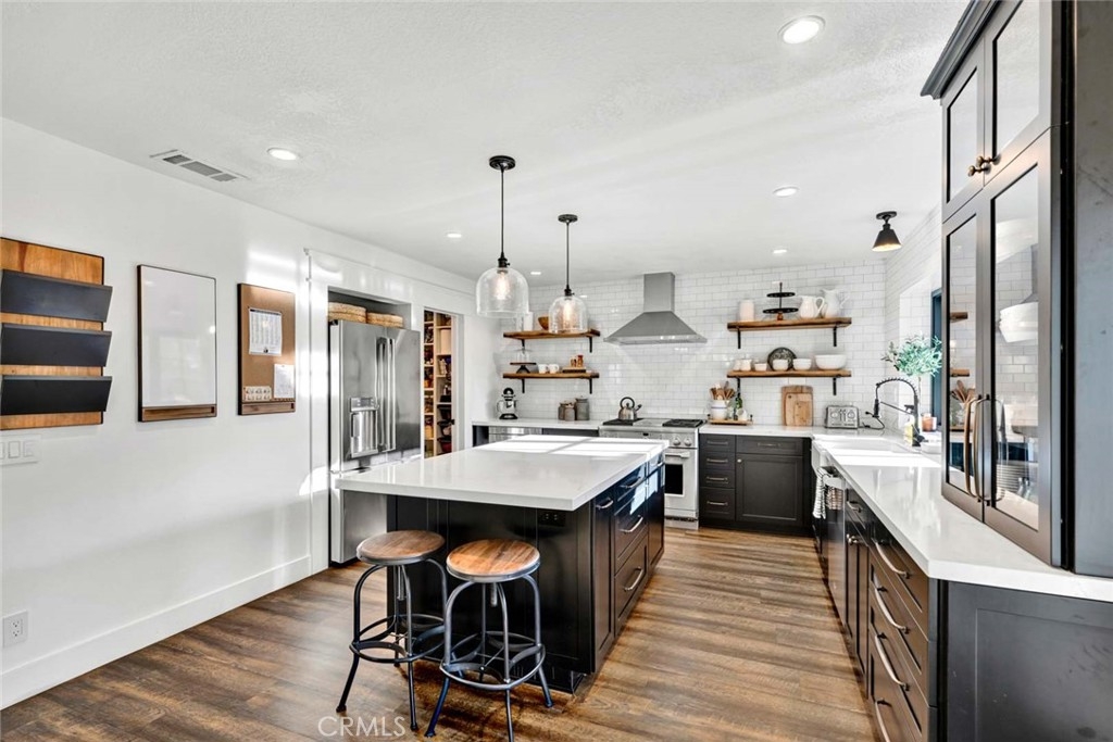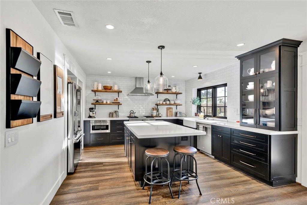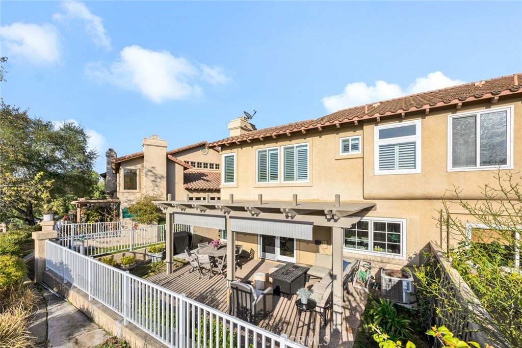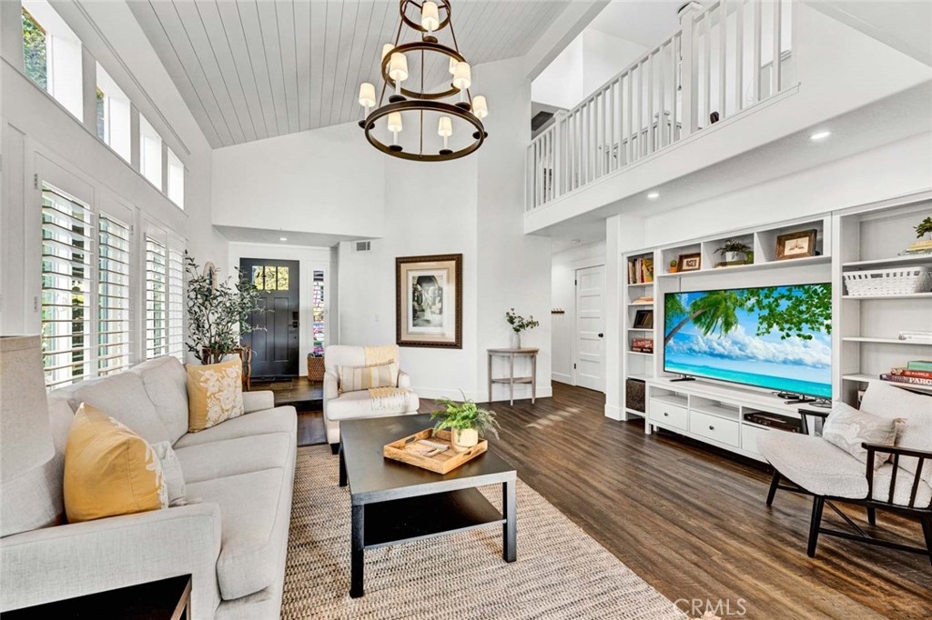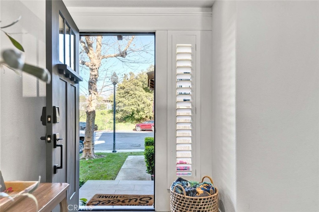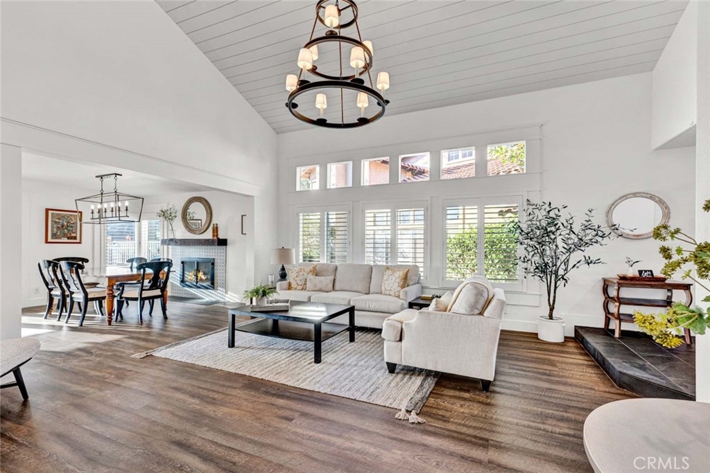 Welcome to the Most Amazing Remodeled Home in Tierra Linda! Step into a captivating Great Room with breathtaking views of the wilderness, visible right from the front door. Experience the elegance of beautiful brown laminate flooring that stretches throughout the home, paired with large windows adorned with plantation shutters, cathedral white wood slat ceilings, and a stunning candle light fixture. This room also boasts a charming built-in bookcase and dual-paned windows that flood the space with natural light. Venture into the inviting dining area, where a mesmerizing fireplace with mosaic tile and a black wood mantle awaits, illuminated by a striking light fixture. The heart of this home is the incredible kitchen, showcasing sleek black cabinets, pristine white quartz counters, a spacious island, a chic white tile backsplash, and a white porcelain farm sink. Cook to perfection on the stainless steel 6-burner stove beneath decorative wood shelving and an exhaust hood. The solid core craftsman-style door opens to a humungous pantry, ideal for all your storage needs. Step outside through the dual-paned sliding door to discover a serene and expansive yard, complete with pebble rock concrete inlay and a durable aluma wood patio cover. The easy-to-maintain Japanese grass adds a touch of tranquility, making it perfect for family gatherings, BBQs, or simply relaxing and enjoying the breathtaking sunsets. The downstairs bath features a walnut-toned cabinet with a large sink and shiplap walls, adding a touch of rustic charm. Upstairs, the primary bedroom boasts vaulted white wood slat ceilings and offers picturesque views of the Arroyo Trabuco Wilderness area. The master bath is a true retreat, with mosaic tile flooring, black cabinets topped with white quartz, dual bowl sinks, a walk-in shower with glass doors, and a spacious walk-in closet. Stroll along the catwalk to find a built-in loft desk area and a custom upstairs stackable laundry area. Two additional good-sized rooms feature laminate flooring and fresh white paint. The second bath upstairs is stylish with honeycomb white tile flooring, a grey cabinet, and grey and white quartz counters, along with a bath and shower. This home includes a two-car garage with an Official Tesla Electric Car Charger and a large attic storage space. Plus, some of the lights even work with Alexa for added convenience. Come explore this enchanting oasis—perfect for making lasting memories