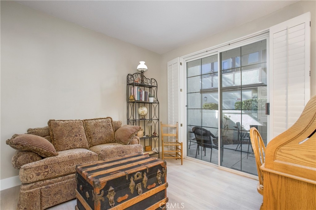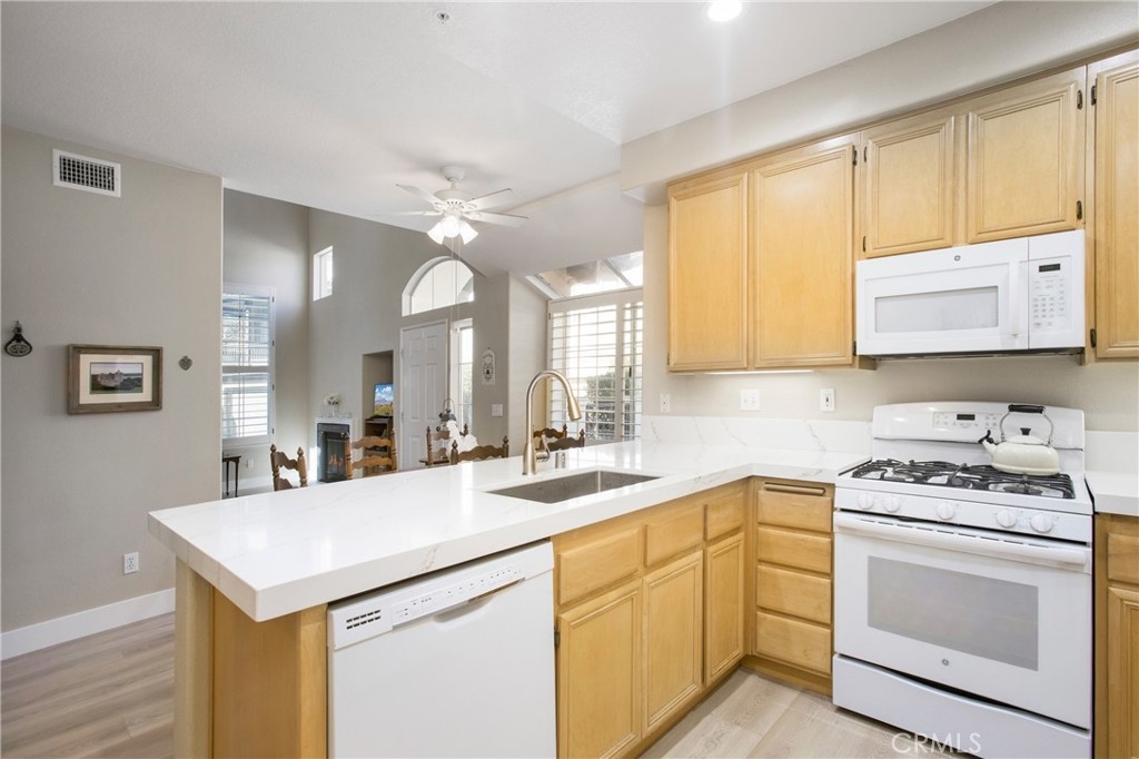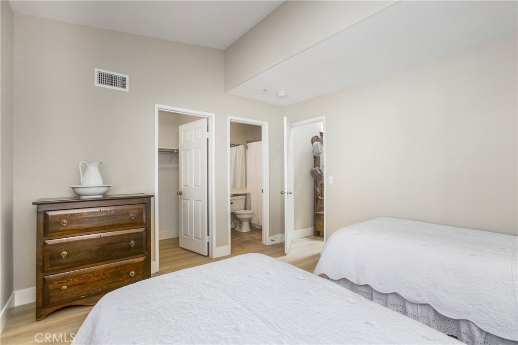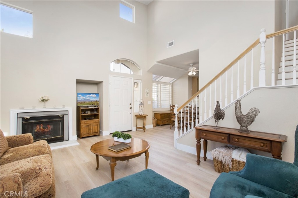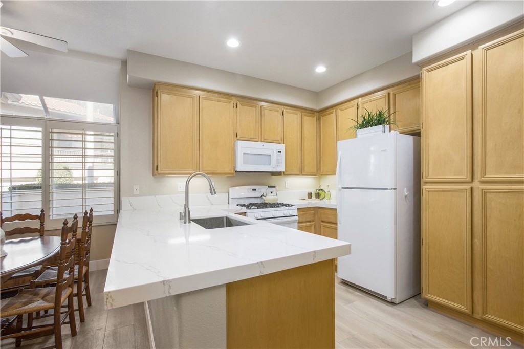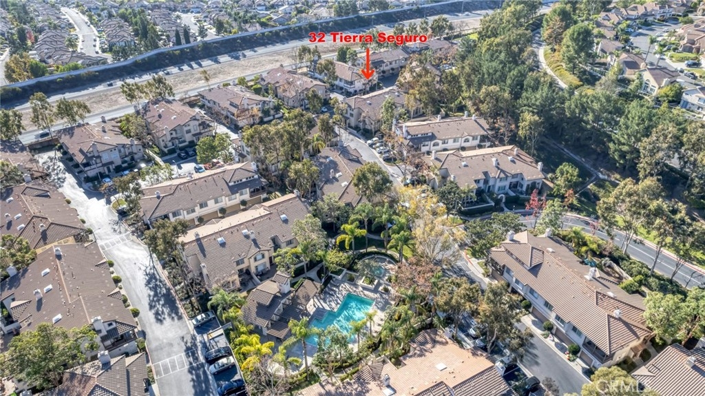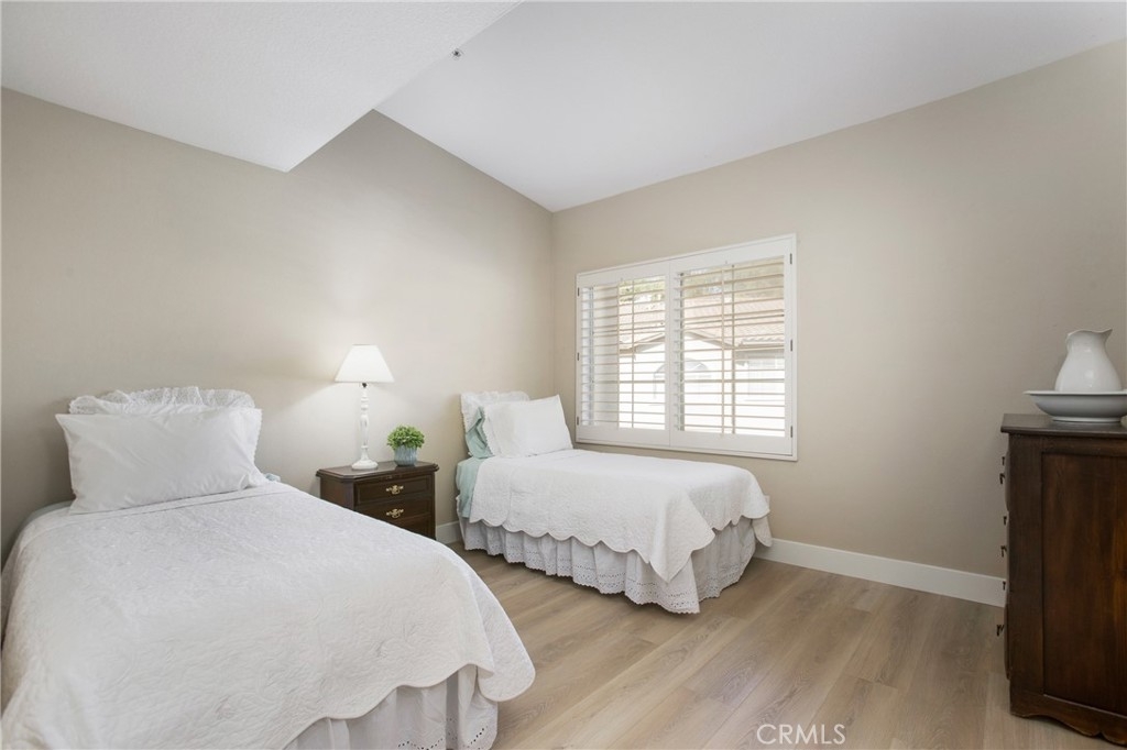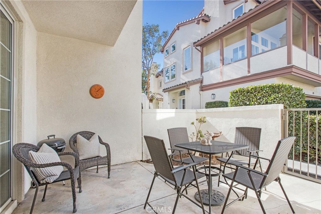 Welcome to this beautifully updated townhome, located in Melinda Heights area of Rancho Santa Margarita. This light-filled corner location with views of the surrounding hills and trees feels like a single-family residence. As you approach the home, you’re greeted by a tranquil front courtyard featuring steppingstones that lead to a peaceful sitting area—perfect for enjoying a quiet moment. The back patio with space to garden overlooks lush greenery, making it an ideal spot for morning coffee, BBQs, or entertaining guests. Upon entering you are greeted with two-story ceilings and walls of windows that bring an abundance of natural light. The interior has been thoughtfully updated with new "white oak" luxury vinyl plank (LVP) flooring throughout, new quartz countertops and fresh interior paint. The kitchen features a gas range, a convenient counter height breakfast bar, recessed LED lighting, new kitchen faucet and pantry for ample storage. The spacious dining area accommodates all your guests and looks out at the front courtyard. The main level also offers a full bedroom and full bath with new white shaker vanity and quartz countertop and is ideal for guests or multi-generational living. The picturesque stairway, with its "white oak" LVP and crisp white risers, leads to the upper level with two generous primary suites, both offering ample closet space and their own bathrooms. One suite features a large walk-in closet, while the other offers dual vanities and two walls of closet space. Additional thoughtful touches throughout the home include newly installed 6" baseboards, shutters, new bath hardware and faucets, new ceiling fan, smart thermostat, and retractable screen door for a breezy, fresh atmosphere. Community amenities include pool, spa, SAMLARC Beach club, tennis, parks, splash park, pickleball, miles of walking and biking trails and events including 4th of July spectacular. Walking distance to the Blue Ribbon Melinda Heights Elementary, Altisima Park and pool. Conveniently located towards the end of a quiet cul-de-sac, the home includes a direct-access two-car garage, with plenty of guest parking nearby. The HOA recently re-roofed the home, adding to its move-in readiness. This peaceful and private location offers the perfect balance of comfort and convenience, making this property feel like your very own.