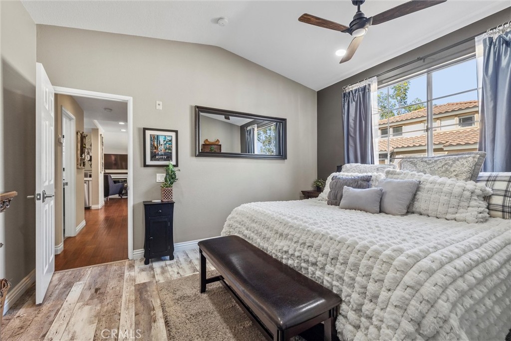Prime location, corner unit located in the prestigious community of Melinda Heights in RSM. This beautiful home has numerous upgrades throughout. Open and spacious floorplan with an abundance of natural light with large windows, featuring 2 bedrooms, 2 bathrooms, plus an expanded upstairs large loft area, which does not reflect in the total square footage. The kitchen features stainless steel appliances and includes the refrigerator, recessed lighting, breakfast bar open to the living room and dining room. High ceilings in the living room with a custom ceiling fan and fireplace. Laminate wood flooring throughout and upgraded tile flooring in both bedrooms. Primary bedroom features vaulted ceilings, recessed lighting, custom paint and custom built in closet organizers and drawers. The bathrooms have been upgraded with beautiful custom cabinetry, counter tops and custom mirrors. The primary bath features high end finishes, dual vanities, a walk in shower with a sitting bench, Hansgrohe rain shower fixtures and an upgraded glass shower door. Off the dining room is the wrap around over-sized balcony with beautiful views, perfect for relaxing or entertaining. Direct access 2 car garage with ample storage and laundry area, washer and dryer are included. The community amenities include resort style swimming pool/spa, Beach Club, sport courts, BBQ’s and play area. Easy access to 241 Toll Road, Blue-Ribbon Melinda Heights Elementary School, Altisma Park and an abundance of shopping, dining and entertainment.