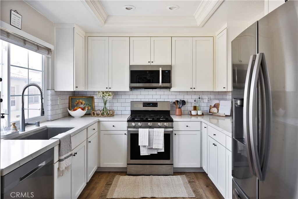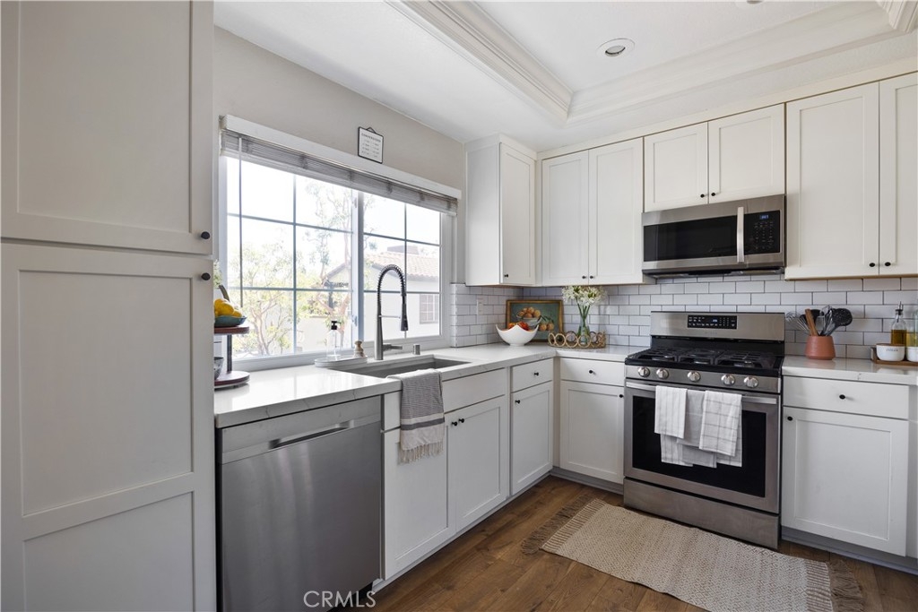 Luxurious Upgraded Condo in Desirable Rancho Santa Margarita Welcome Home to This Stunning Upper-End Unit. Discover your new haven in this meticulously upgraded 2-bed/2-bath condo within the prestigious Tijeras Creek Villas community. Nestled in the award-winning Capistrano School District and just steps from the renowned Tijeras Creek Golf Course, this prime location offers an unparalleled lifestyle. Upon entry, you'll be captivated by the open and inviting living area, seamlessly adjoined to the brand-new designer kitchen. Boasting quartz countertops, designer tile backsplash, and an abundance of natural light, this culinary haven is a chef's dream. The cozy gas fireplace adds warmth and ambiance to the space, perfect for entertaining guests. The stunning master suite is a true oasis, featuring a fully remodeled bathroom with new hardware, vanity, and a luxurious walk-in shower. Dual walk-in closets provide ample storage space, while the private patio off the master bedroom offers breathtaking views of the surrounding slopes and peaks, ideal for relaxation. Residents of Tijeras Creek Villas enjoy access to a wealth of amenities, including two newly renovated swimming pools, spas, a state-of-the-art fitness center with a sauna, BBQ areas, and a children's playground. The community's recent exterior painting enhances the overall aesthetic appeal. Outdoor enthusiasts will appreciate the proximity to the RSM Bike Trail, an expansive municipal green belt, and a plethora of regional parks, offering endless opportunities for hiking, biking, and exploring nature. Rancho Santa Margarita offers a vibrant and active lifestyle, with the Beach Club Lagoon providing watercraft and bike rentals, pools, parks, trails, fishing, workshops, and a variety of community events throughout the year. Don't miss your chance to own this exceptional property in one of Orange County's most desirable communities. Schedule your private viewing today and experience the epitome of luxury living.
