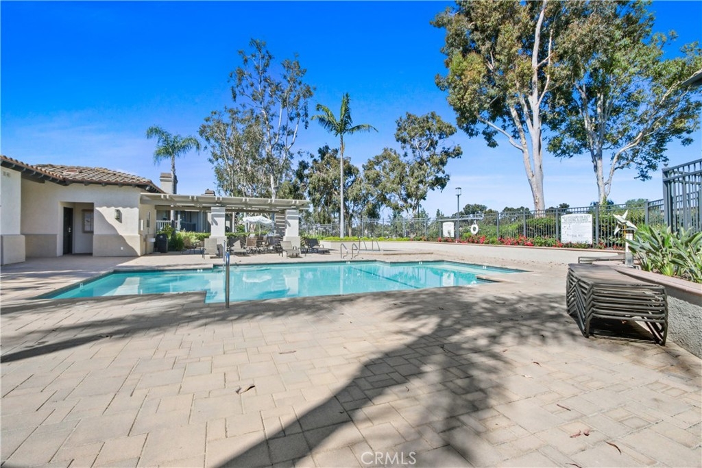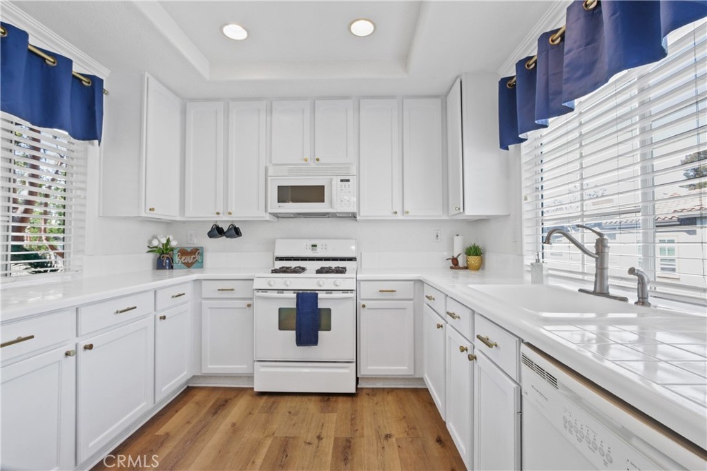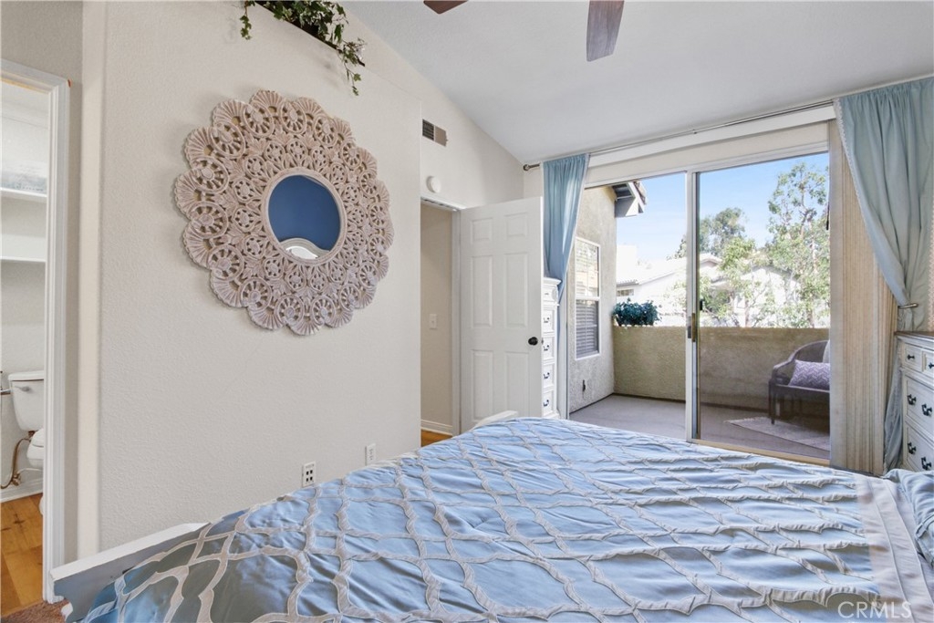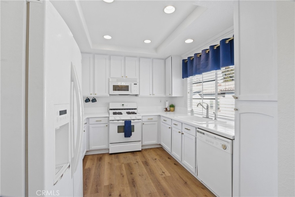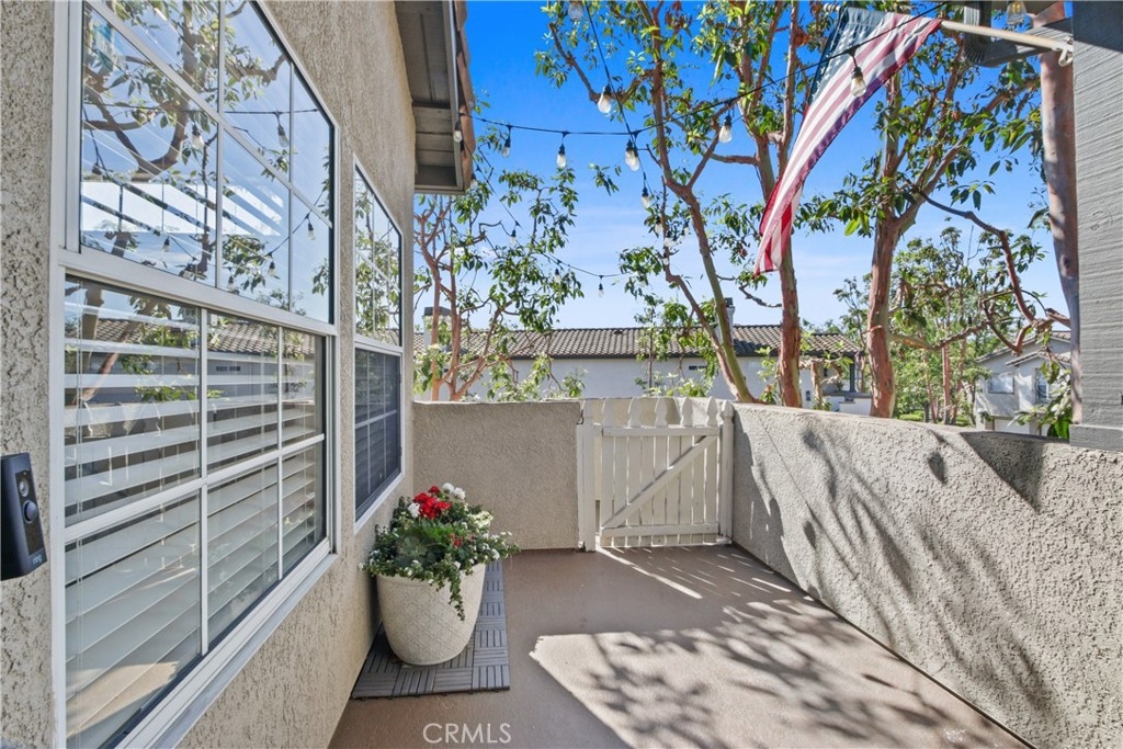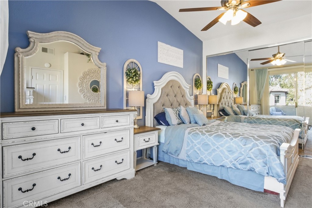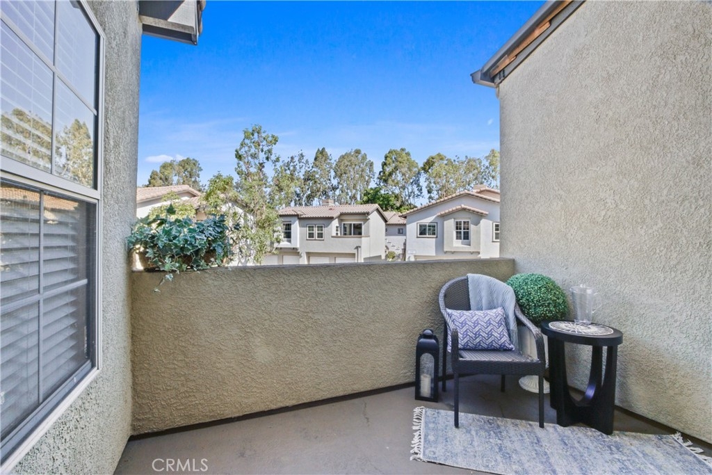 This move-in ready upper-end unit with no unit below features 2 bedrooms and 2 bathrooms, nestled in the Tijeras Creek community at the heart of Rancho Santa Margarita, renowned as one of California's safest cities. Step into the inviting living room with an open floor plan, warm laminate wood floors, vaulted ceilings, and a cozy fireplace. The living room flows seamlessly into the dining room and kitchen, where a beautiful window above the sink enhances the spacious feel alongside ample cabinet space for storage. The spacious master bedroom offers sliding doors to a private balcony, an en-suite bathroom, and new mirror sliding closet doors with a custom closet organizer. The secondary bedroom boasts high vaulted ceilings, new sliding closet doors, and access to a full hall bathroom with a shower/tub combo and plenty of sink space. Additional features include an indoor stackable laundry closet, a one-car detached garage, and an extra parking space. Enjoy outdoor gatherings on the spacious gated front patio, ideal for BBQs and entertaining. This condo has been upgraded with new lighting fixtures, flooring, refinished kitchen & bathroom counters, refinished sinks, refinished shower & tubs, sliding closet doors, and paint. Community amenities include 2 recently renovated swimming pools and spas, BBQ areas, a fitness center, a sauna, tot lot, newly installed stairs, and recently painted exteriors. Residents also benefit from access to RSM Lake, Beach Club Lagoon, 4 pools, 13 parks, walking trails, Tijeras Creek Golf Course, and a wealth of shops and restaurants. Move in just in time to savor everything RSM has to offer this summer!