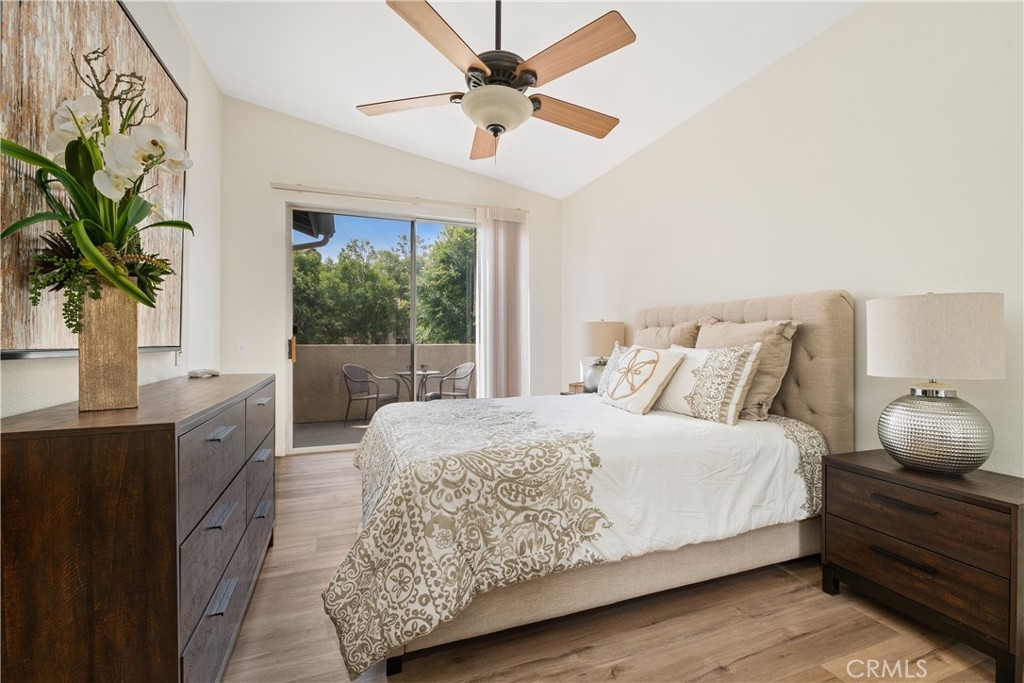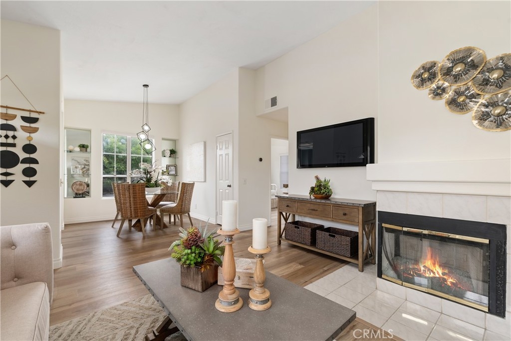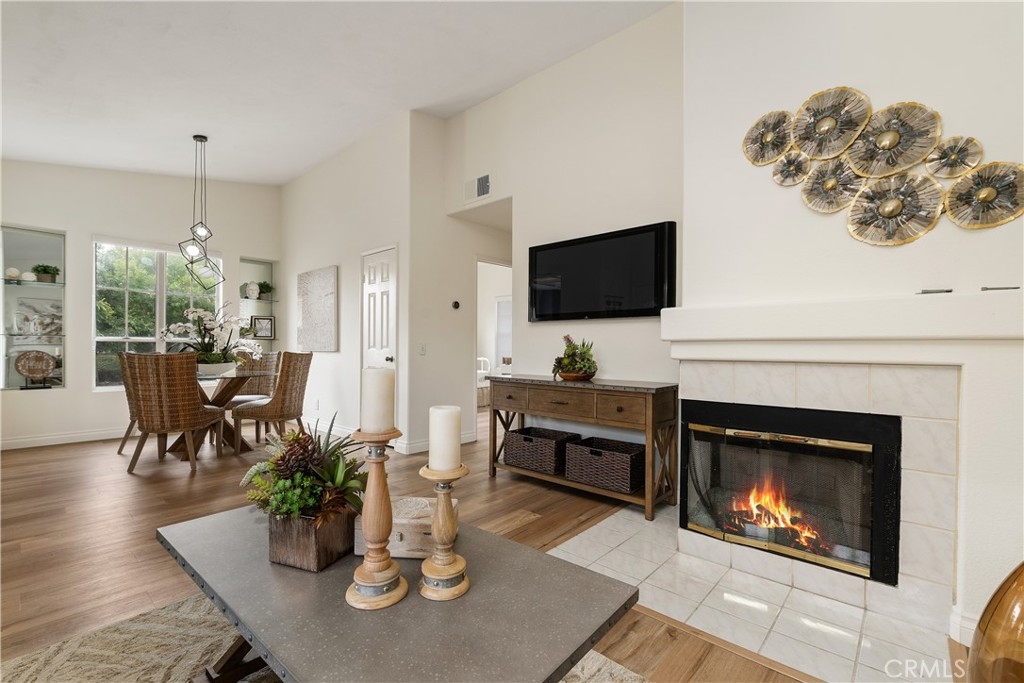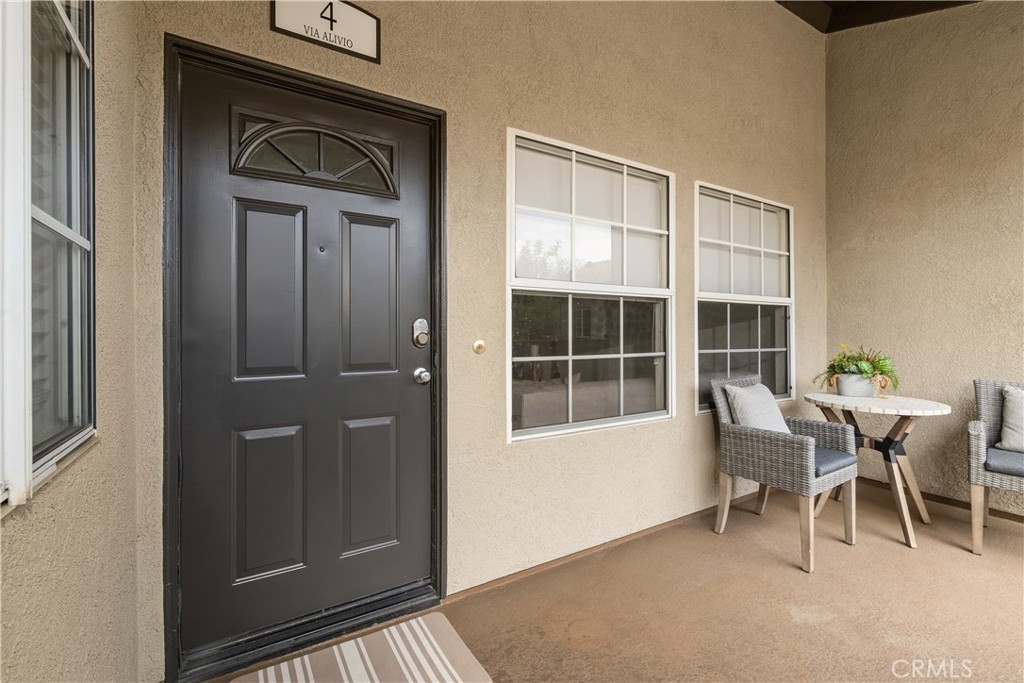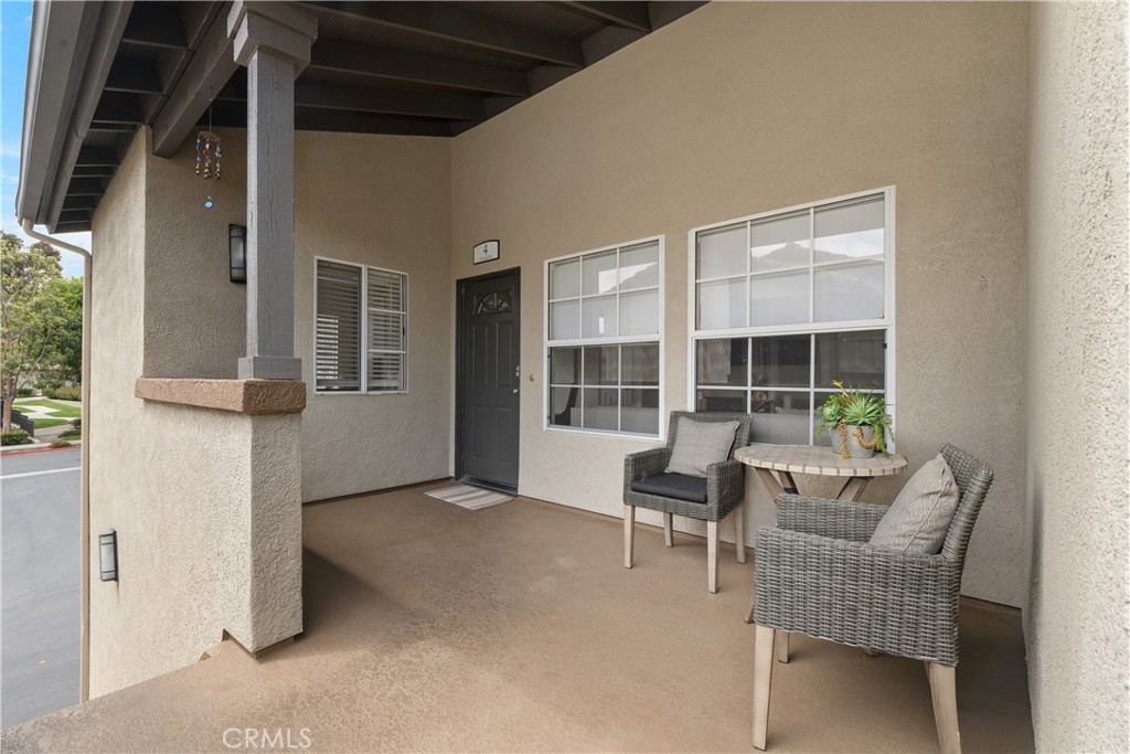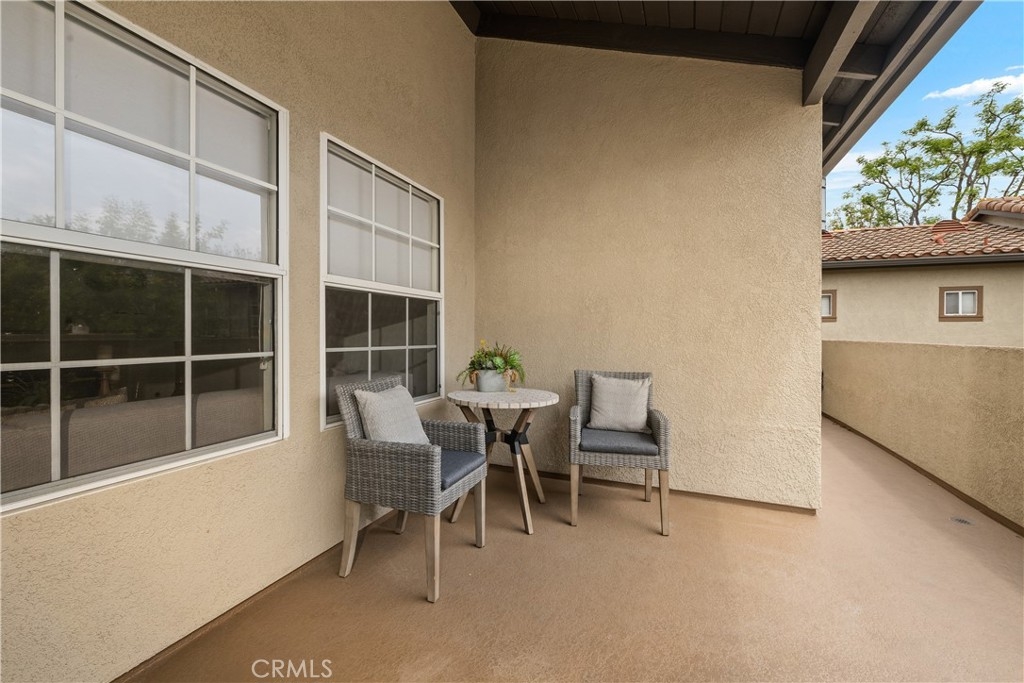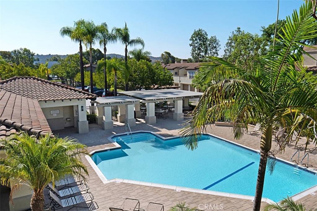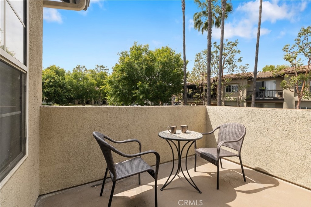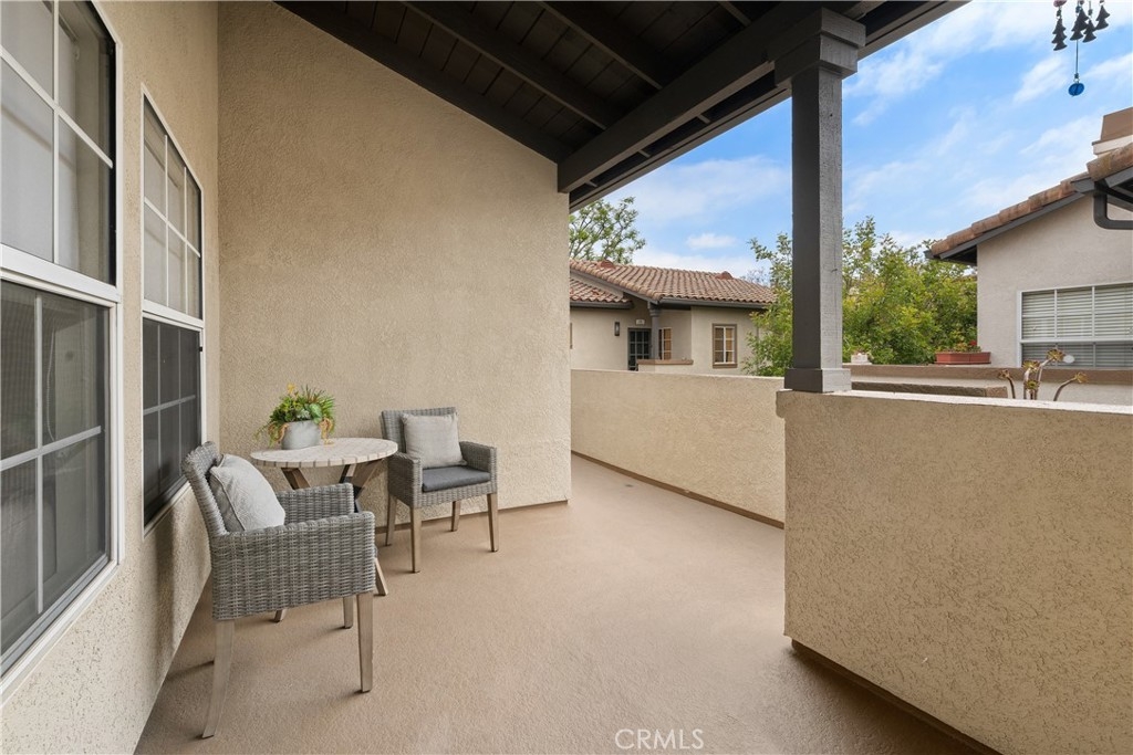 Welcome to this charming upper-level unit located in the Tijeras Creek community. With only one shared wall and no one above or below. As you approach the property, you'll be greeted by a welcoming front porch, creating a warm and inviting entrance. Upon entering, you'll be greeted by an abundance of natural light that fills the space, accentuated by the vaulted ceilings. The living room, adorned with a cozy fireplace, sets the tone for comfort and relaxation. The kitchen seamlessly connects to the dining area, creating an open-concept layout. In the hallway, a stackable laundry closet provides added convenience. Further down the hall, the master bedroom offers sliding doors to a private balcony and is complete with en-suite bathroom. The interior has been recently upgraded with a fresh coat of paint. The bathrooms have also been enhanced with new vanities, faucets, and toilets, while the kitchen features a new sink and garbage disposal. Windows have blinds. The garage has been equipped with new wall shelves for additional storage and organization. Tijeras Creek Villas offers exceptional amenities, including two association pools, two hot tubs, fitness room, sauna, playgrounds, and BBQ areas. The SAMLARC master association also provides access to additional amenities such as the lake, beach lagoon, pools, various sports fields and courts, picnic shelters, numerous parks, community events, and more! This home is located within the award-winning Arroyo Vista Elementary and Middle schools. The Tijeras Creek Villas community is surrounded by shopping and dining options. Schedule a viewing today and experience all that this community has to offer!