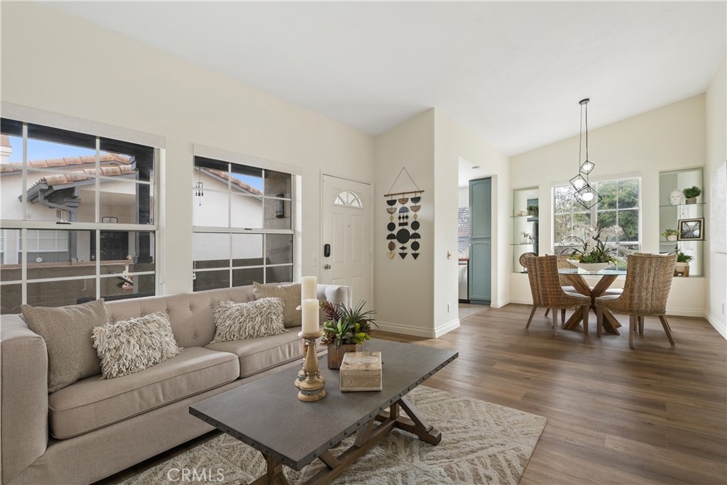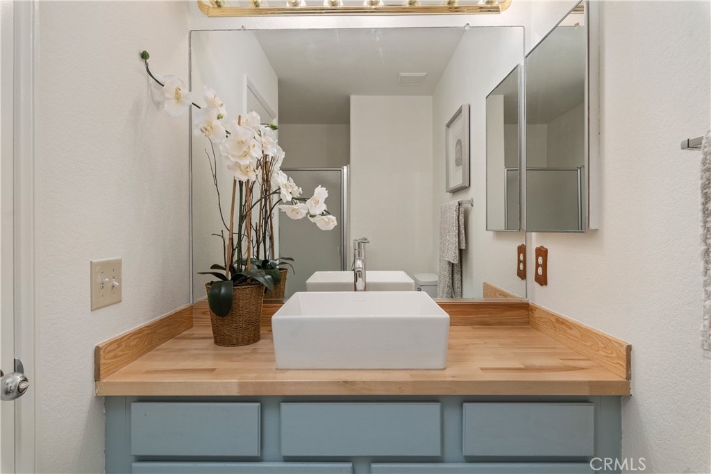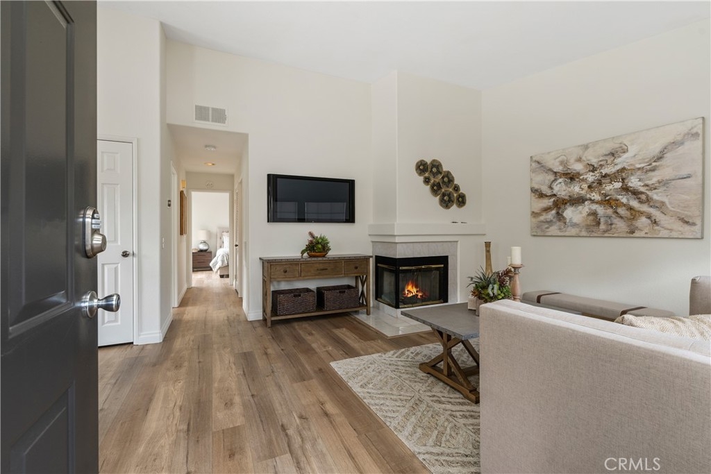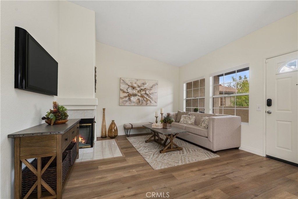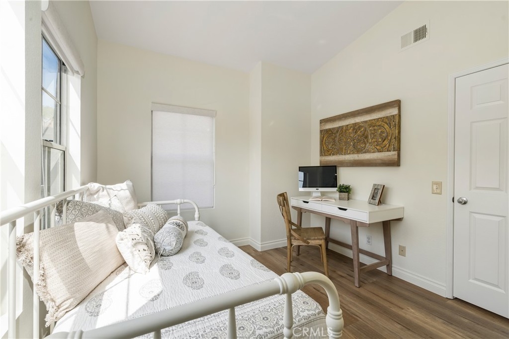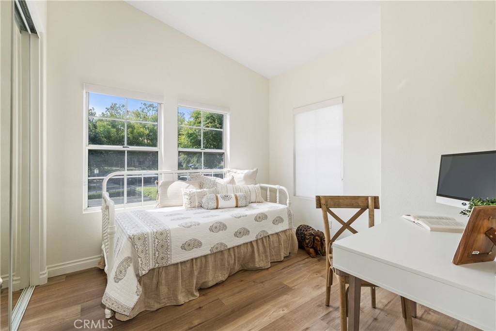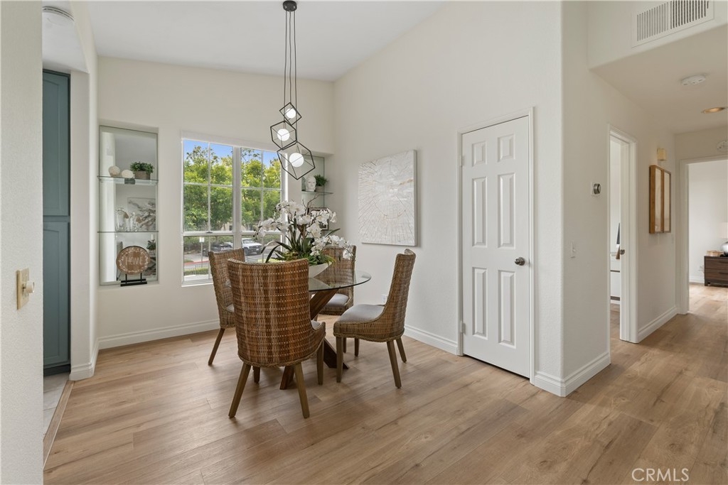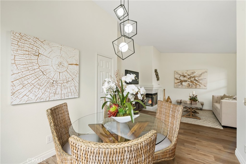 Welcome to this charming upper-level unit located in the Tijeras Creek community. With only one shared wall and no one above or below. As you approach the property, you'll be greeted by a welcoming front porch, creating a warm and inviting entrance. Upon entering, you'll be greeted by an abundance of natural light that fills the space, accentuated by the vaulted ceilings. The living room, adorned with a cozy fireplace, sets the tone for comfort and relaxation. The kitchen seamlessly connects to the dining area, creating an open-concept layout. In the hallway, a stackable laundry closet provides added convenience. Further down the hall, the master bedroom offers sliding doors to a private balcony and is complete with en-suite bathroom. The interior has been recently upgraded with a fresh coat of paint. The bathrooms have also been enhanced with new vanities, faucets, and toilets, while the kitchen features a new sink and garbage disposal. Windows have blinds. The garage has been equipped with new wall shelves for additional storage and organization. Tijeras Creek Villas offers exceptional amenities, including two association pools, two hot tubs, fitness room, sauna, playgrounds, and BBQ areas. The SAMLARC master association also provides access to additional amenities such as the lake, beach lagoon, pools, various sports fields and courts, picnic shelters, numerous parks, community events, and more! This home is located within the award-winning Arroyo Vista Elementary and Middle schools. The Tijeras Creek Villas community is surrounded by shopping and dining options. Schedule a viewing today and experience all that this community has to offer!