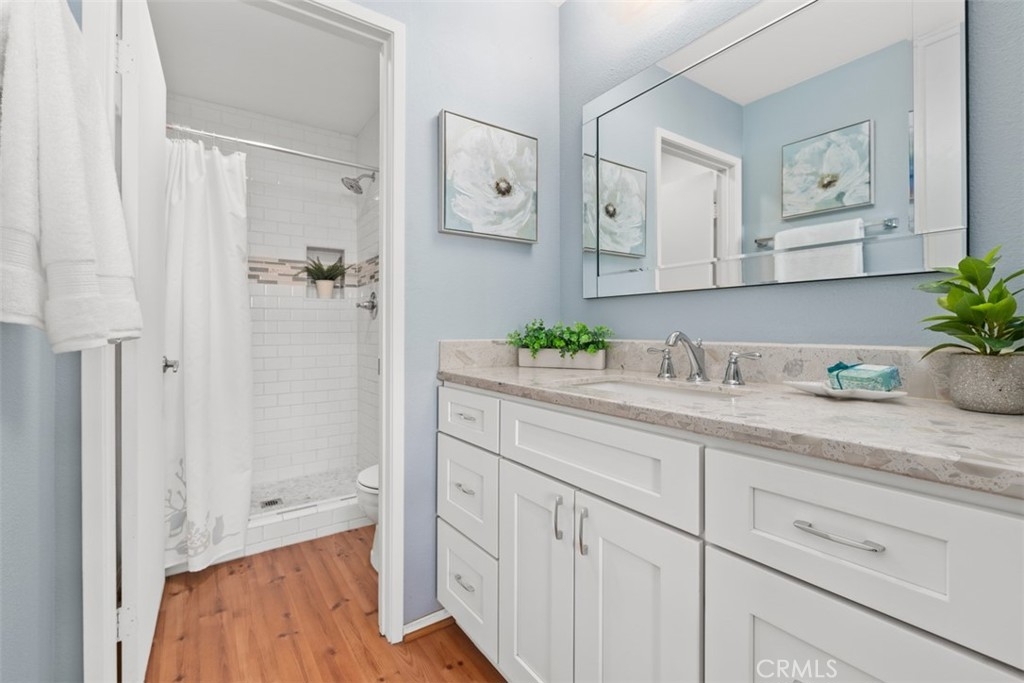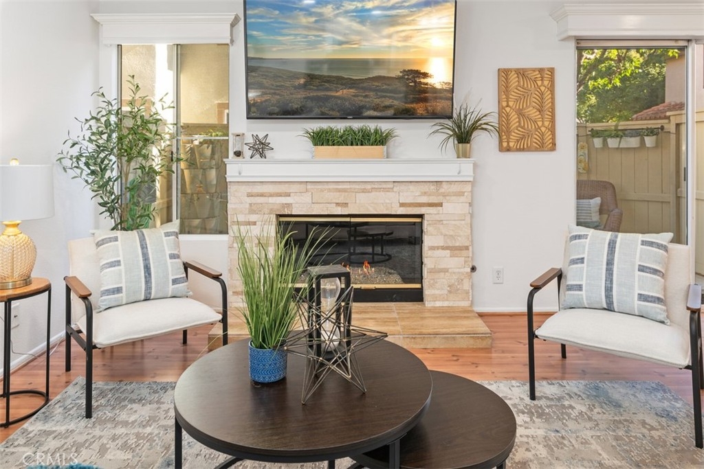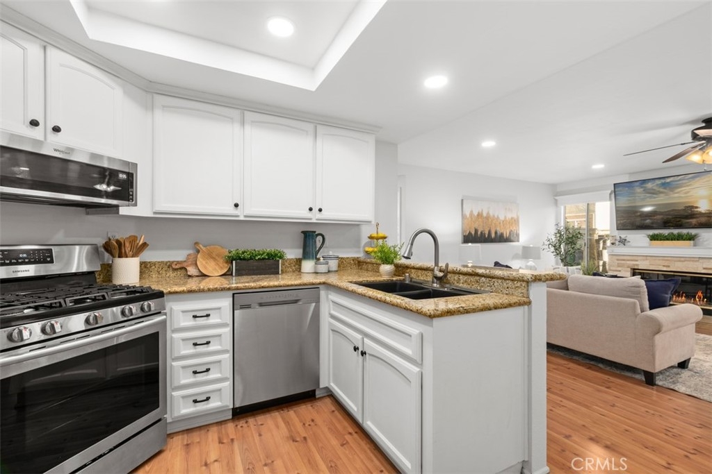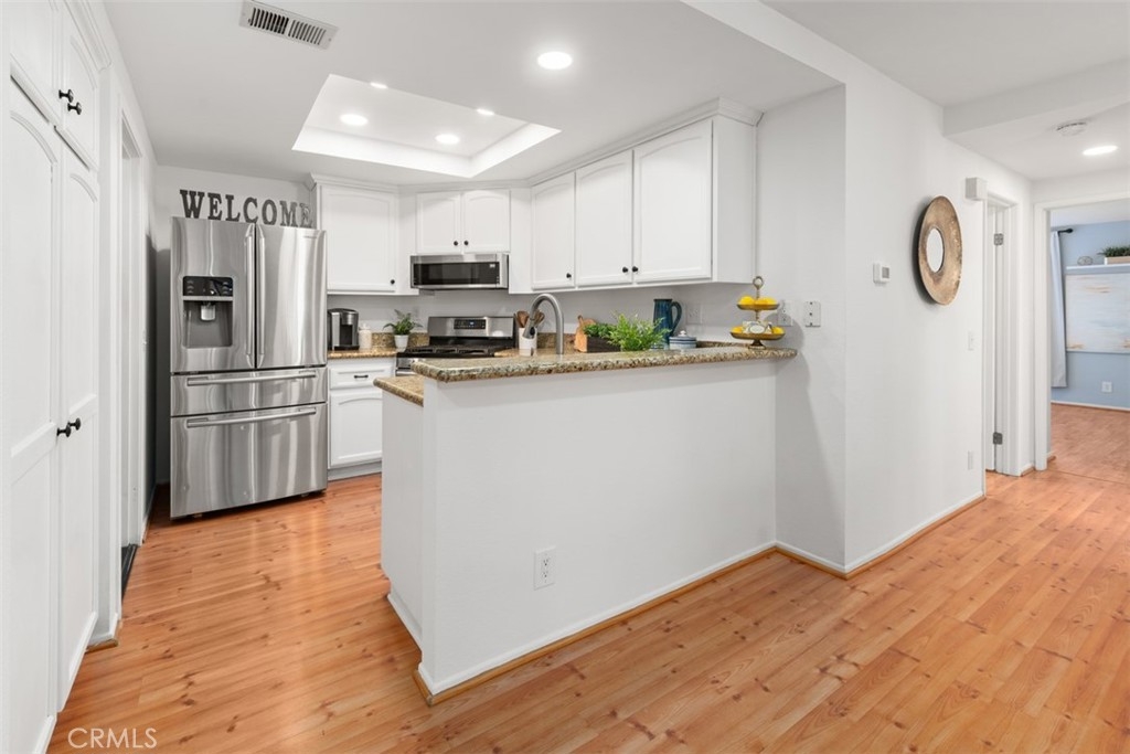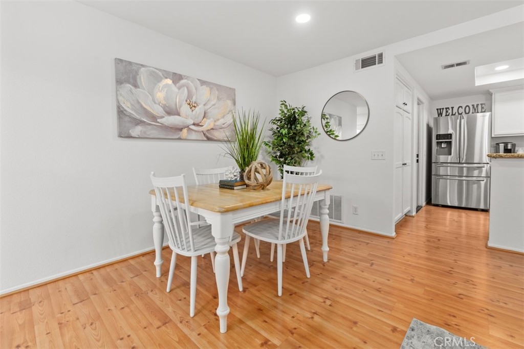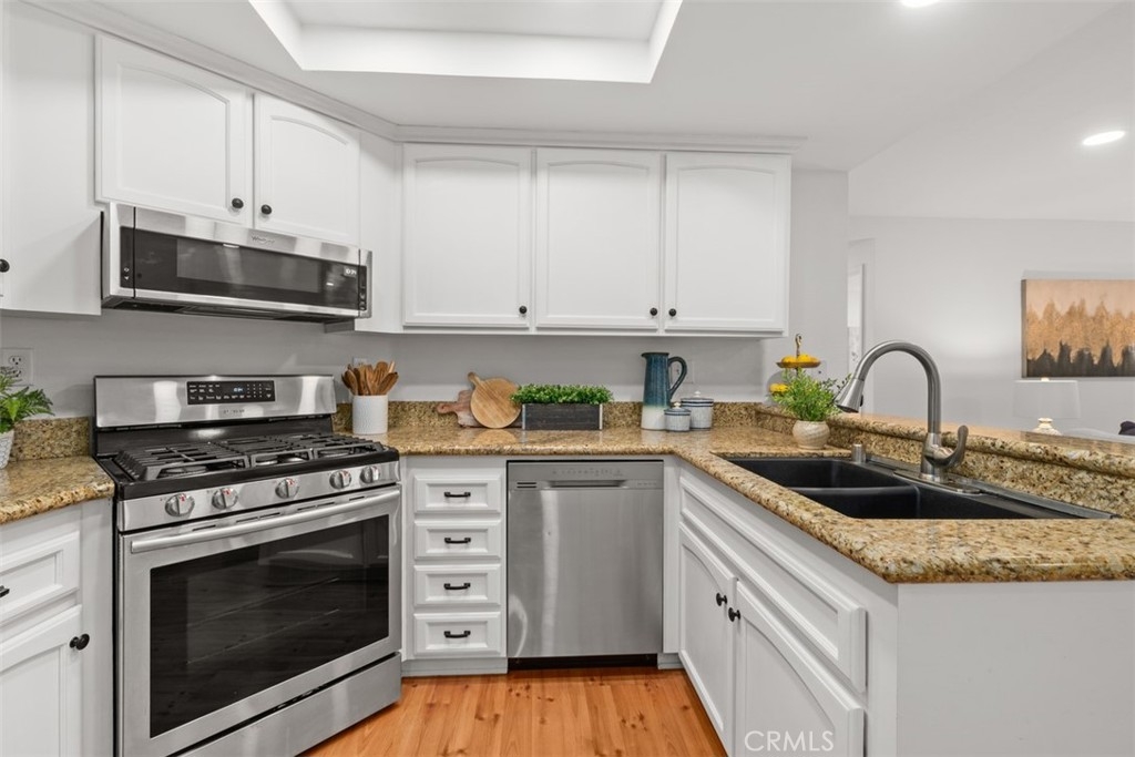 Absolutely ADORABLE 2 br, 2 full ba condo situated perfectly between the beautiful RSM Lake and Saddleback Mountains is located on the ground level with no steps. As a bonus...RSM is consistently considered one of the safest cities in CA! As you step inside you'll find a light and bright space with BRAND NEW luxury vinyl plank flooring and 6 inch baseboards throughout. NO Carpet! The open concept space includes scraped ceilings with added can lights, a large kitchen with lots of storage, white painted cabinets, stainless steel appliances, granite counters, granite composite sink, large pantry, breakfast bar, and open to the dining area and living room with a cozy fireplace which has updated stonework and mantel. Down the hall is a full bath with tub/shower and newer vanity, mirror, and display shelving. The Main Bedroom has a beautiful accent wall feature behind the bed and also has a walk-in closet with cabinets and built ins PLUS an extra closet which is currently being used as an office area. The en-suite bathroom has been beautifully updated with a new vanity and custom tiled walk in shower! The Secondary Bedroom has a double door entry, mirrored closet and organizers and is perfect for either a work from home office, kids room, or guest bedroom. Other features of the home are living room sliders leading to the intimate outdoor space with newer poured slab, laundry area just off the kitchen which leads to the direct access 1 car garage with added overhead storage, and solid surface flooring throughout...only carpet would be in the master closet areas. A short walk across the street to enjoy RSM Lake and Beach Club, Shopping and Restaurants, Hiking Trails in O'Neil Park, and Award Winning Trabuco Mesa Elementary. Just steps away is the community pool and spa which is undergoing a complete renovation, and enjoy one of RSM's many pools, parks, community center, movie theater, and sports courts! Oh, and FHA approved and NO Mello Roos! Perfect place to call HOME!!!
