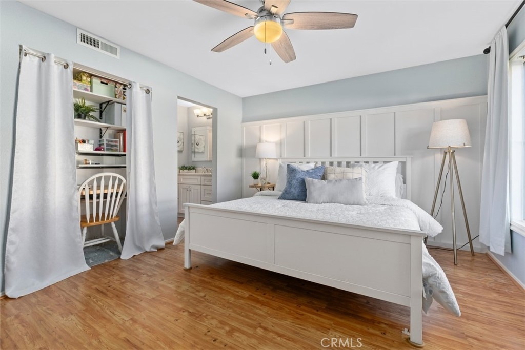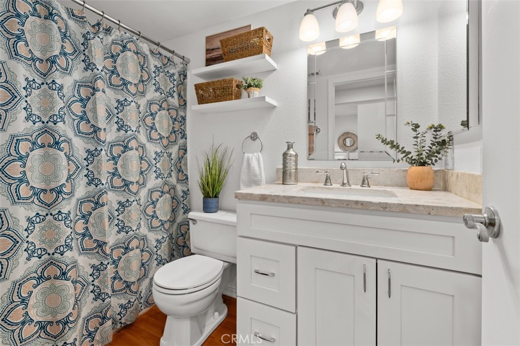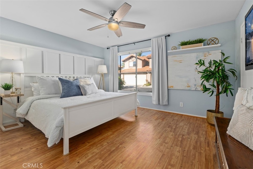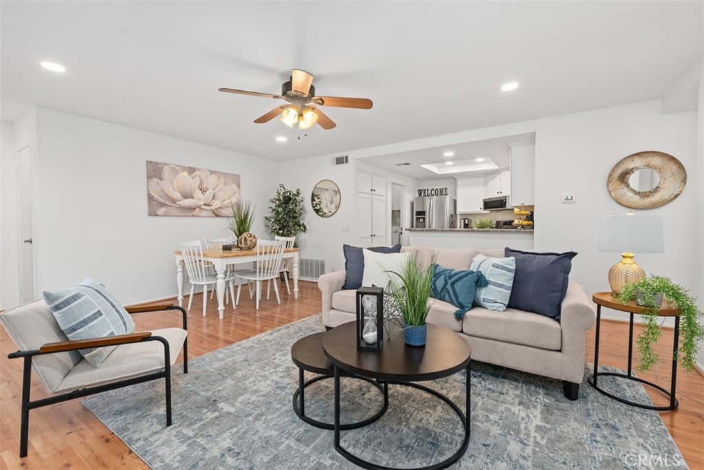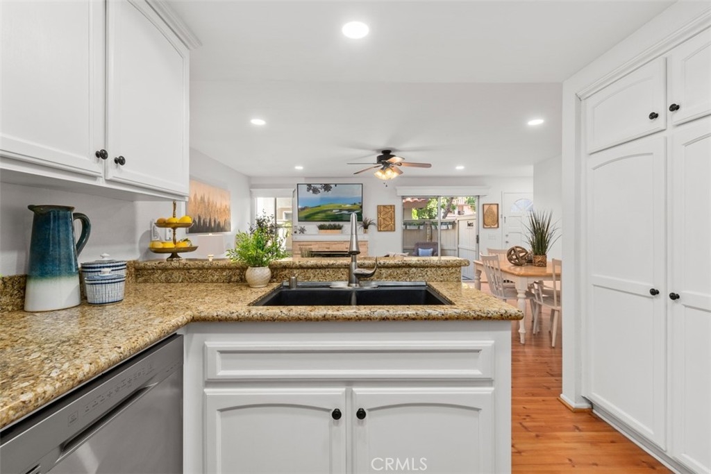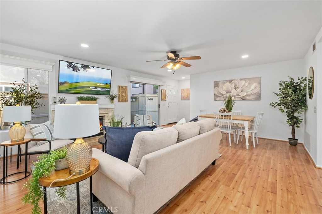 Absolutely ADORABLE 2 br, 2 full ba condo situated perfectly between the beautiful RSM Lake and Saddleback Mountains is located on the ground level with no steps. As a bonus...RSM is consistently considered one of the safest cities in CA! As you step inside you'll find a light and bright space with BRAND NEW luxury vinyl plank flooring and 6 inch baseboards throughout. NO Carpet! The open concept space includes scraped ceilings with added can lights, a large kitchen with lots of storage, white painted cabinets, stainless steel appliances, granite counters, granite composite sink, large pantry, breakfast bar, and open to the dining area and living room with a cozy fireplace which has updated stonework and mantel. Down the hall is a full bath with tub/shower and newer vanity, mirror, and display shelving. The Main Bedroom has a beautiful accent wall feature behind the bed and also has a walk-in closet with cabinets and built ins PLUS an extra closet which is currently being used as an office area. The en-suite bathroom has been beautifully updated with a new vanity and custom tiled walk in shower! The Secondary Bedroom has a double door entry, mirrored closet and organizers and is perfect for either a work from home office, kids room, or guest bedroom. Other features of the home are living room sliders leading to the intimate outdoor space with newer poured slab, laundry area just off the kitchen which leads to the direct access 1 car garage with added overhead storage, and solid surface flooring throughout...only carpet would be in the master closet areas. A short walk across the street to enjoy RSM Lake and Beach Club, Shopping and Restaurants, Hiking Trails in O'Neil Park, and Award Winning Trabuco Mesa Elementary. Just steps away is the community pool and spa which is undergoing a complete renovation, and enjoy one of RSM's many pools, parks, community center, movie theater, and sports courts! Oh, and FHA approved and NO Mello Roos! Perfect place to call HOME!!!